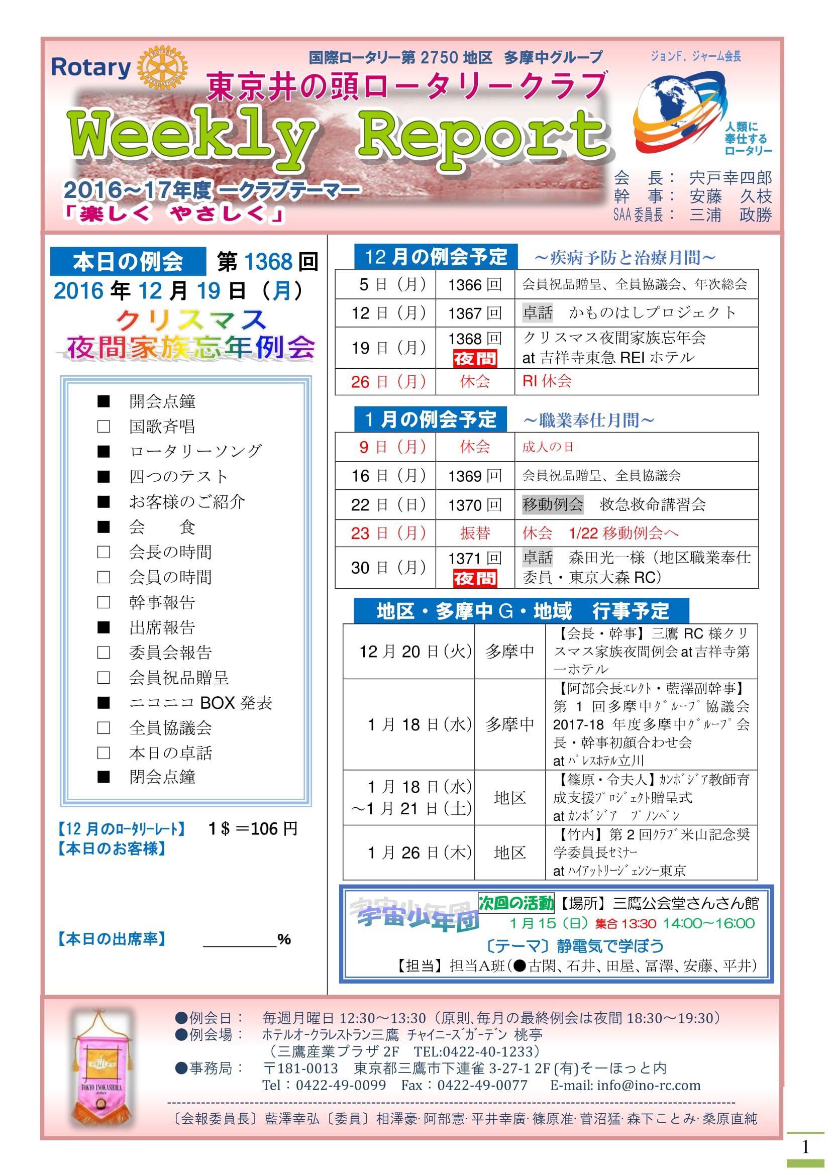 会長挨拶・例会のご案内・スケジュール等