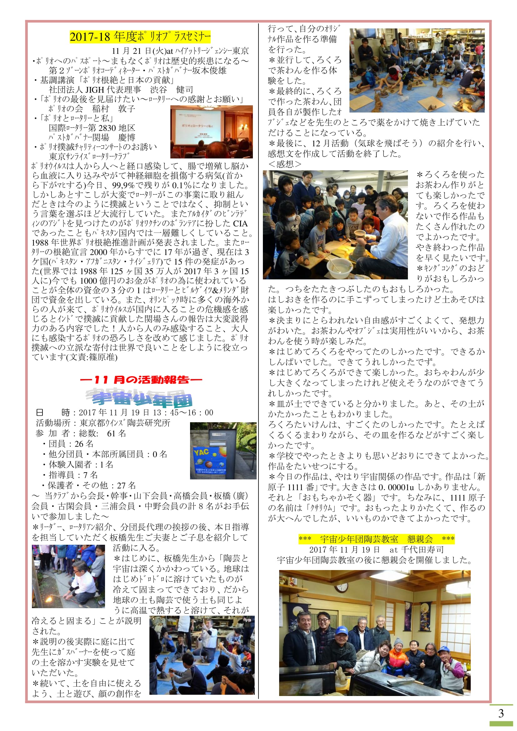 2017年11月27日発行(米山記念奨学生卓話&サイエンスキッズ陶芸)