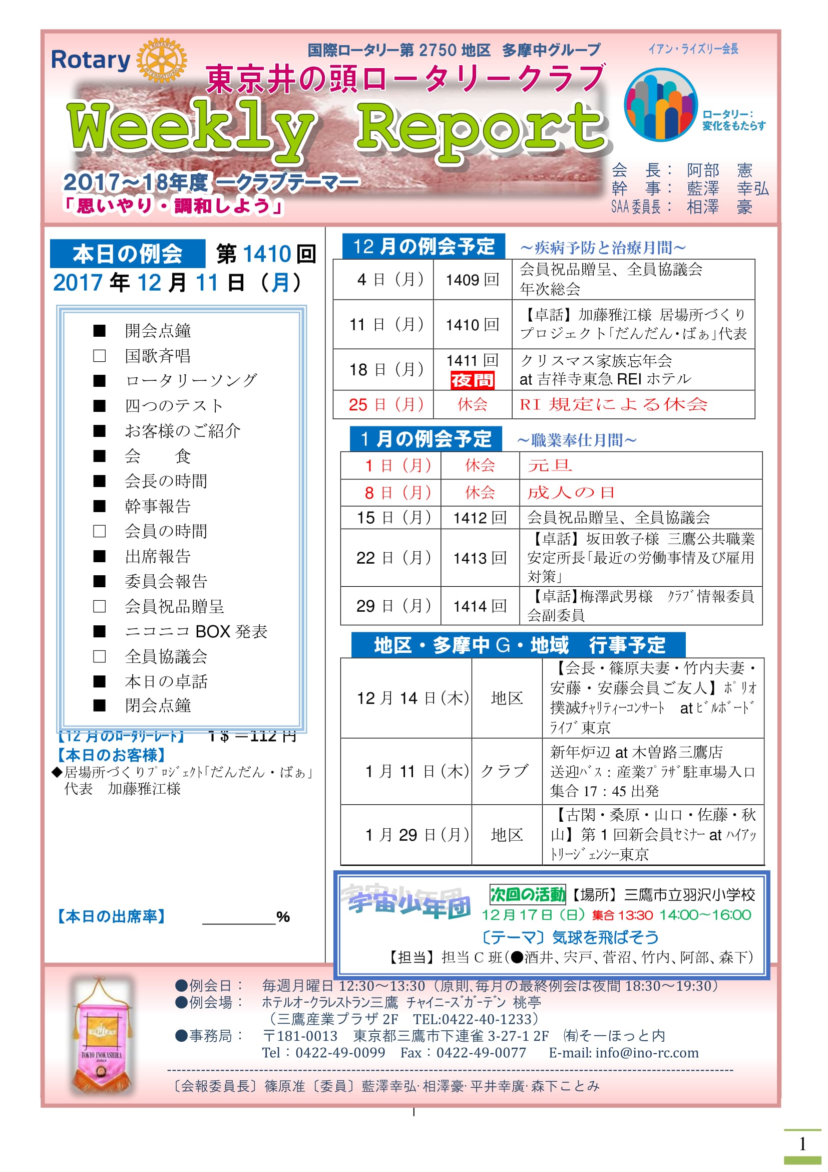 2017年12月18日発行(卓話:居場所づくりプロジェクト だんだん・ばぁ代表加藤雅江様)