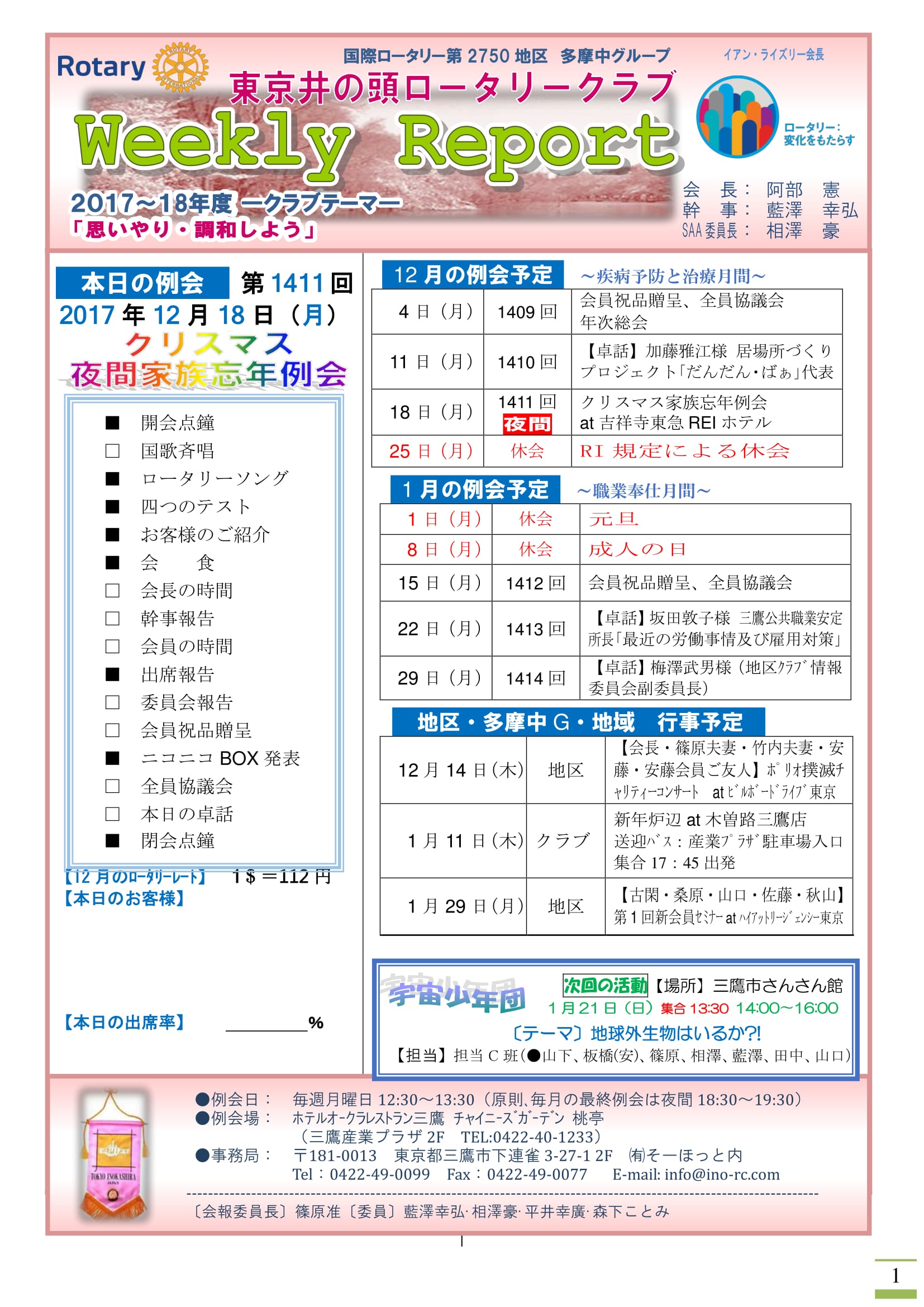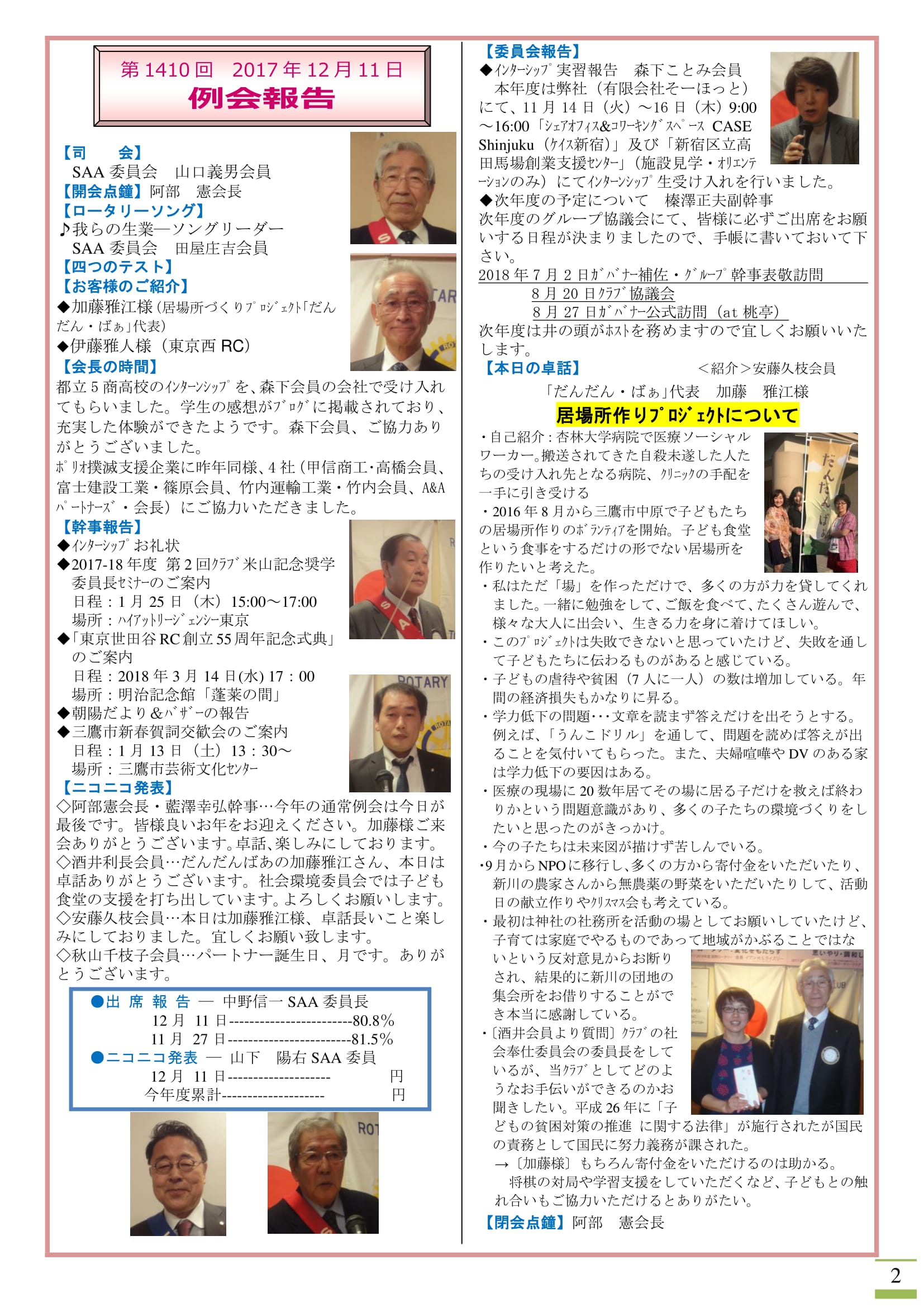 2017年12月18日発行(卓話:居場所づくりプロジェクト だんだん・ばぁ代表加藤雅江様)