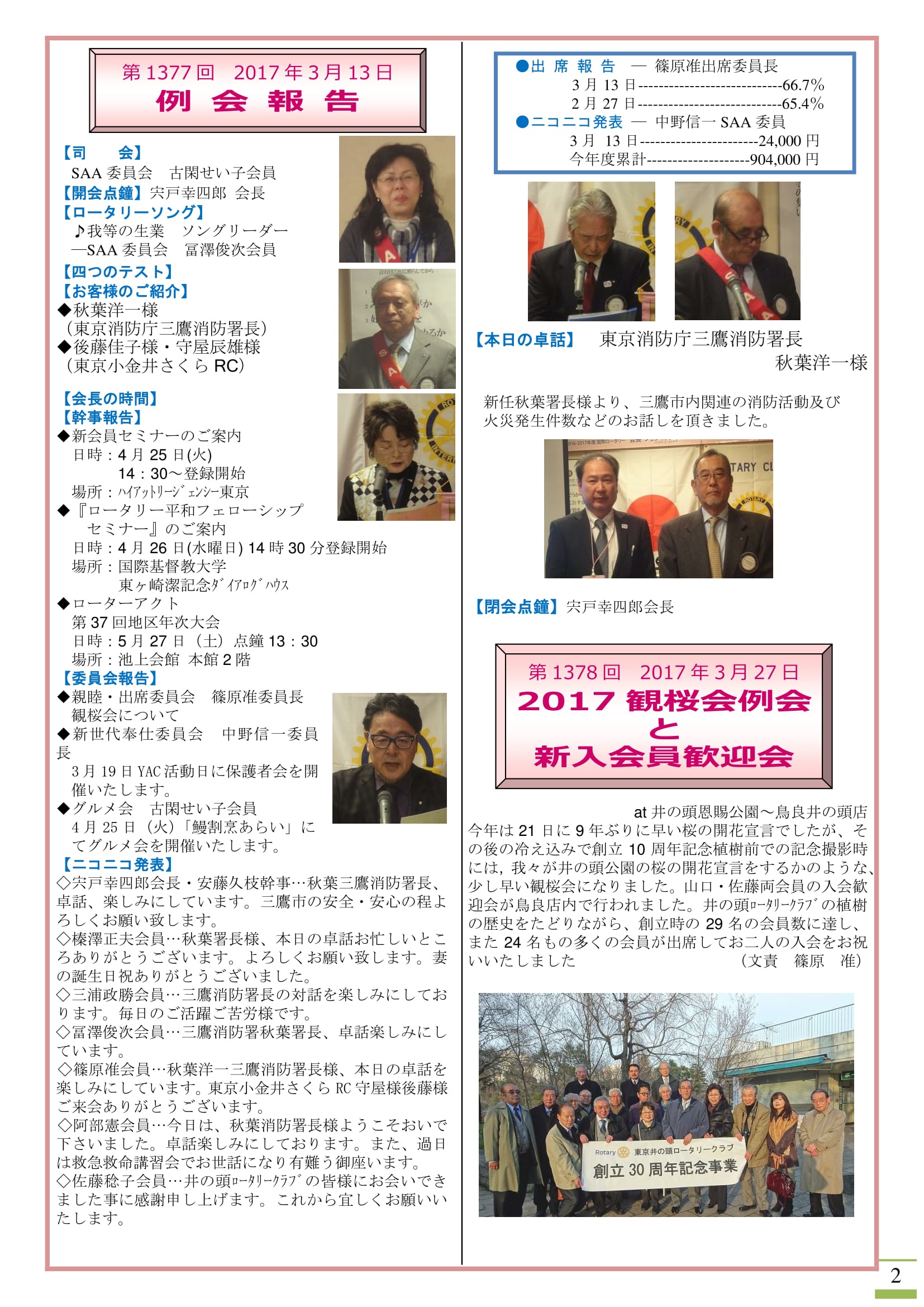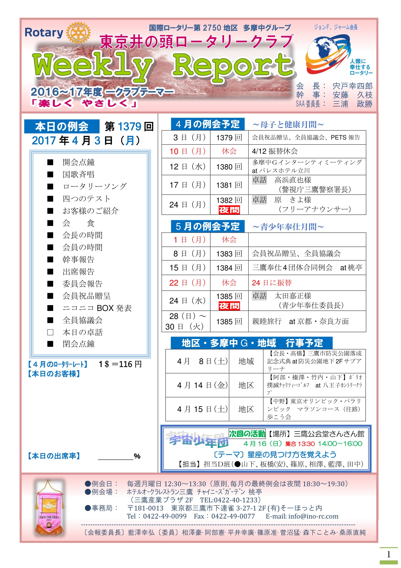 会長挨拶・例会のご案内・スケジュール等