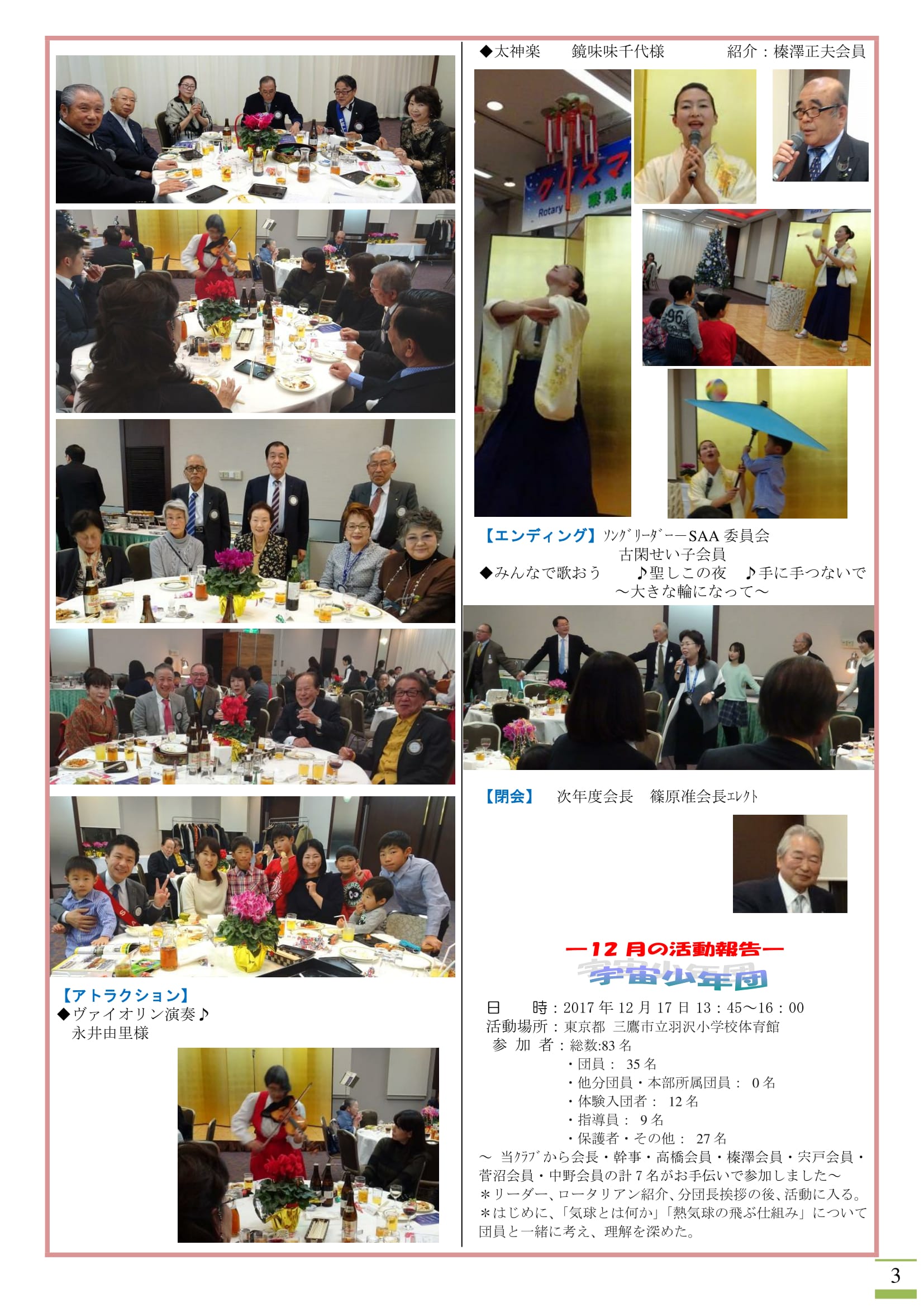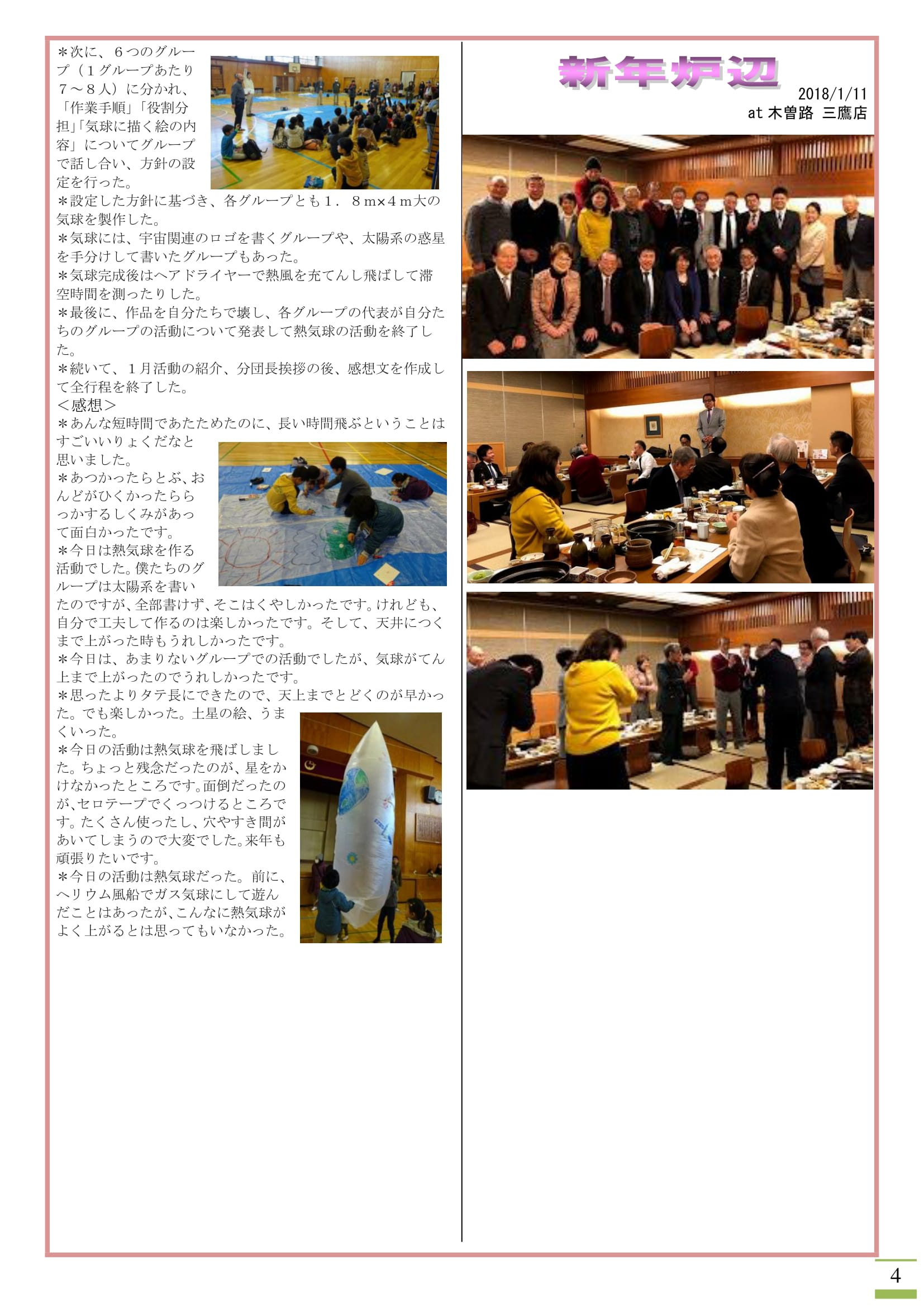 2018年1月15日発行(クリスマス家族忘年例会&宇宙少年団サイエンスキッズみたか 熱気球を飛ばそう&新年炉辺)