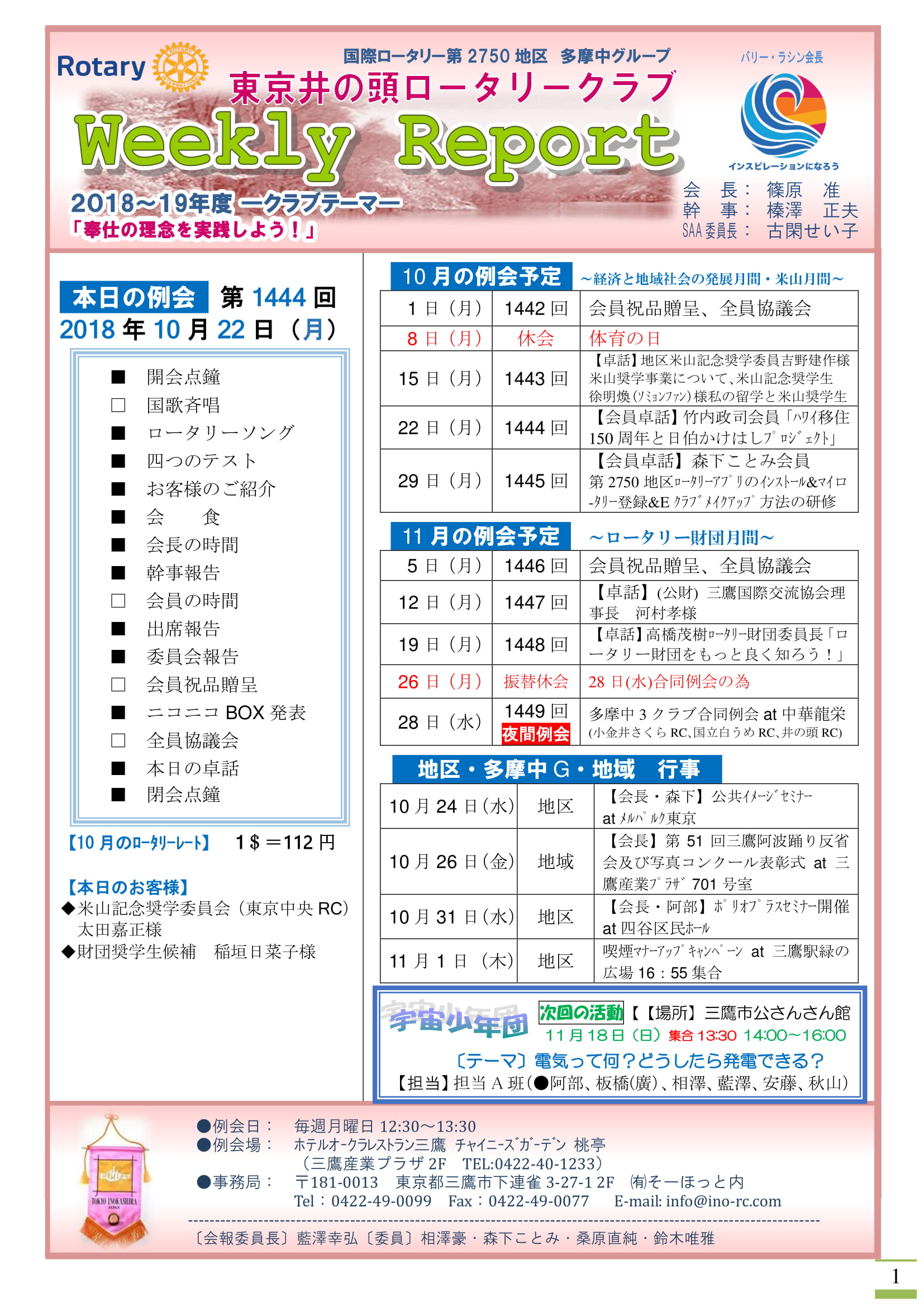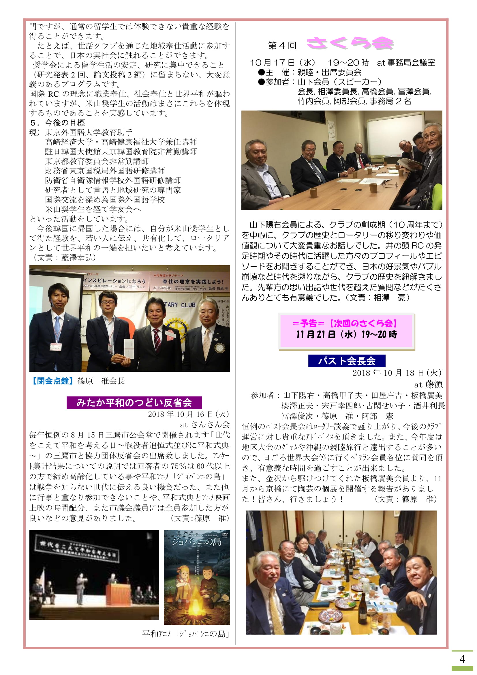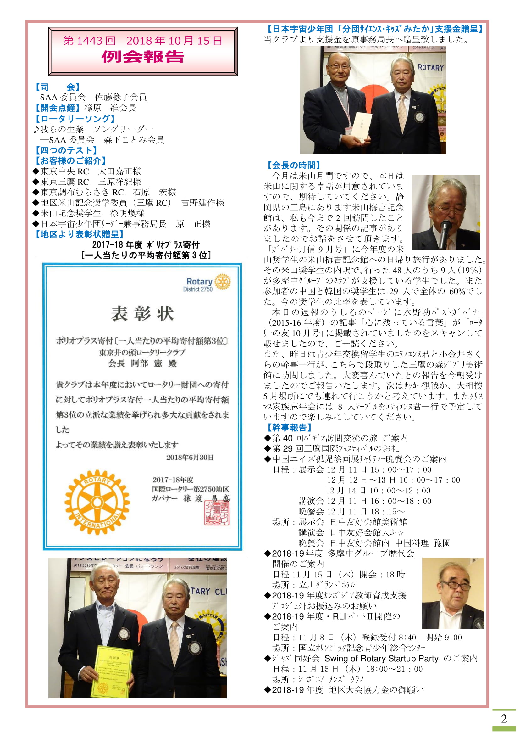 • 2018年10月22日発行(2017-18年度 ポリオプラス寄付表彰状&日本宇宙少年団「分団サイエンス・キッズみたか」支援金贈呈&米山奨学生卓話&みたか平和のつどい反省会&第4回さくら会&パスト会長会)