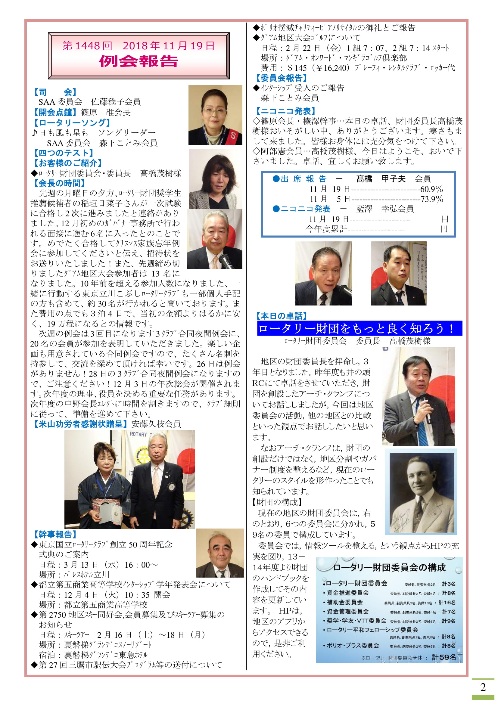2018年11月19日発行(卓話:MISHOP理事長河村孝様「明日のまち 「三鷹」を考える&インターンシップ受入活動&2018-19年度多摩中グループ歴代会&ロータリー財団について)
