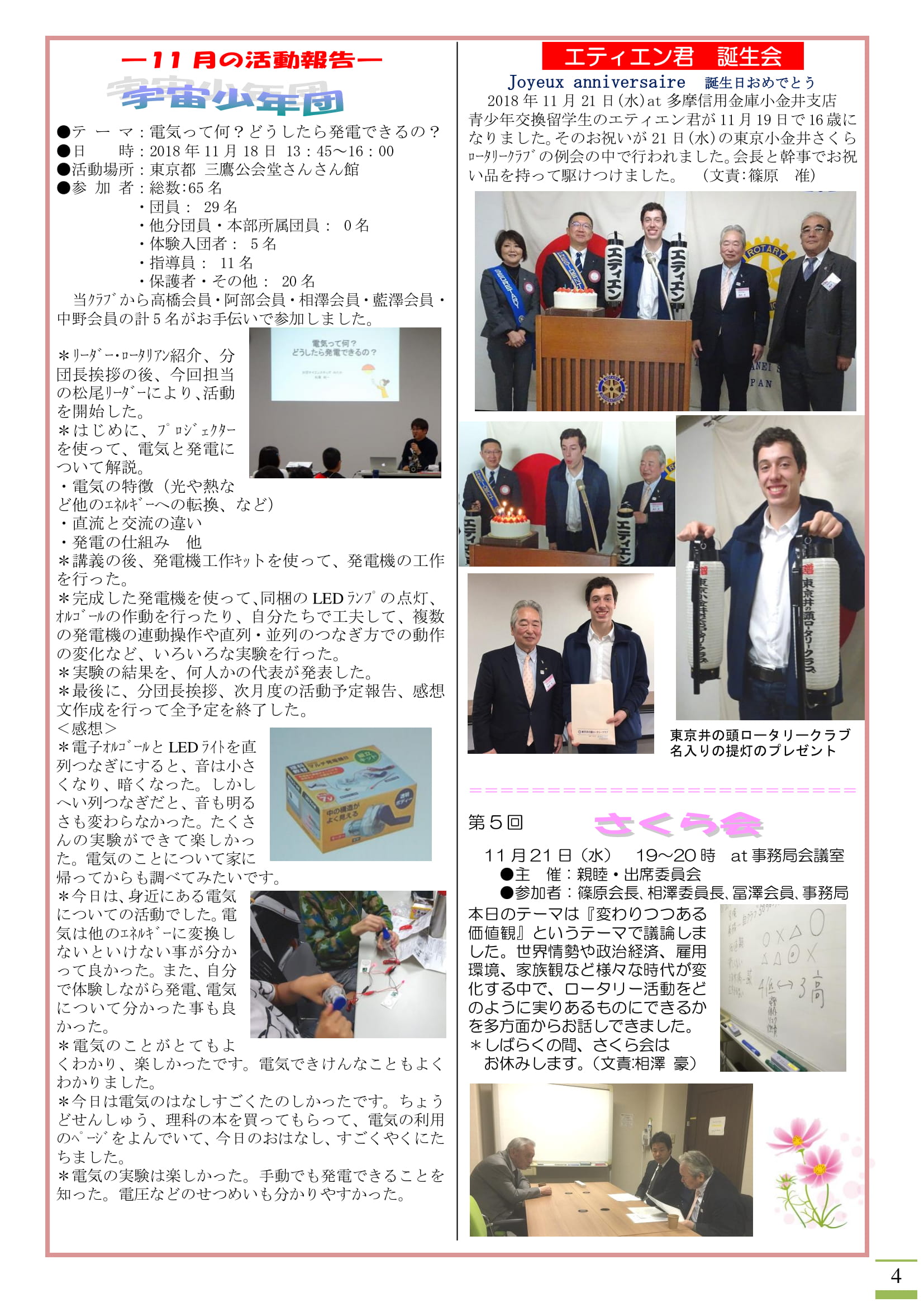 2018年11月28日発刊(卓話:高橋茂樹ロータリー財団委委員長「ロータリー財団をもっと良く知ろう!」&日本宇宙少年団分団サイエンスキッズみたか活動「電気って何?どうしたら発電できるの?」&エティエン君誕生会&さくら会)