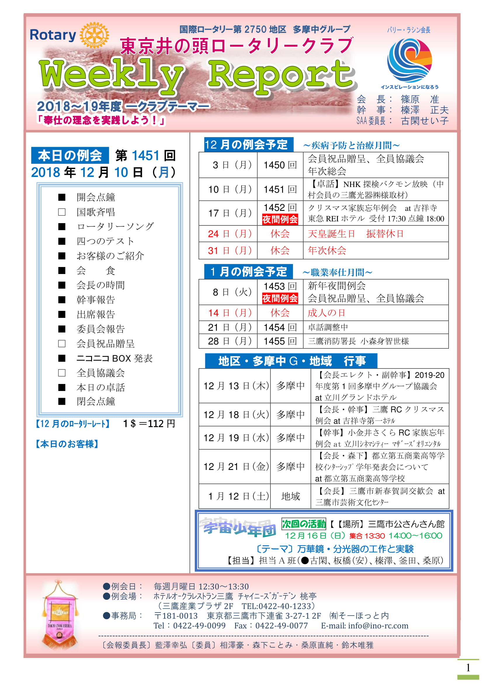 2018年12月3日発行(3クラブ合同例会:国立白うめRC、小金井さくらRC、井の頭RC&第1回クラブ代表者会議&第9回多摩中グループ協議会&「ロータリーデー」について:「落語を楽しむ会」)