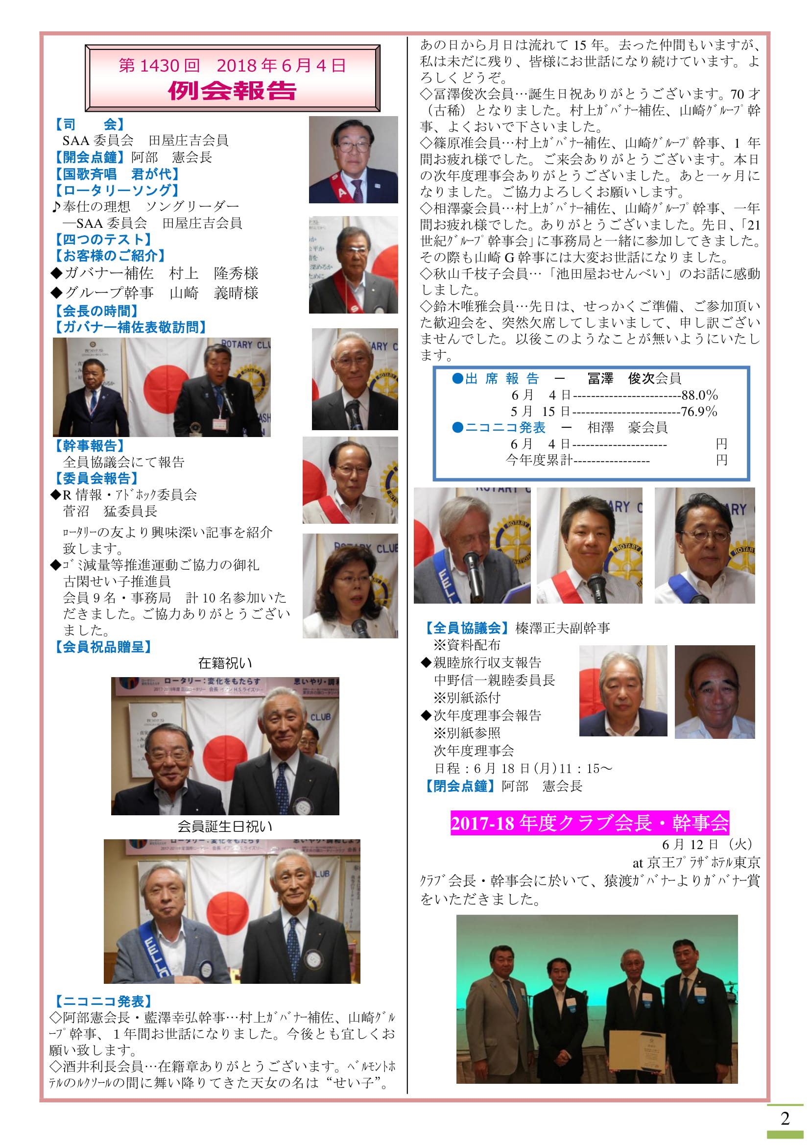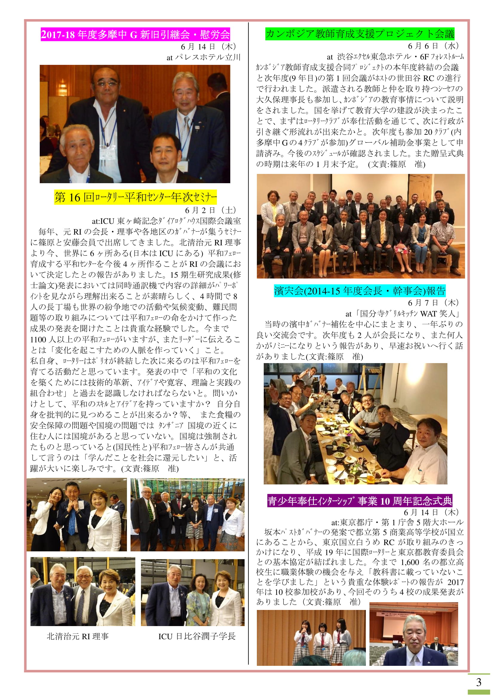 2018年6月18日発行(2017-18年-19年度多摩中G新旧引継会&ガバナー賞受賞&カンボジア教師育成支援プロジェクト会議))
