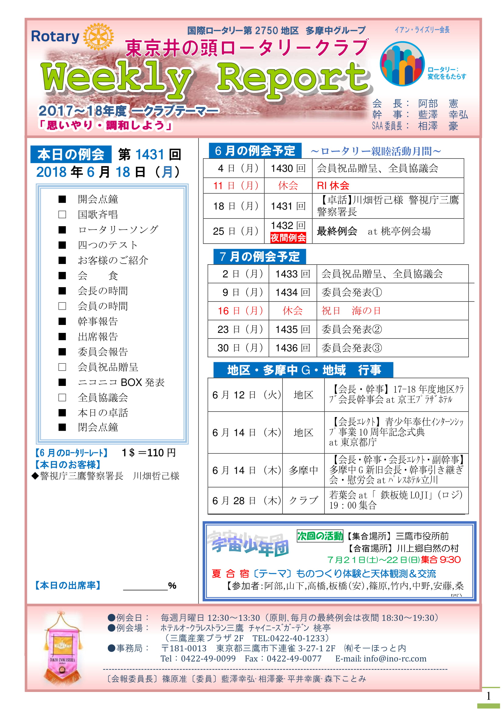 2018年6月4日発行(卓話:三鷹消防署長 秋葉洋一様&三鷹市ごみ減量推進運動参加)