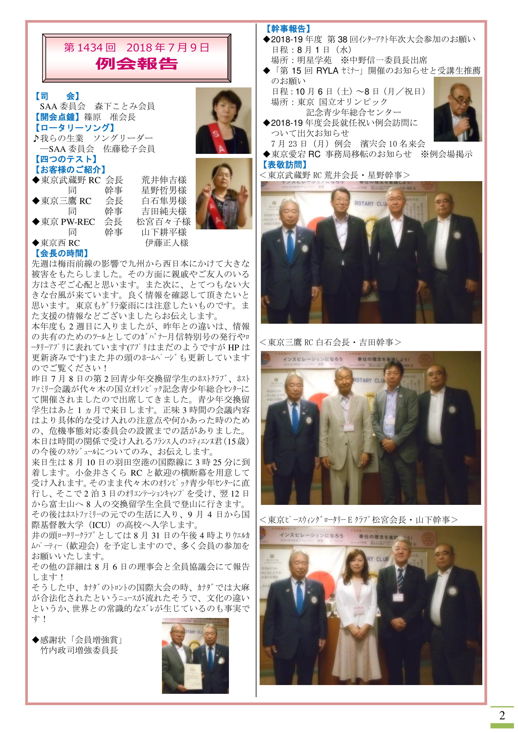 東京三鷹ロータリークラブ 白石隼男会長、吉田純夫幹事、