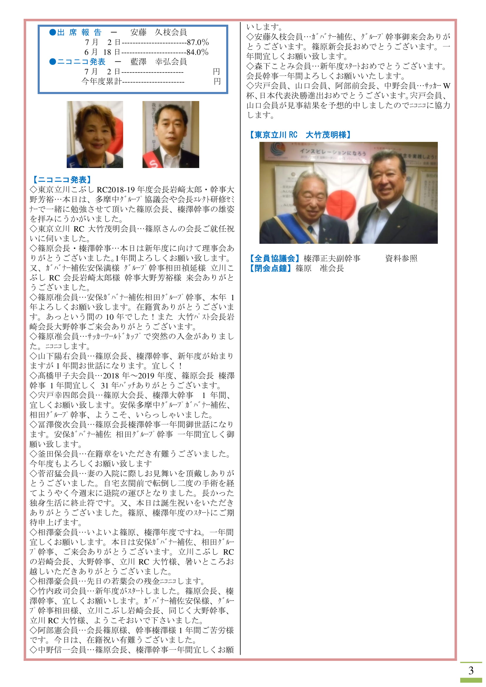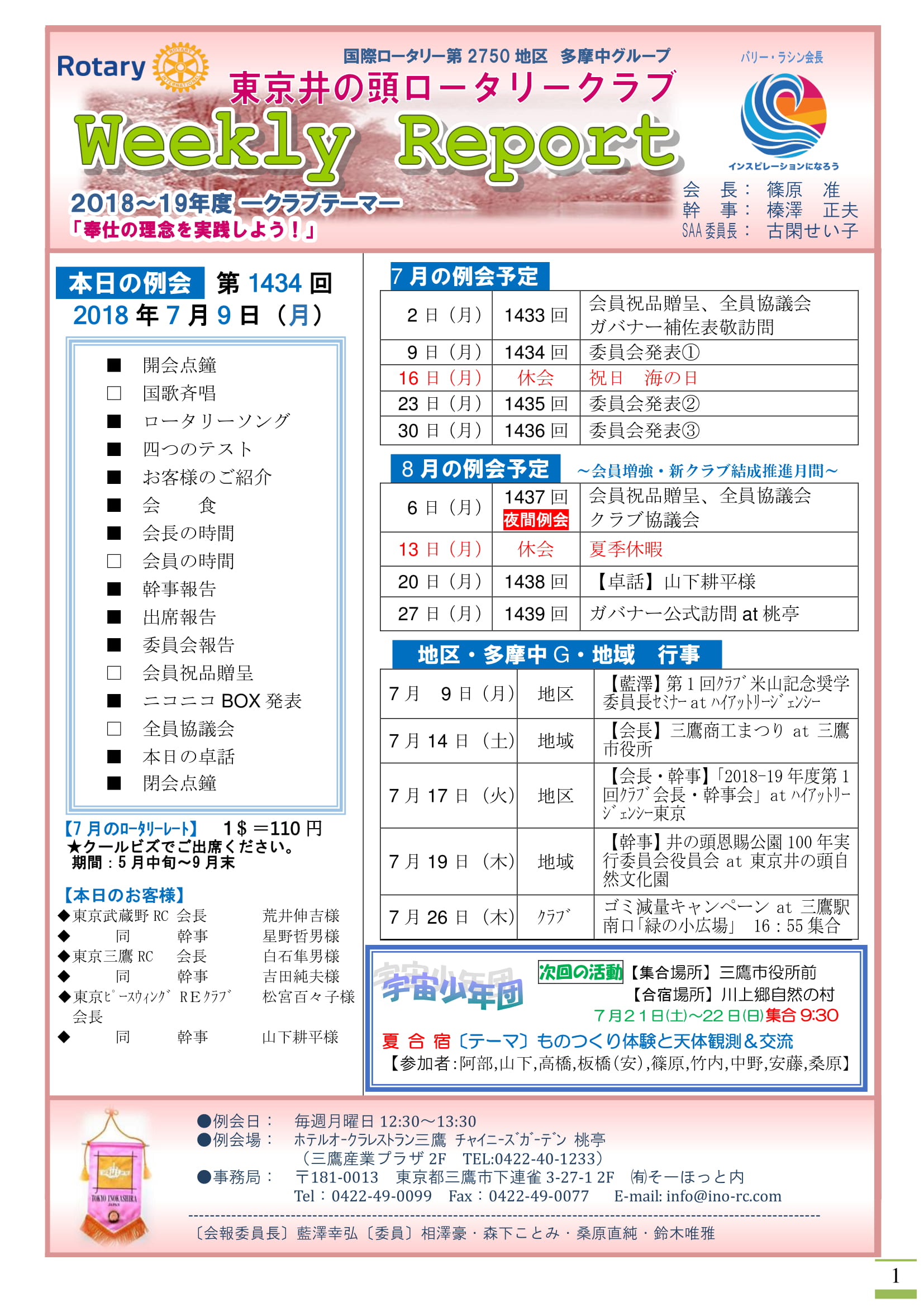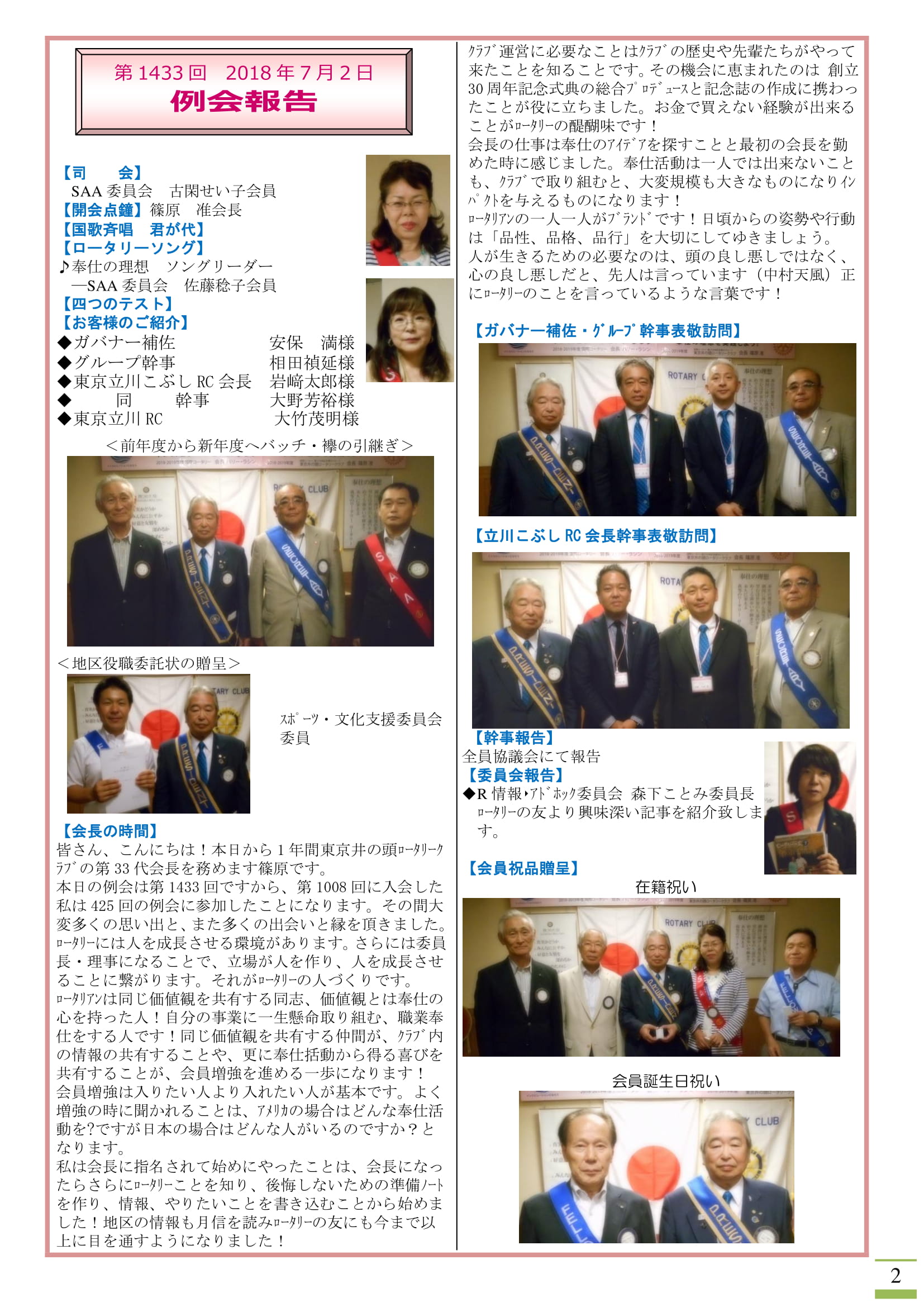 2018-19年度7月2日の最初の例会は、多摩中グループ ガバナー補佐及びグループ幹事そして東京立川こぶしRCの会長幹事にご来会いただきました。ありがとうございました。
