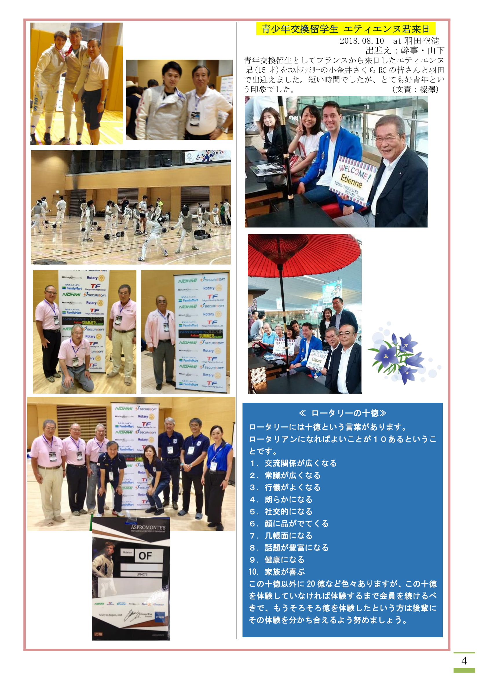 今号は盛りだくさんな週報となりました。安保ガバナー補佐及び相田グループ幹事にご来会頂いて開催されたクラブ協議会の模様。貴重な講評を頂きありがとうございました。イタリアと日本の金メダリストを招いて開催されたフェンシングサマーキャンプの模様。フランスより羽田に到着した青少年交換留学生 エティエンヌ君来日の模様。