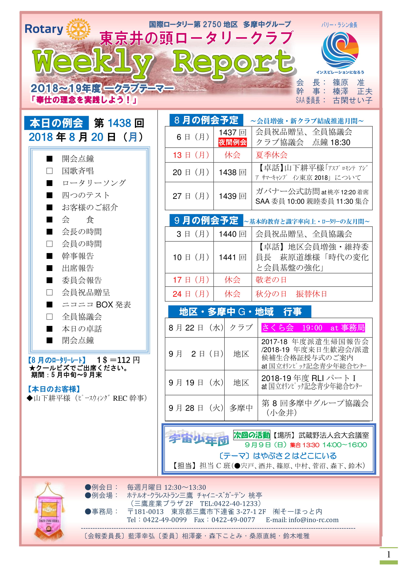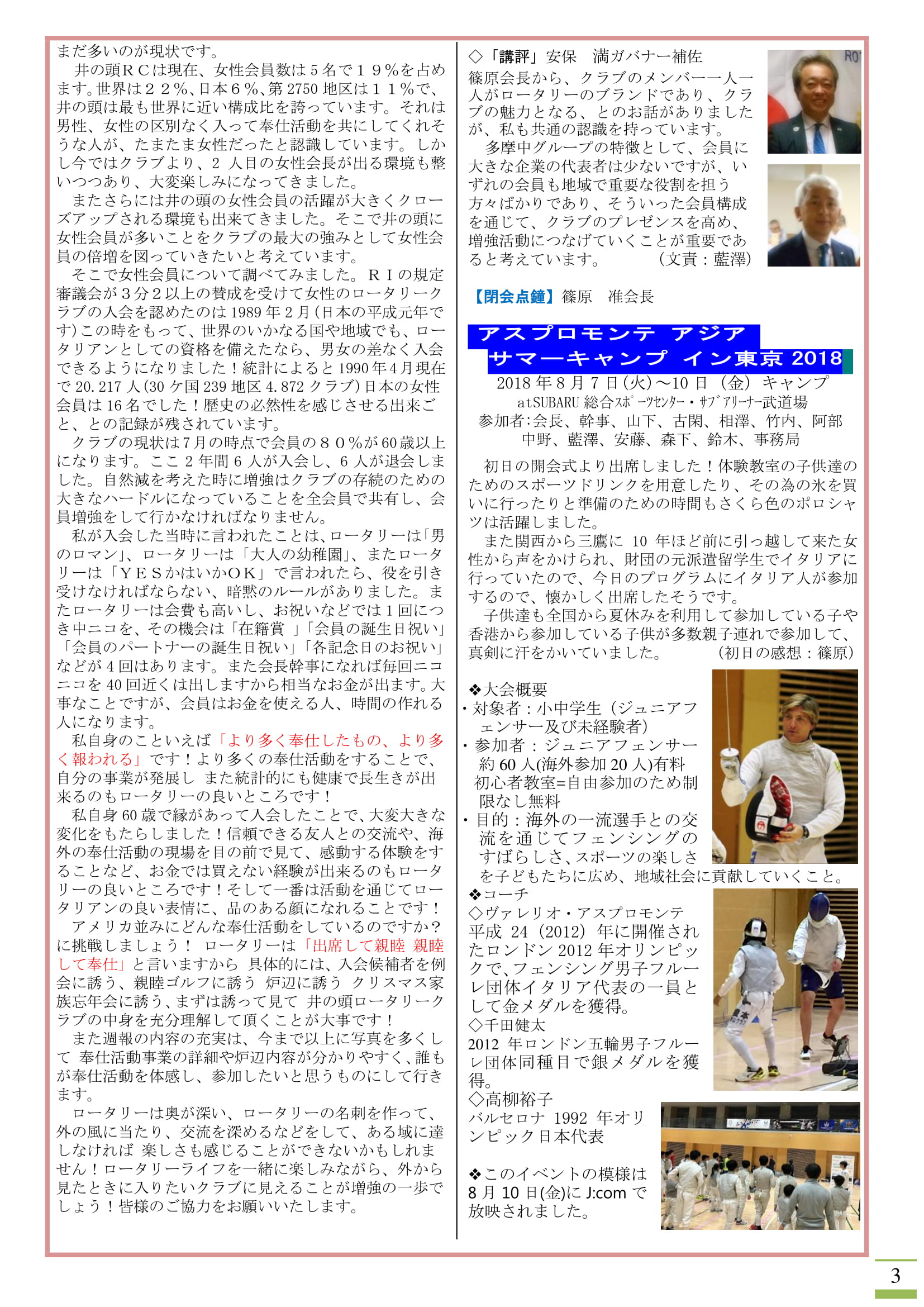 今号は盛りだくさんな週報となりました。安保ガバナー補佐及び相田グループ幹事にご来会頂いて開催されたクラブ協議会の模様。貴重な講評を頂きありがとうございました。イタリアと日本の金メダリストを招いて開催されたフェンシングサマーキャンプの模様。フランスより羽田に到着した青少年交換留学生 エティエンヌ君来日の模様。