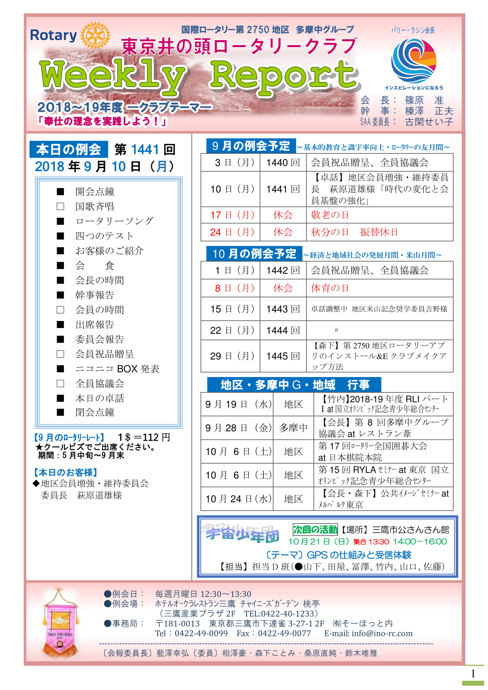 2018年10月1日発行(卓話:萩原道雄地区会員増強・維持委員長&新会員オリエンテーション&さくら会&日本宇宙少年団分団サイエンスキッズみたか活動「はやぶさ2は何処にいる?」&ロータリーの優先活動「奉仕部門、重点分野」) →