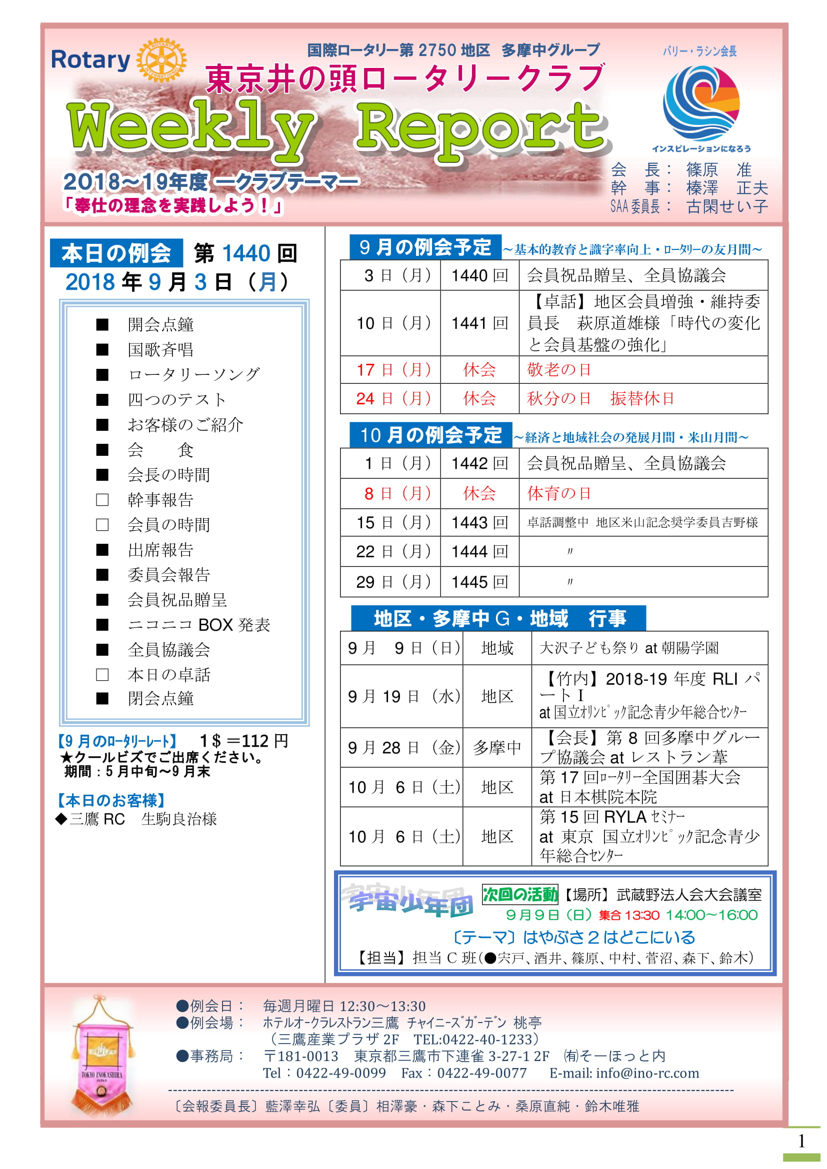 2018年8月27日発行(卓話:アスプロモンテ アジア サマーキャンプin東京実施報告&阿波踊り炉辺&宇宙少年団ペットボトルを作って飛ばそう&第2回さくら会)