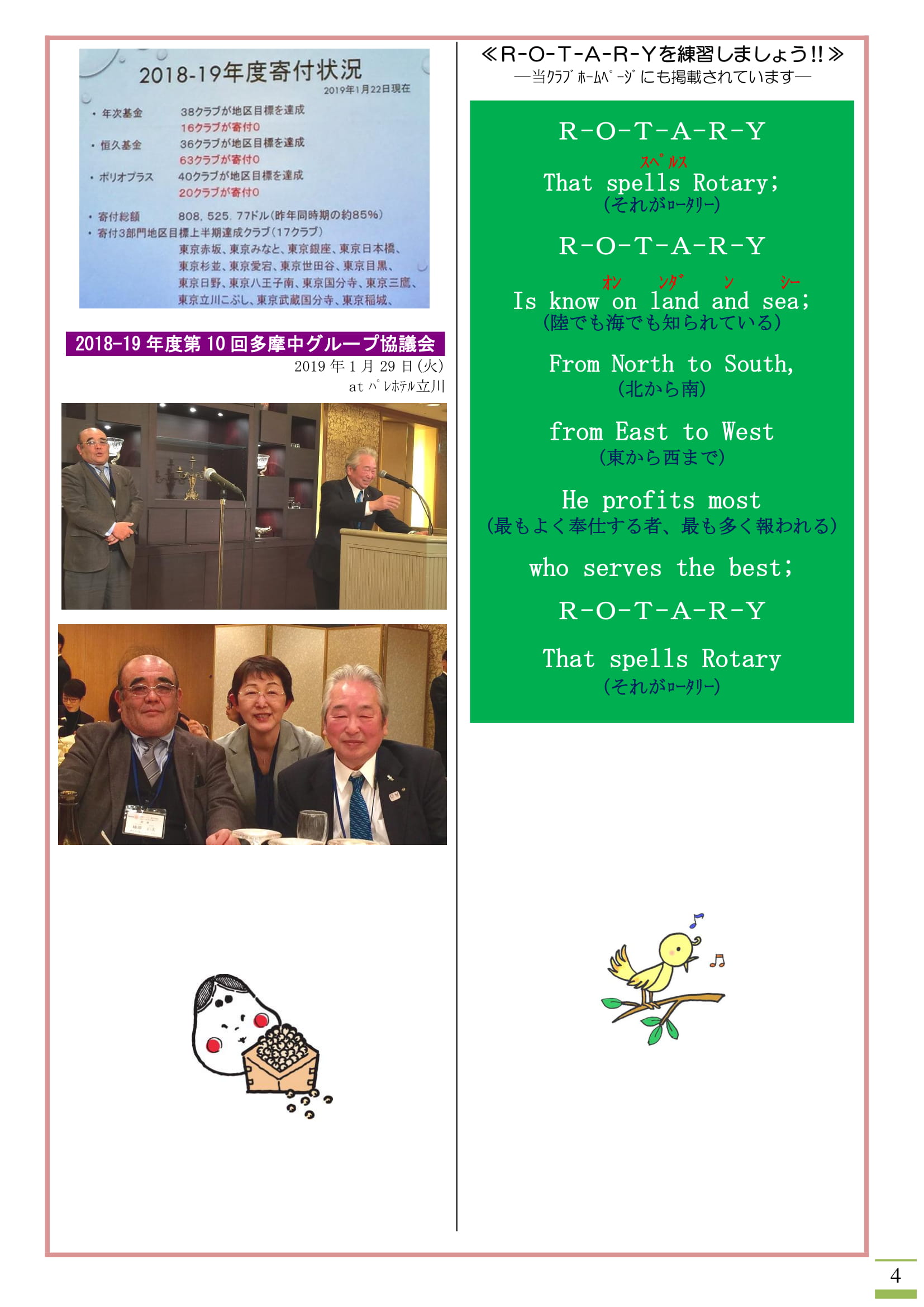 2019年2月18日発行(新入会員入会式&2019-20年度補助金管理セミナー&2019-20年度第2回多摩中グループ協議会&日本宇宙少年団 分団サイエンスキッズみたか事務局長 原正様送別会&原正様お礼のメール&ロータリーの十徳&ROTARY歌詞) →