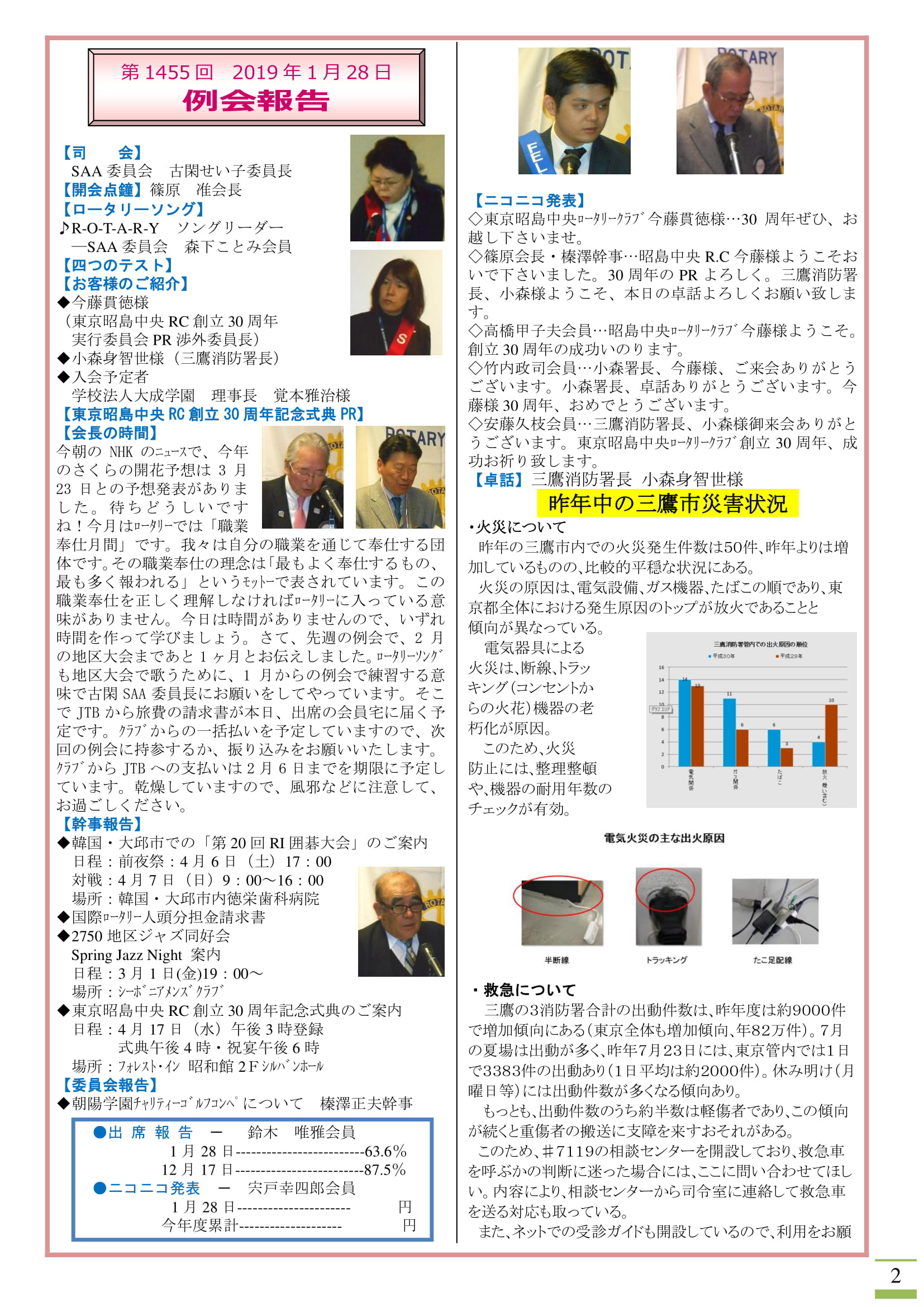 2019年2月4日発行(1月28日卓話:三鷹消防署長 小森身智世様 昨年中の三鷹市災害状況&第3回井の頭池かいぼり報告会&2018-19年度第2回クラブ会長・幹事会&2018-19年度第10回多摩中グループ協議会&ROTARYを練習しましょう‼)