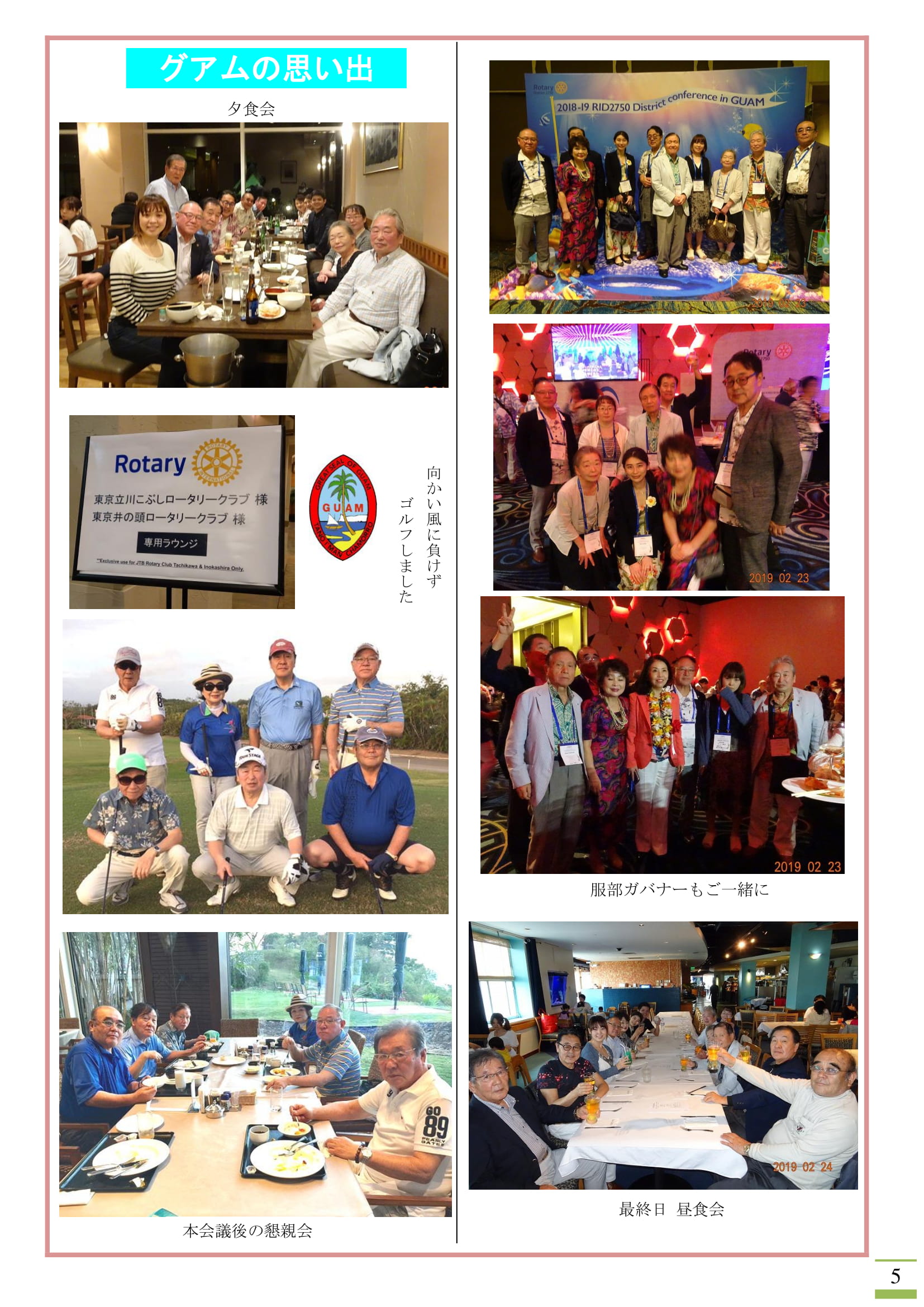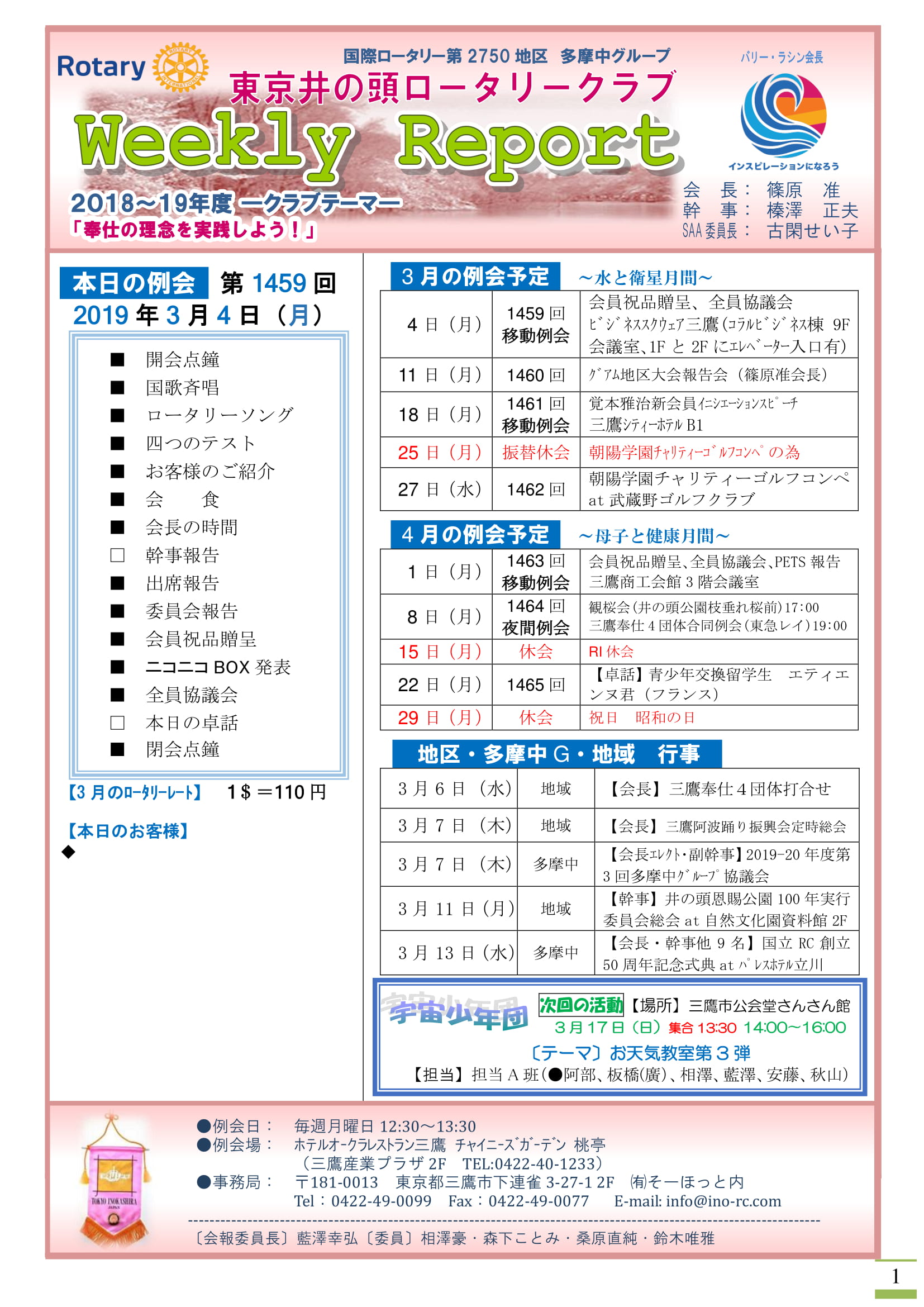 2019年2月18日発行(新入会員入会式&2019-20年度補助金管理セミナー&2019-20年度第2回多摩中グループ協議会&日本宇宙少年団 分団サイエンスキッズみたか事務局長 原正様送別会&原正様お礼のメール&ロータリーの十徳&ROTARY歌詞)