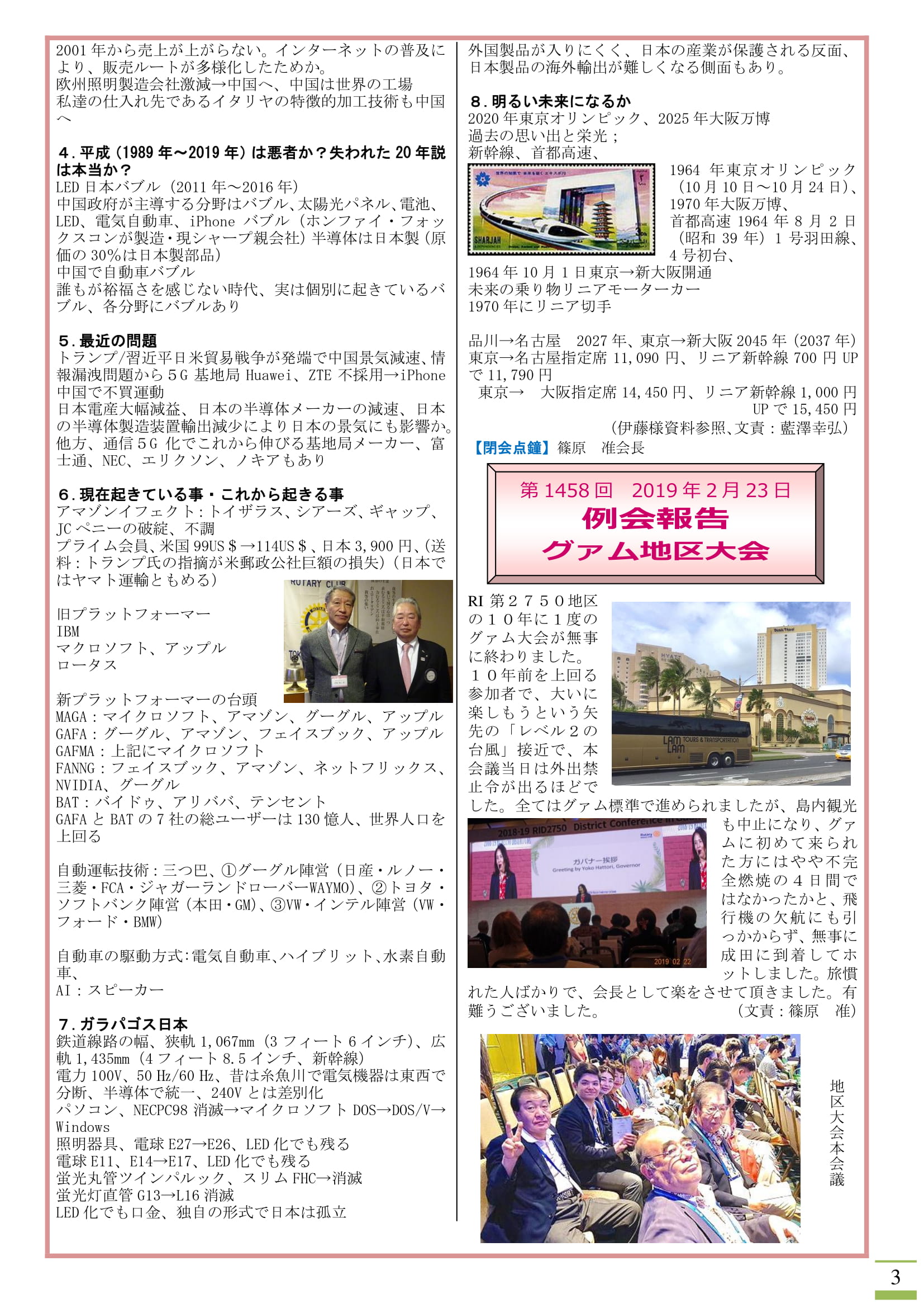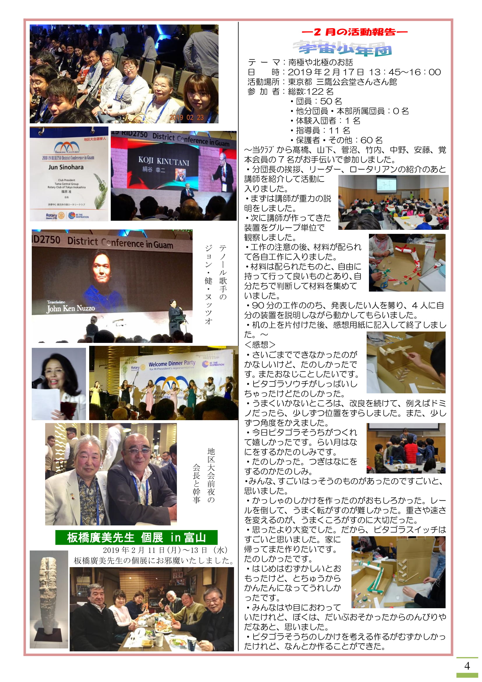 2019年3月4日発行(卓話:伊藤雅人様(東京西ロータリークラブ)「オーデリックの状況から感じる日本と世界の動向」&グアム地区大会の模様&日本宇宙少年団分団サイエンスキッズみたか活動「南極や北極のお話」)