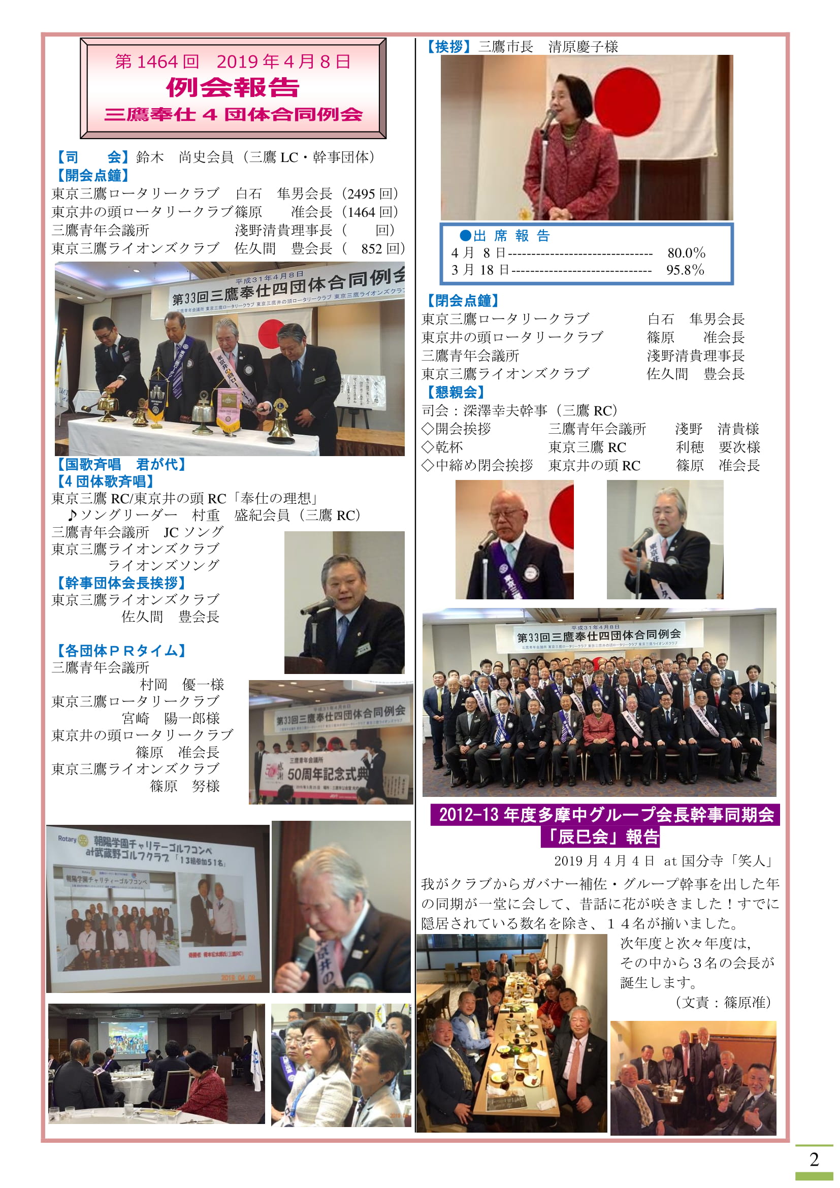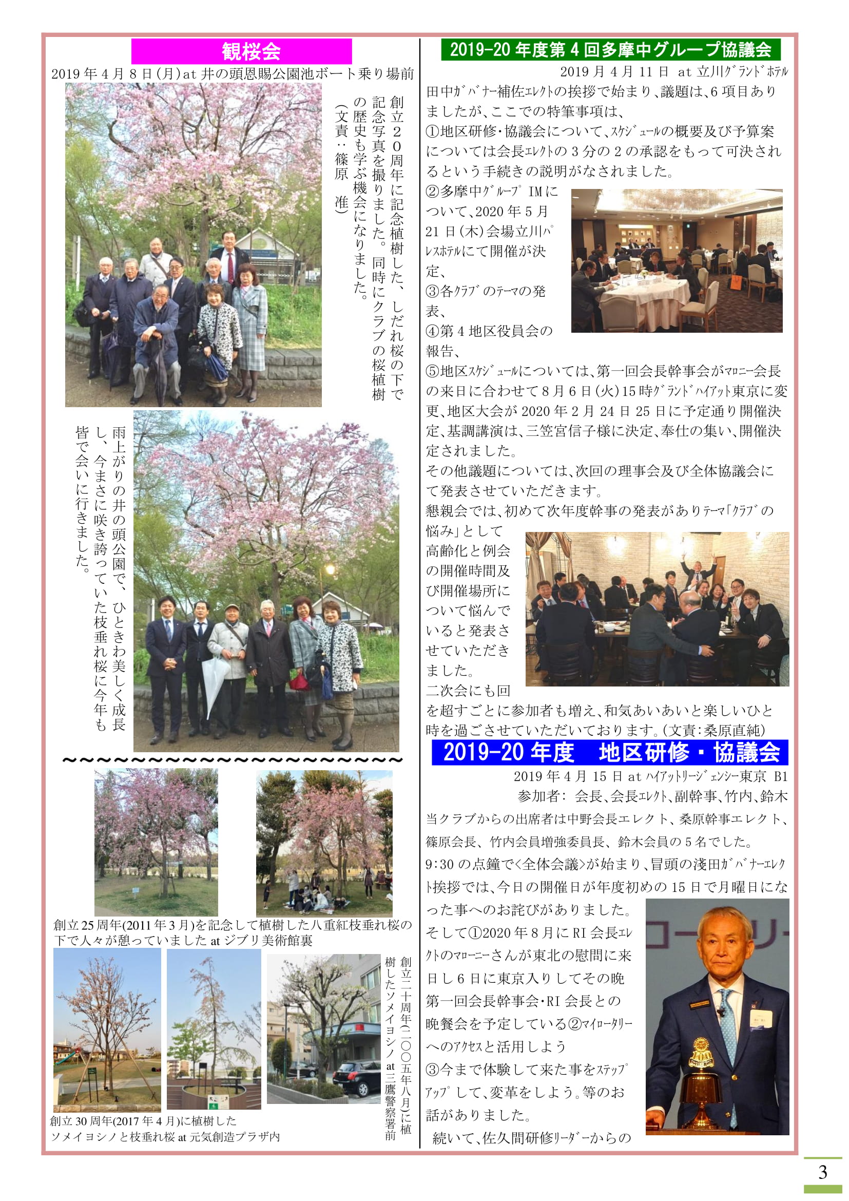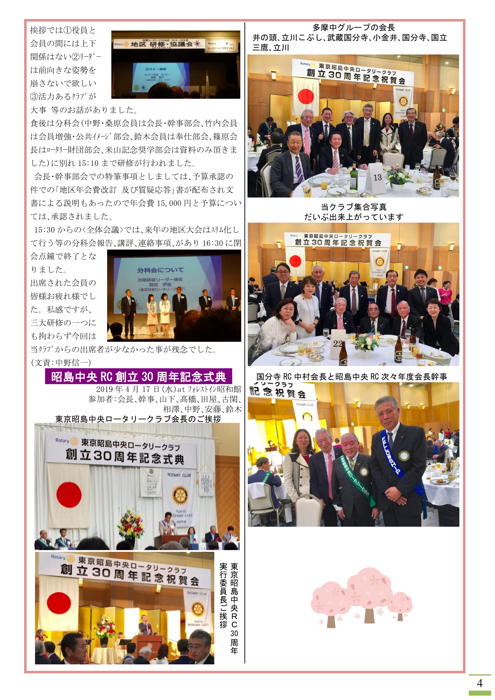 2019年4月22日発行(第33回三鷹奉仕4団体合同例会&2012-13年度多摩中グループ会長幹事同期会「辰巳会」報告&2019‐20年度観桜会& 2019-20年度第4回多摩中グループ協議会&2019-20年度地区研修・協議会&昭島中央RC創立30周年記念式典&2019-20年度PETS報告)