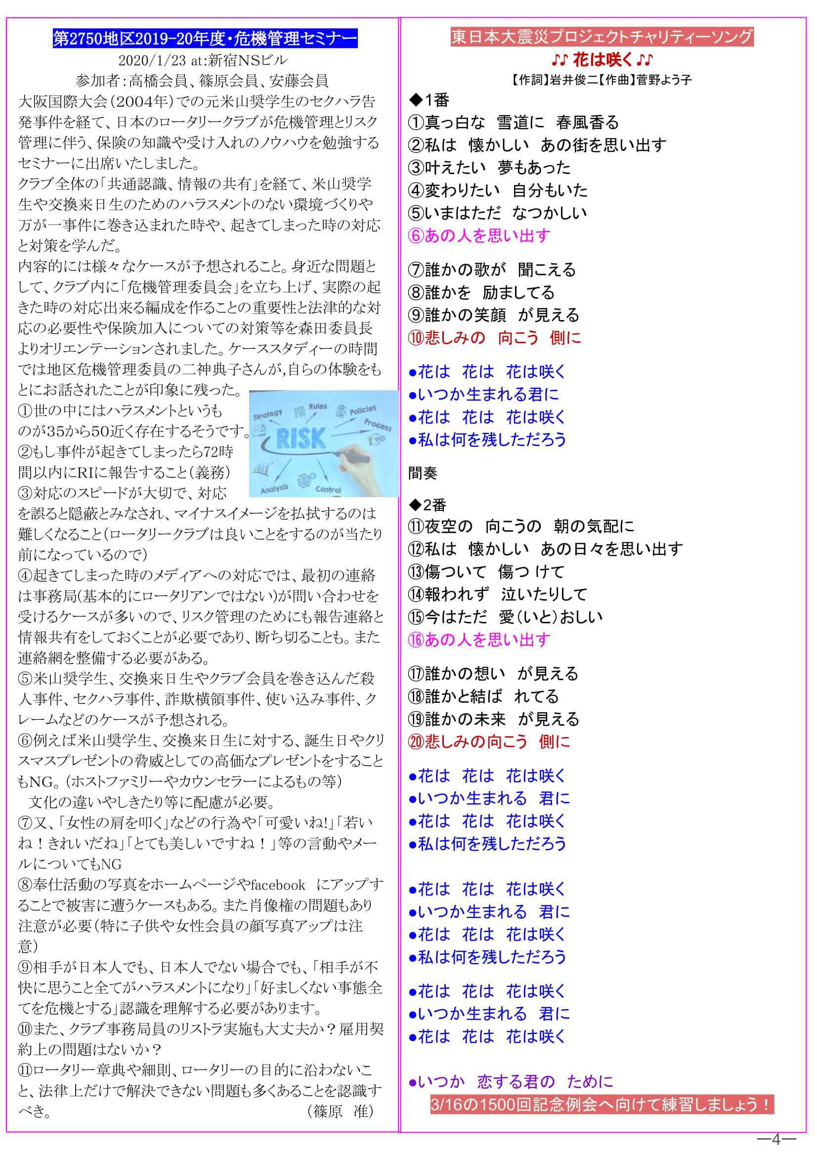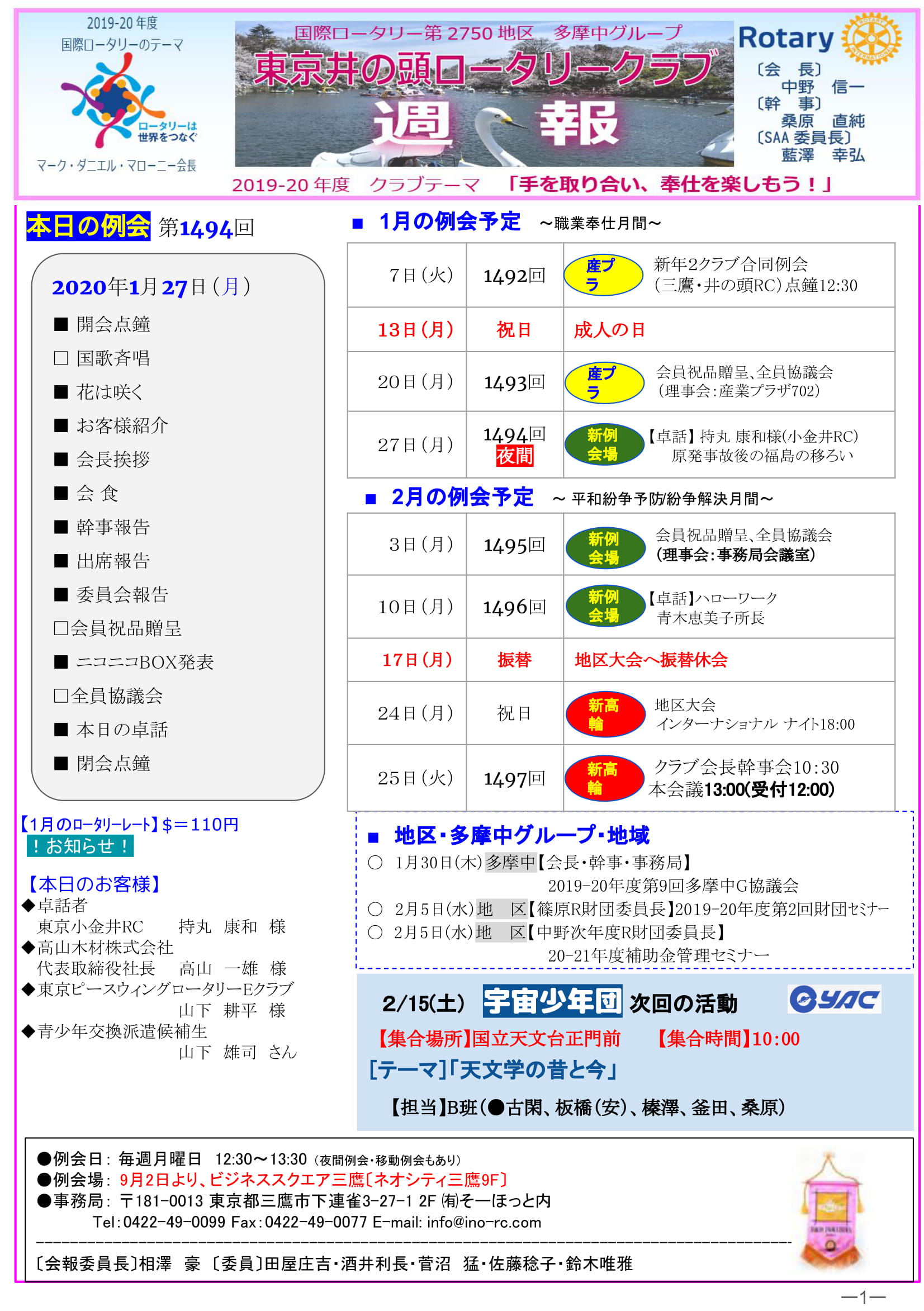 2020年2月3日発行(卓話:持丸康和様&2019-20年度多摩中G協議会報告&「働き方改革を学ぶ」講師の変更ついて&「花は咲く」歌詞)東京都三鷹市 東京井の頭ロータリークラブ →