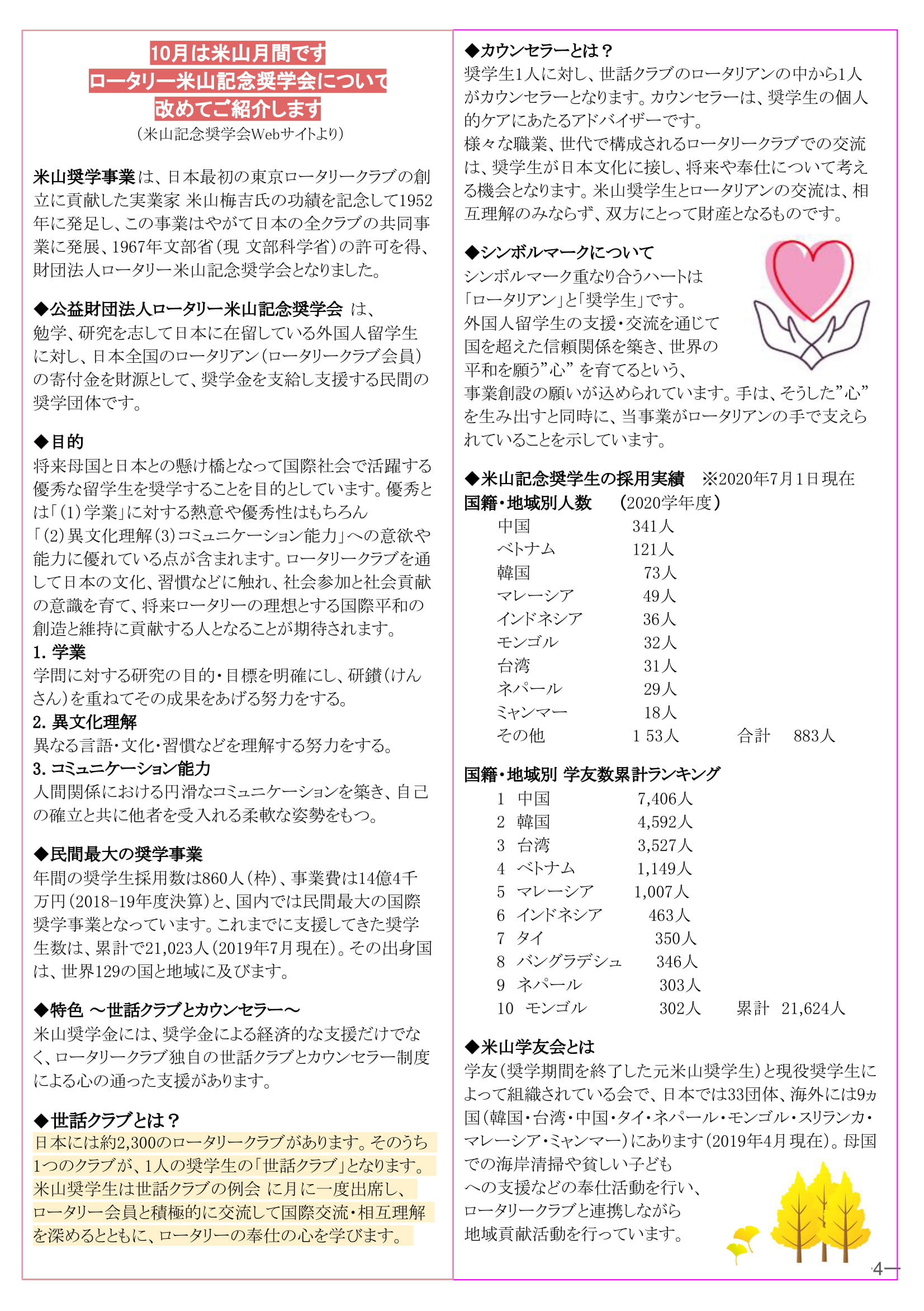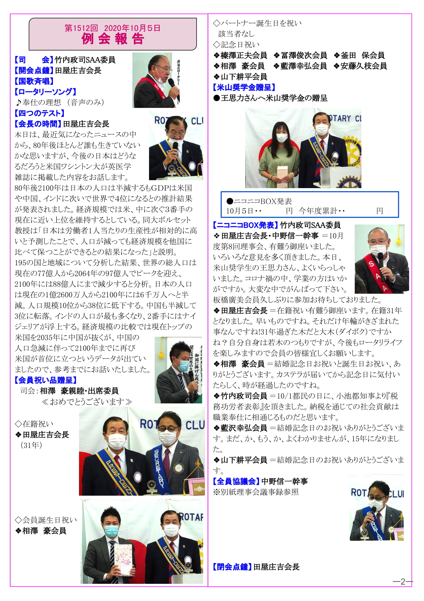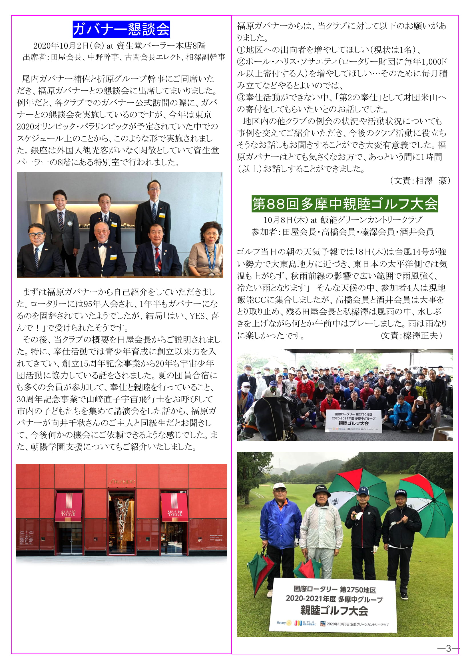 2020年10月19日発行(会員祝い品贈呈&米山奨学金贈呈&ガバナー懇談会&第88回多摩中親睦ゴルフ大会&米山記念奨学会について) 三鷹市 東京井の頭ロータリークラブ