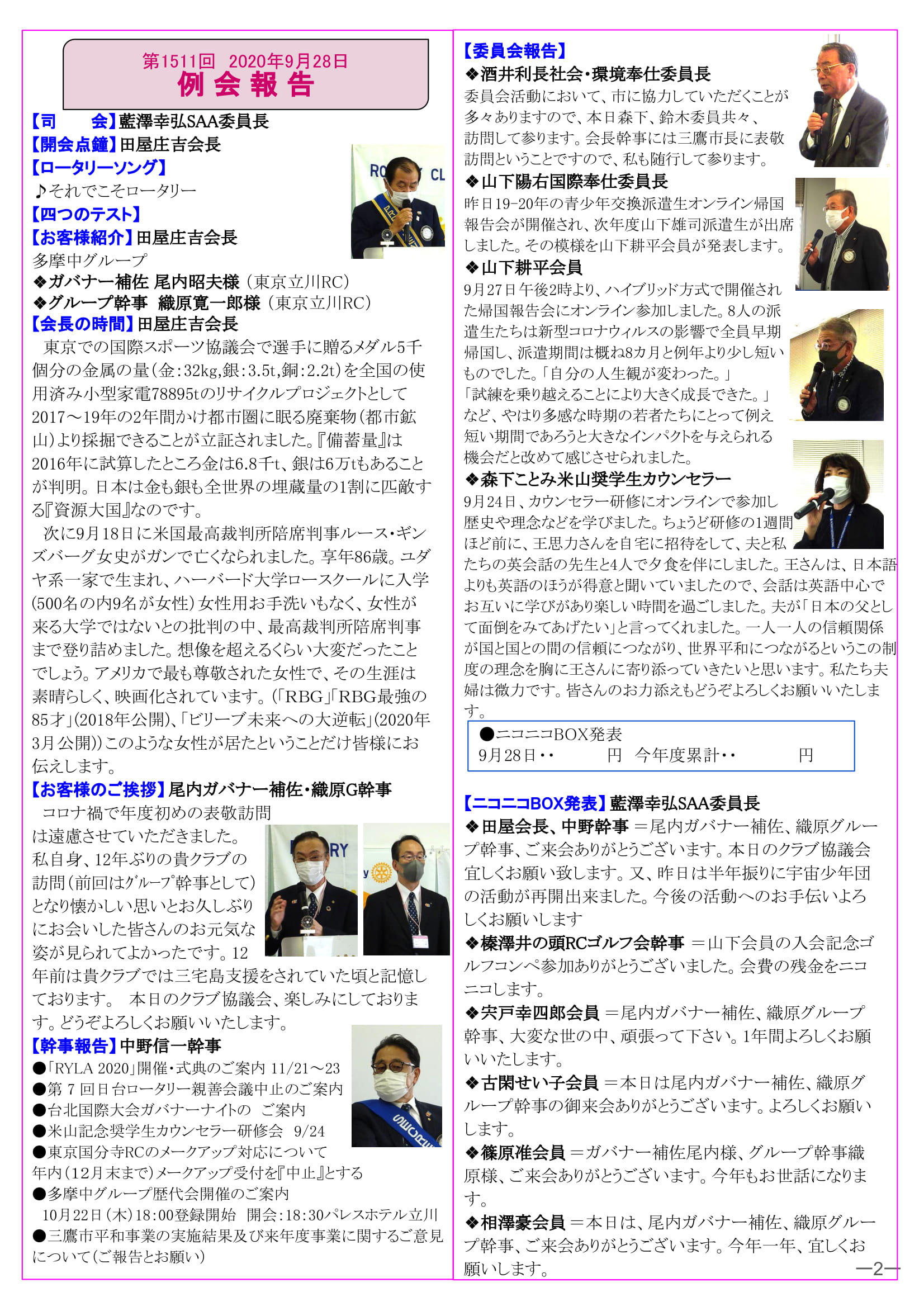 ← 2020年9月28日発行(イニシエーションスピーチ&米山記念奨学生初顔合わせの会報告&地区公共イメージセミナー報告&2020-21年度第6回多摩中グループ協議会報告&山下耕平会員歓迎ゴルフコンペ)