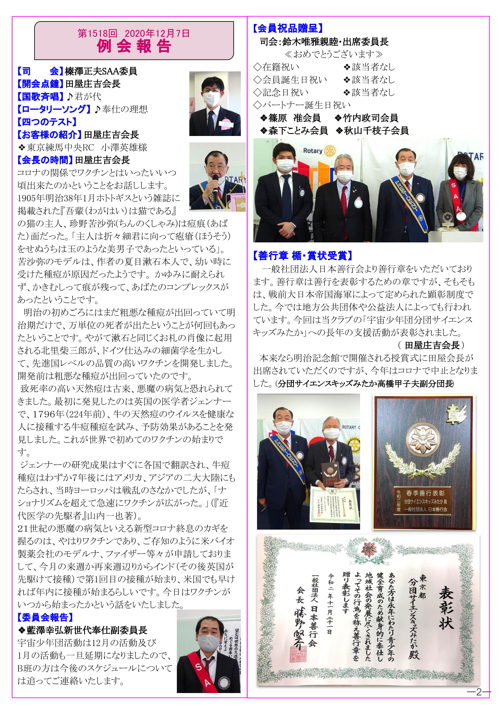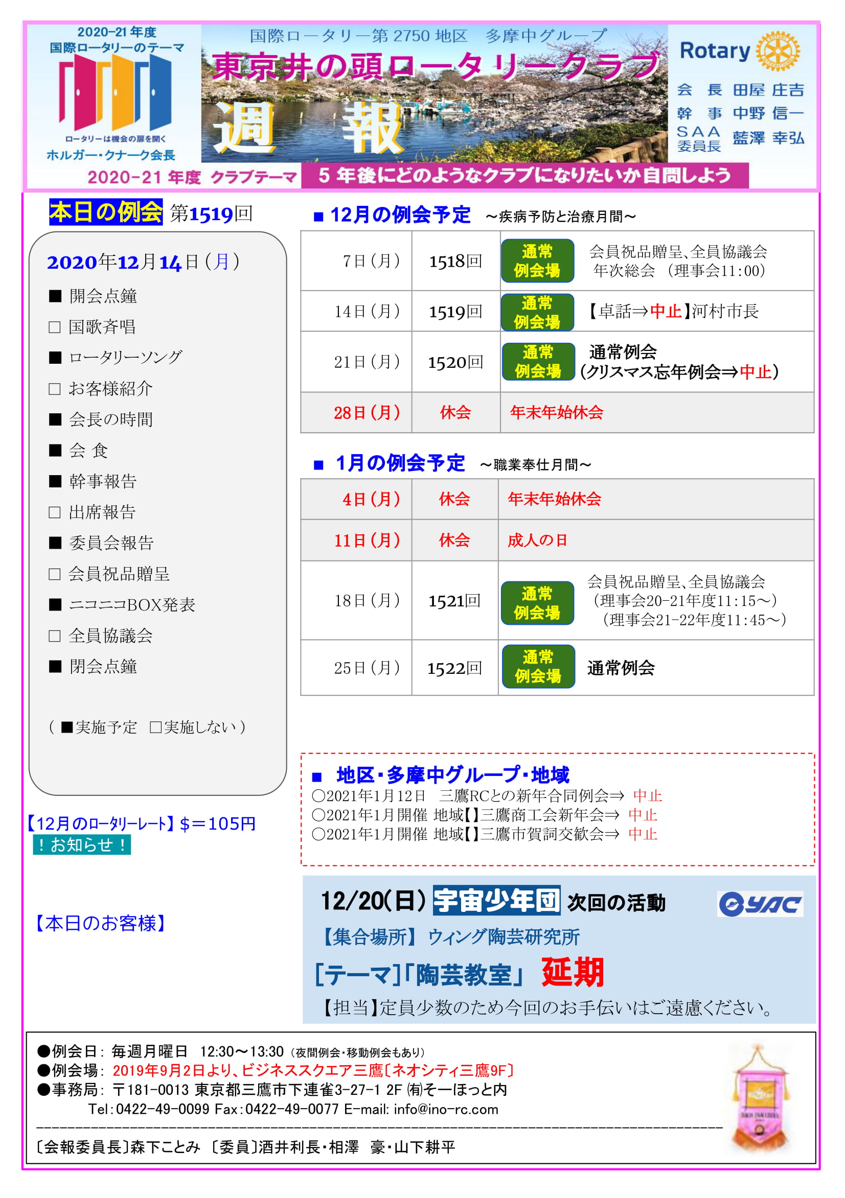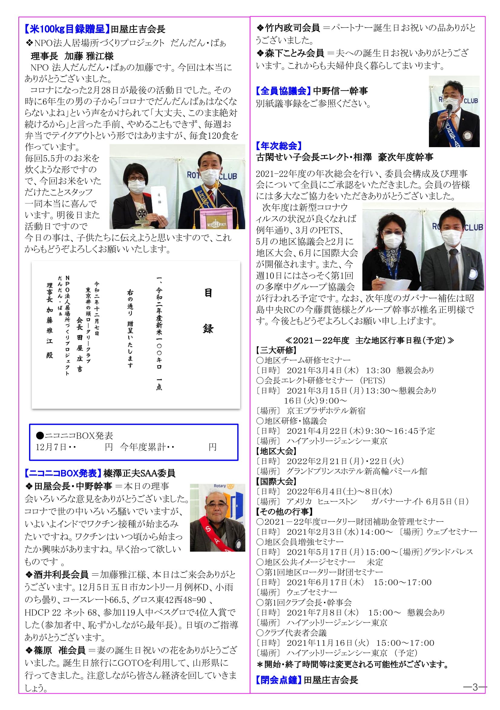 2020年12月14日発行(善行章 楯・賞状受賞&米100㎏目録贈呈&年次総会&2021-22年度 主䛺地区行事日程予定) 三鷹市 東京井の頭ロータリークラブ