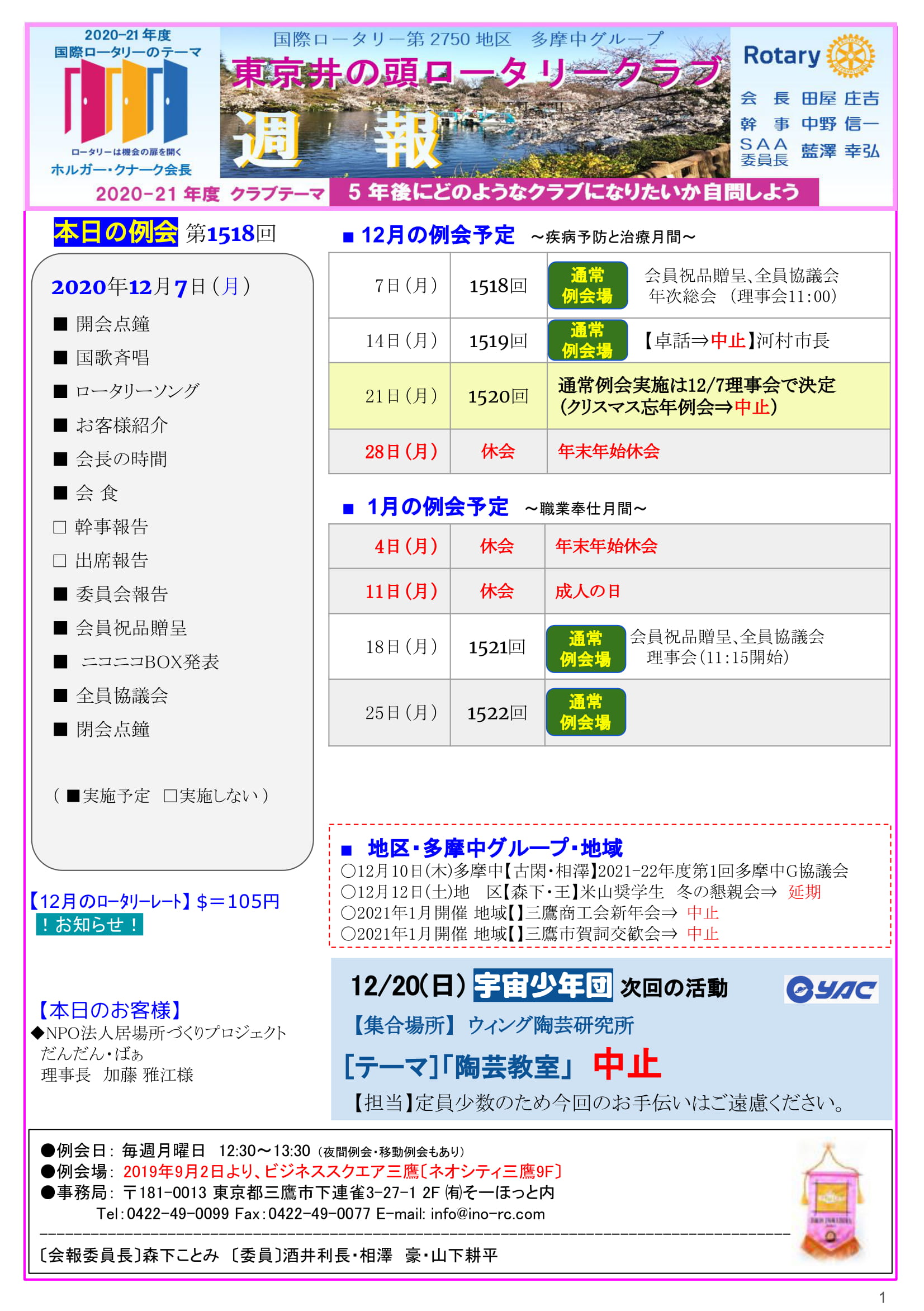 2020年11月30日発行(第1516回 2020年11月20日 日本のロータリー100周年記念 ガバナー公式訪問13クラブ合同例会 報 告) 三鷹市 東京井の頭ロータリークラブ