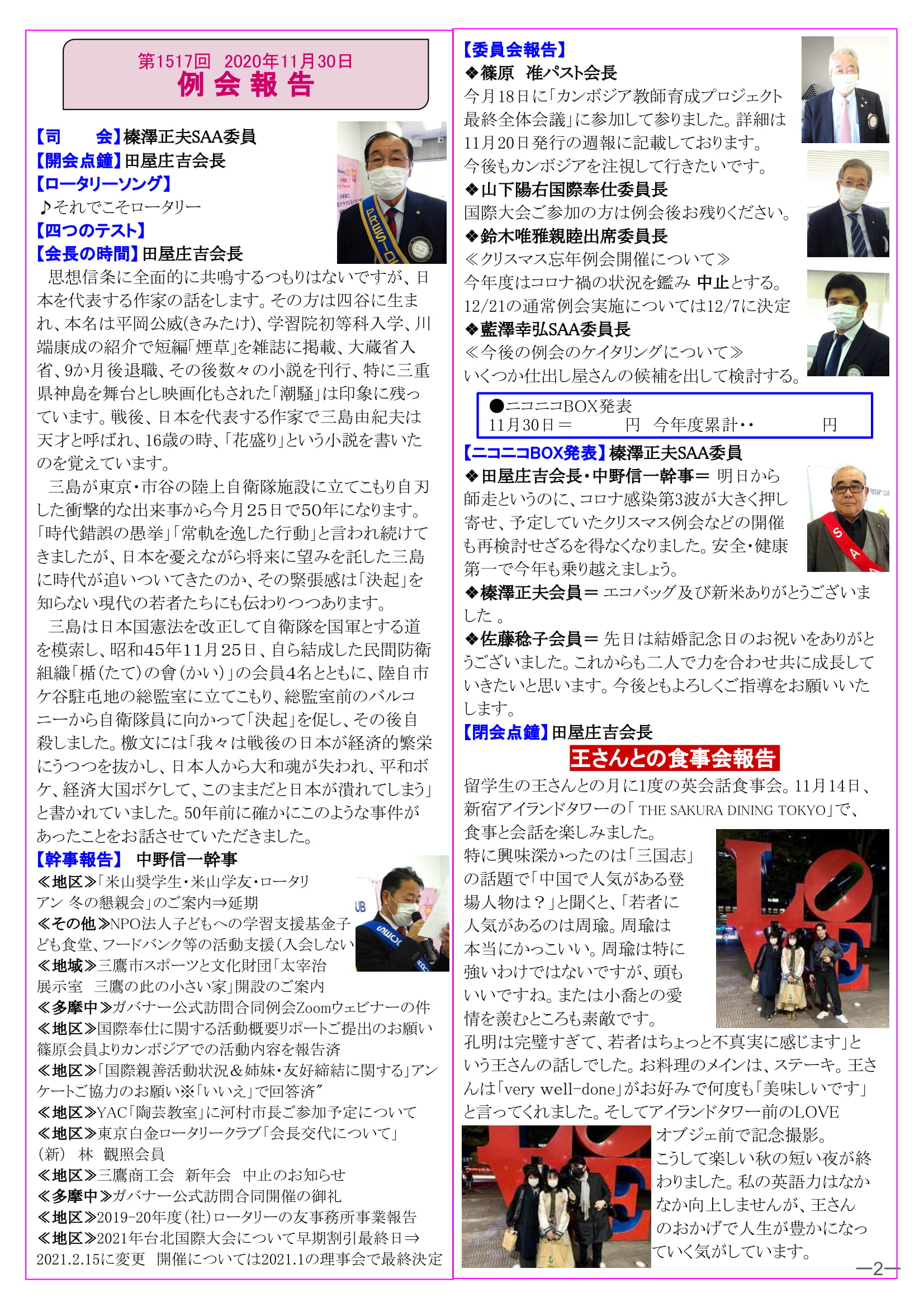 2020年12月7日発行(王さんとの食事会報告) 三鷹市 東京井の頭ロータリークラブ