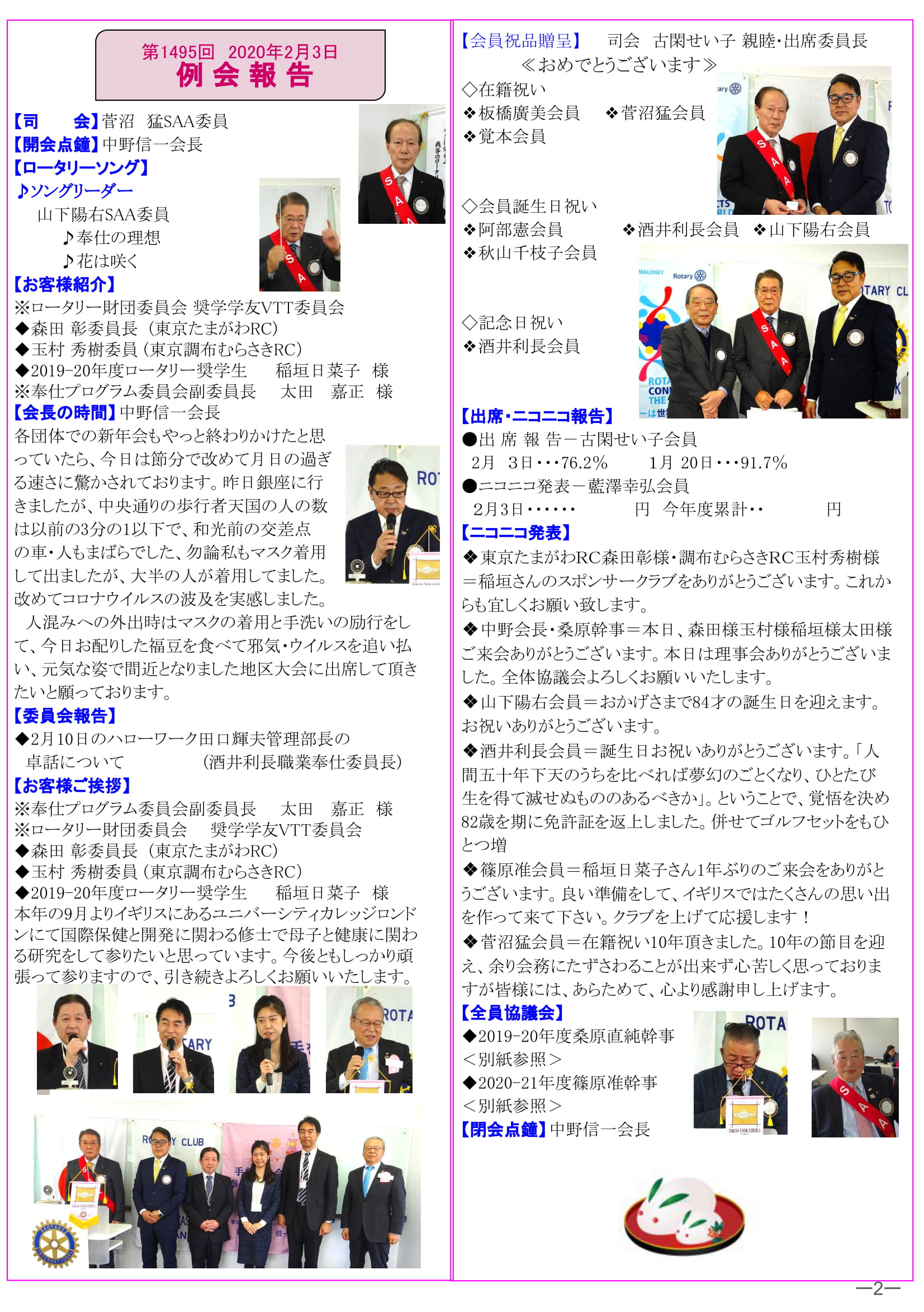2020年2月3日発行(卓話:持丸康和様&2019-20年度多摩中G協議会報告&「働き方改革を学ぶ」講師の変更ついて&「花は咲く」歌詞)東京都三鷹市 東京井の頭ロータリークラブ
