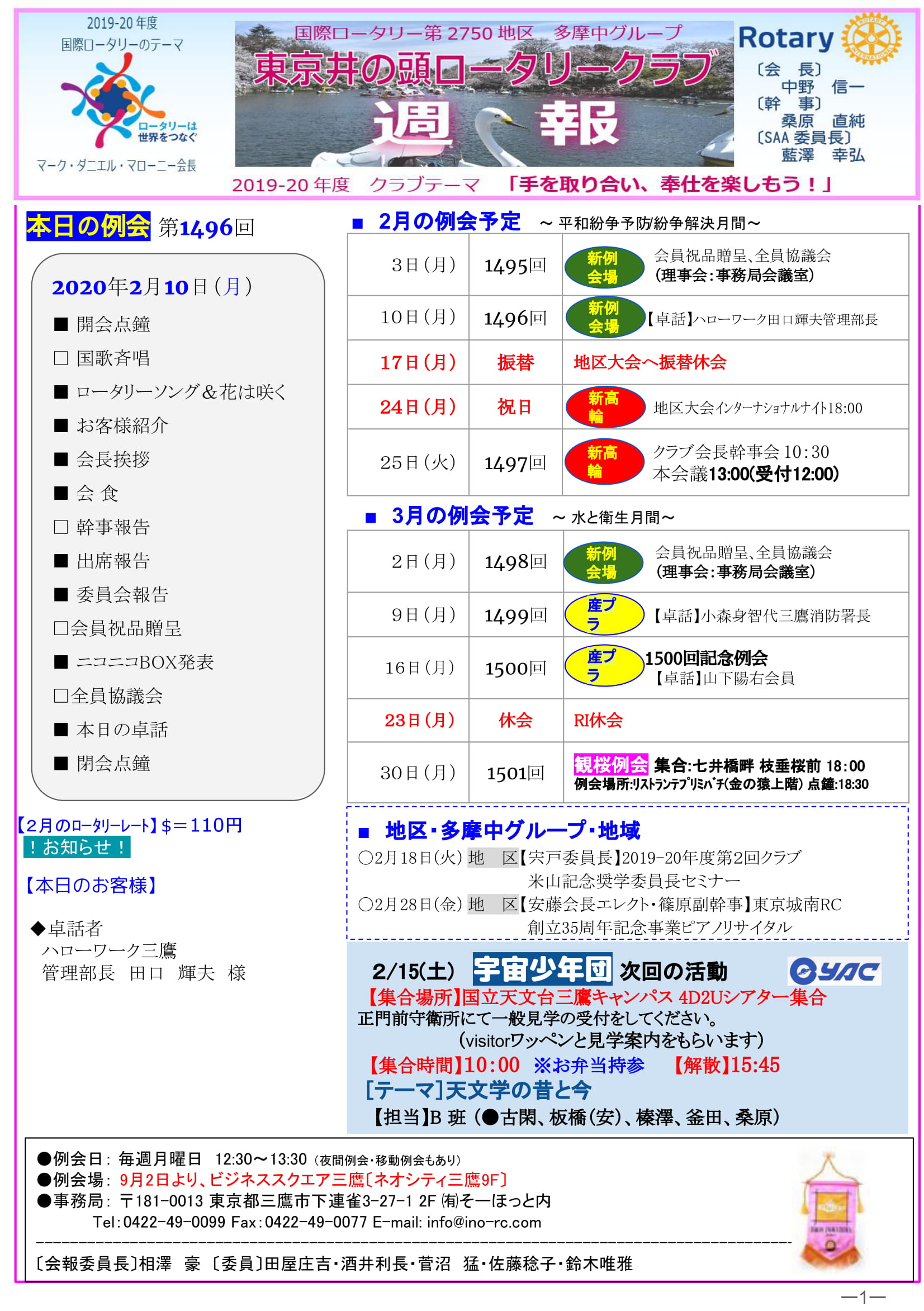 2020年3月2日発行(卓話:田口輝夫ハローワーク三鷹管理部長&補助金管理セミナー報告&日本宇宙少年団分団サイエンスキッズみたか活動:天文学の昔と今&国際ロータリー第2750地区2019-20年度地区大会報告) 三鷹市 東京井の頭ロータリークラブ