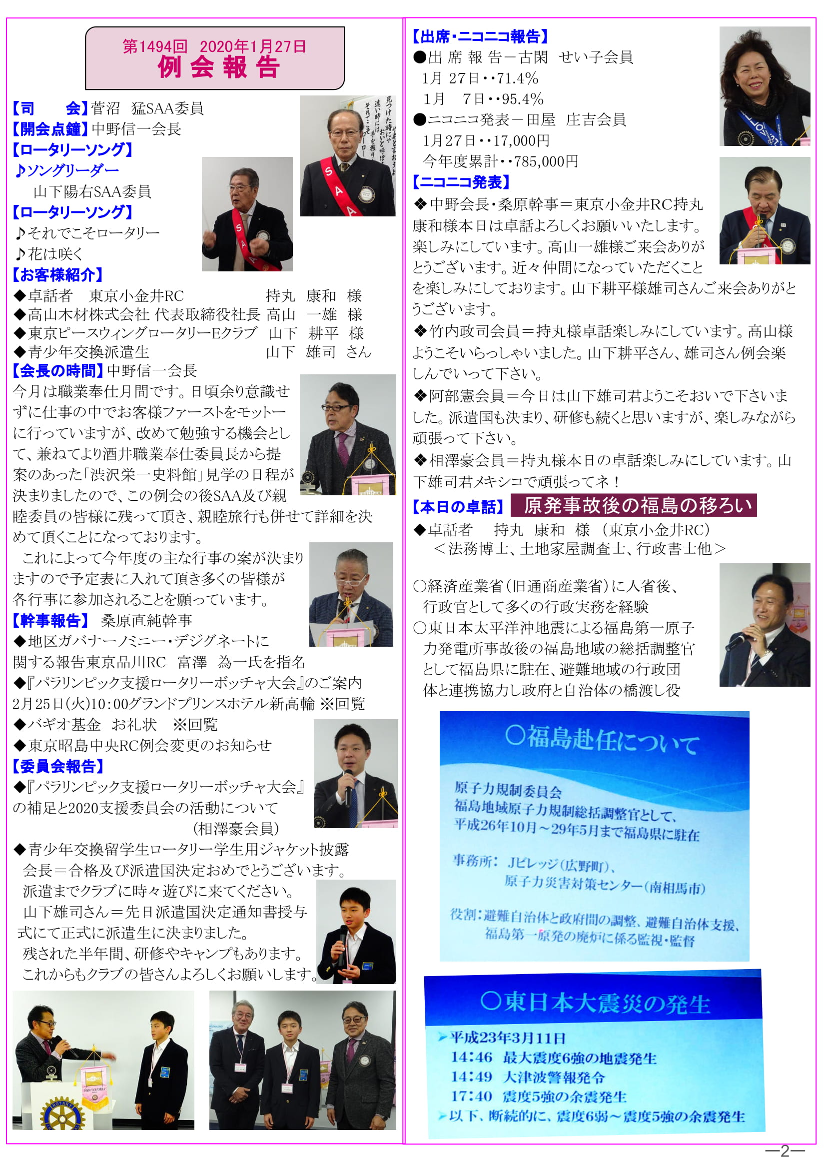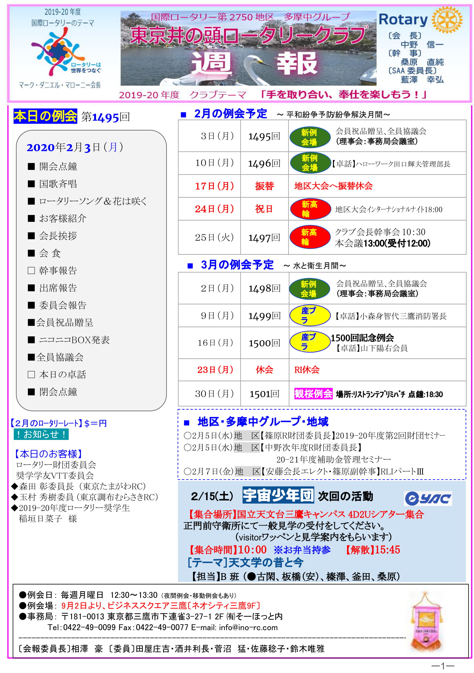 • 2020年2月3日発行(卓話:持丸康和様&2019-20年度多摩中G協議会報告&「働き方改革を学ぶ」講師の変更ついて&「花は咲く」歌詞)東京都三鷹市 東京井の頭ロータリークラブ
