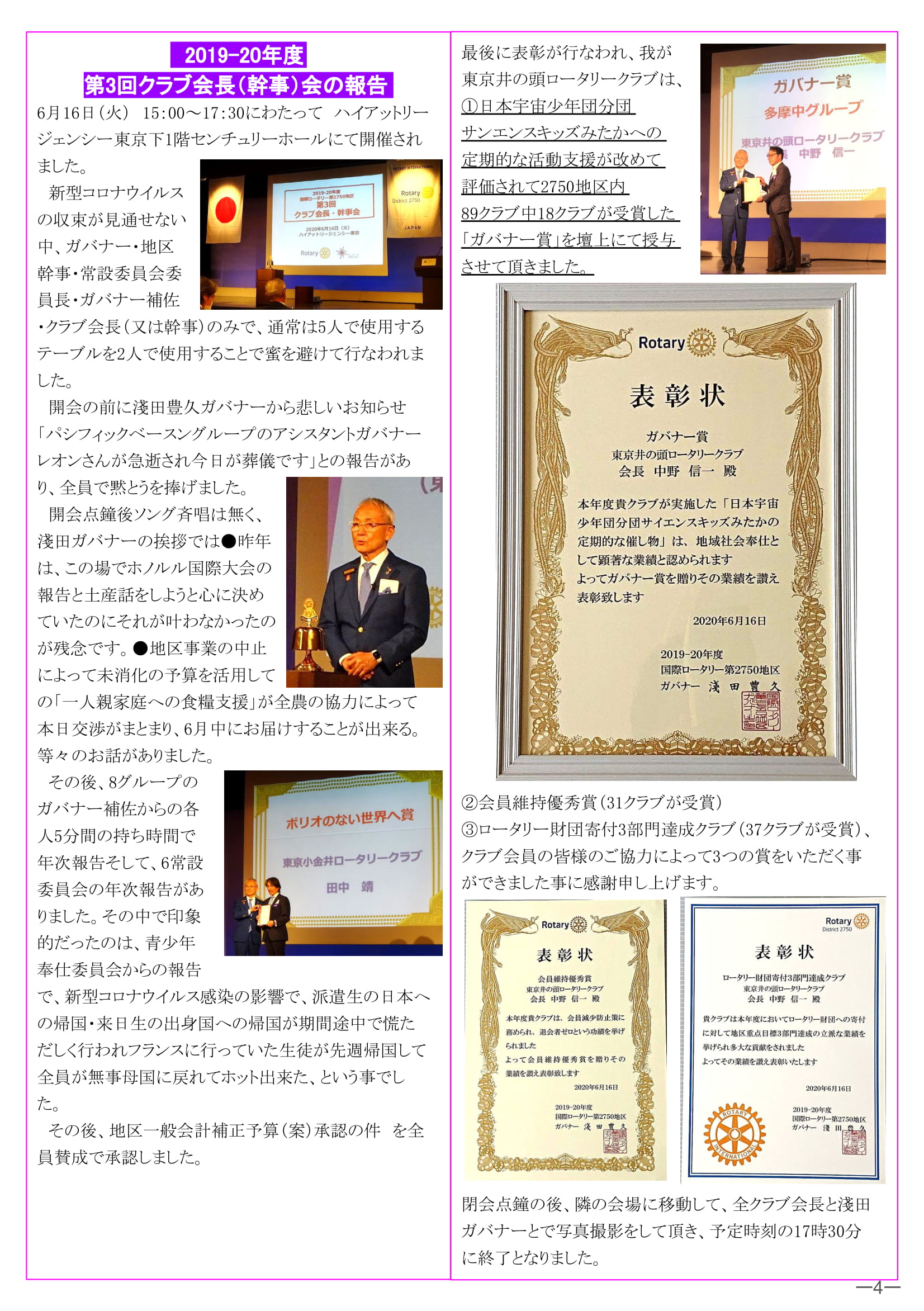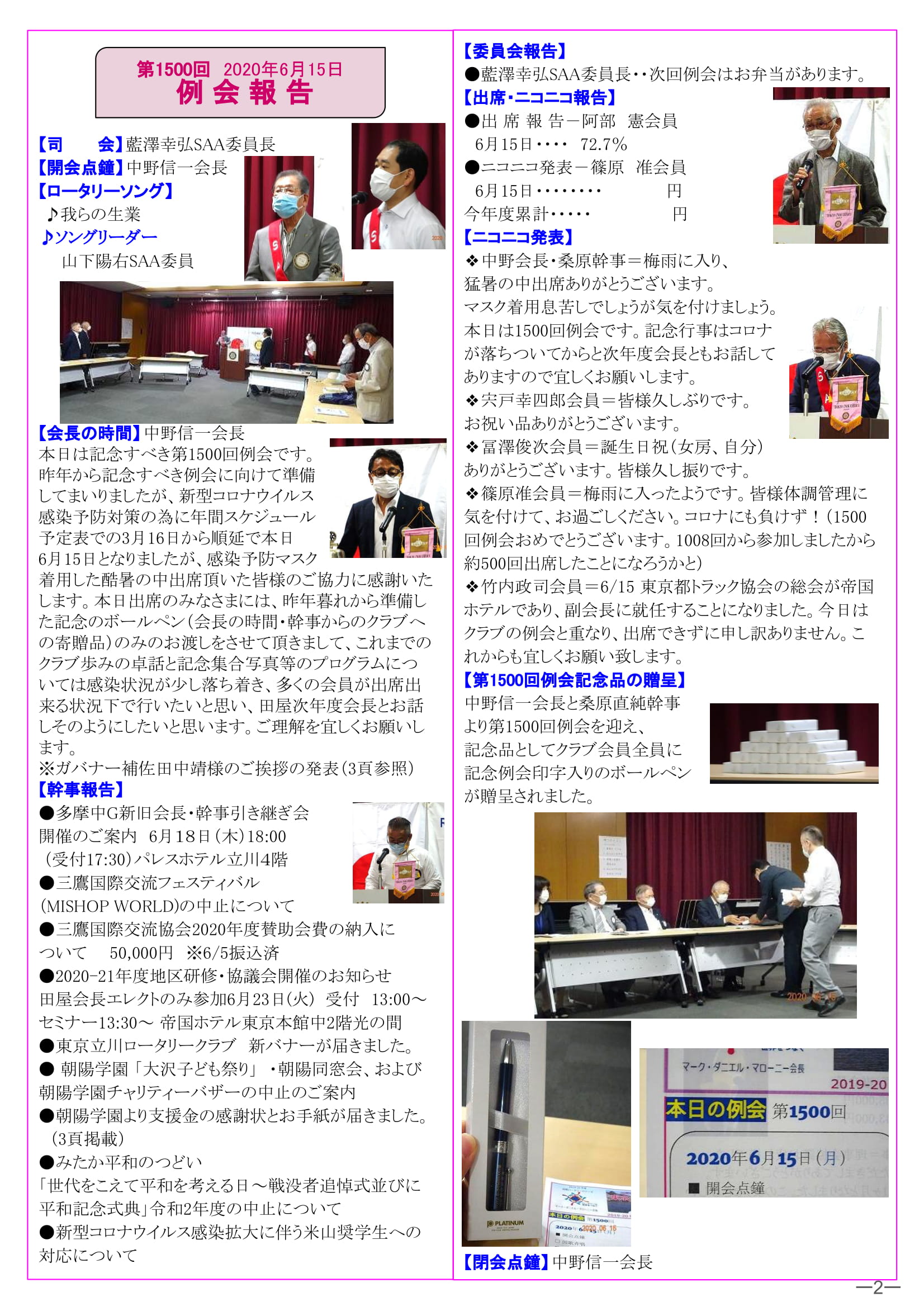 2020年6月22日発行(第1500回例会記念品の贈呈&2019-20年度多摩中グループガバナー補佐 田中 靖様 退任のご挨拶&朝陽学園からクラブ支援に対する 感謝のお手紙&2019-20年度第3回クラブ会長(幹事)会の報告&ガバナー賞・会員維持優秀賞・ロータリー財団寄付3部門達成クラブ賞受賞)