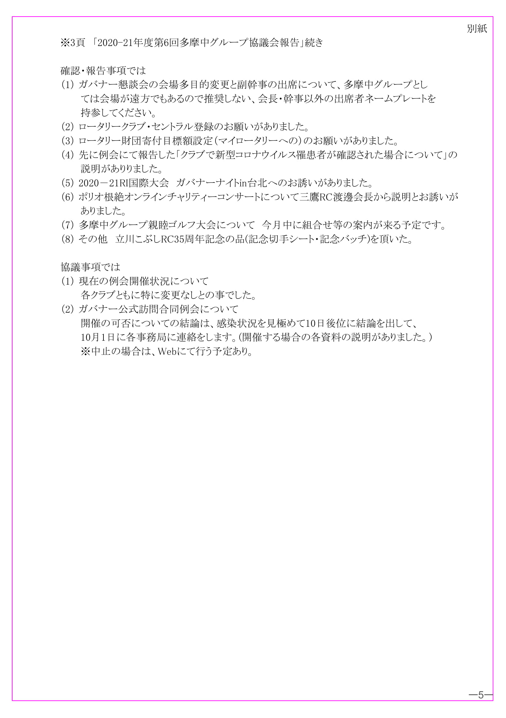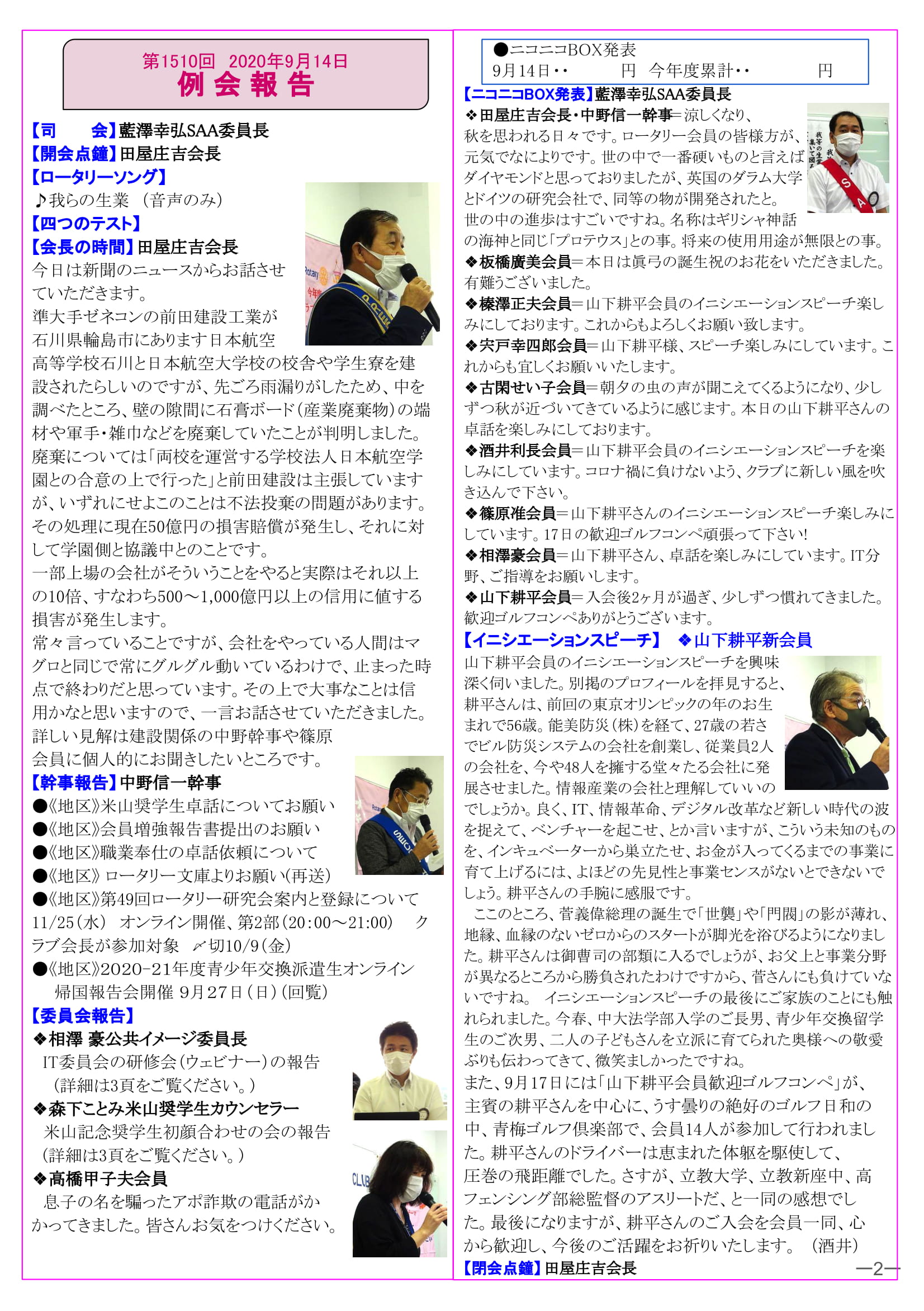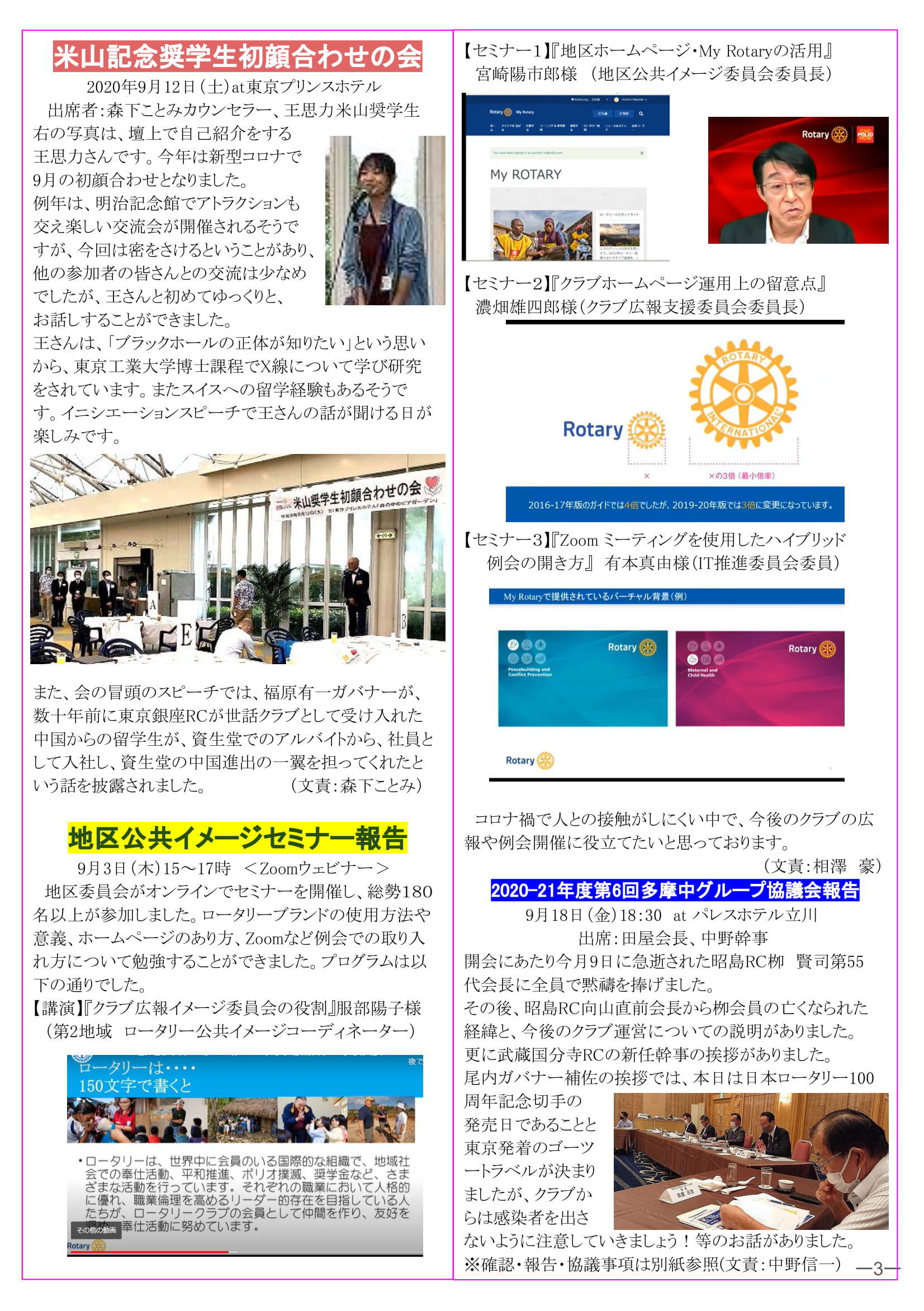 2020年9月28日発行(イニシエーションスピーチ&米山記念奨学生初顔合わせの会報告&地区公共イメージセミナー報告&2020-21年度第6回多摩中グループ協議会報告&山下耕平会員歓迎ゴルフコンペ)
