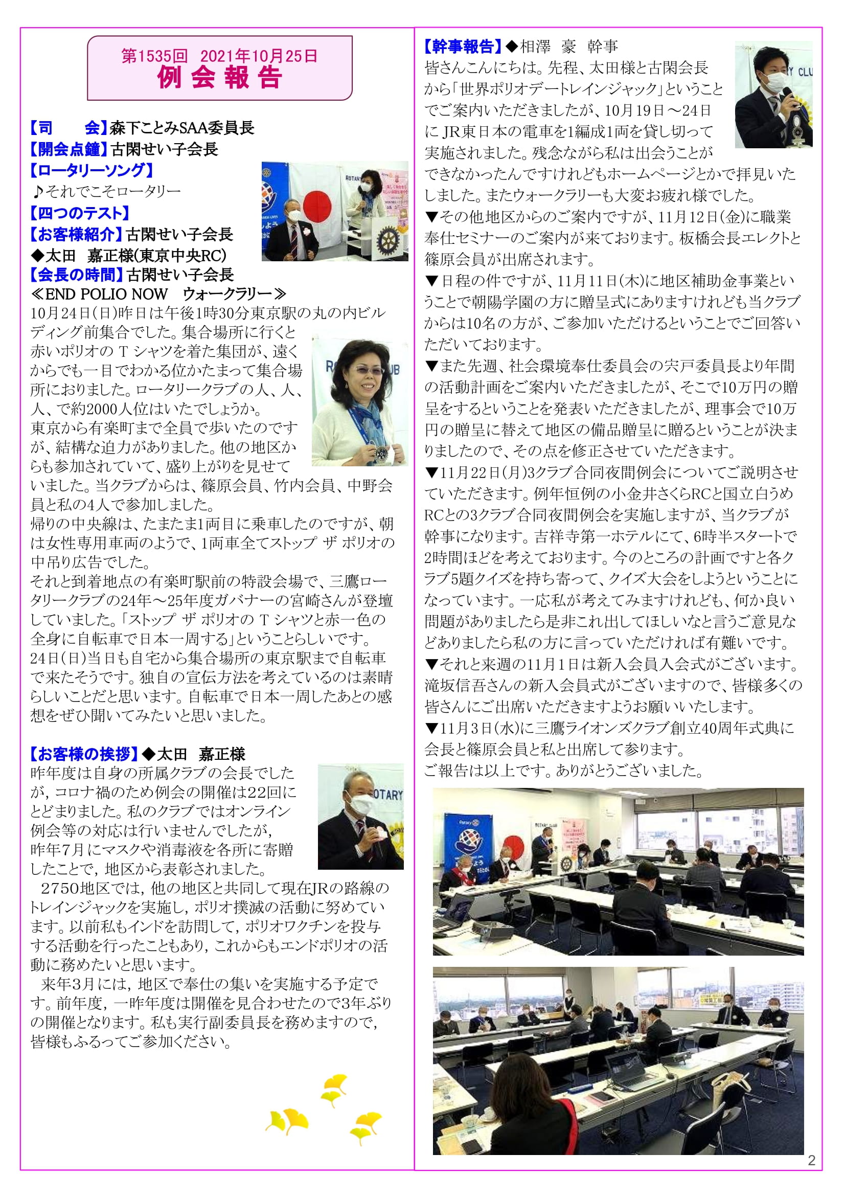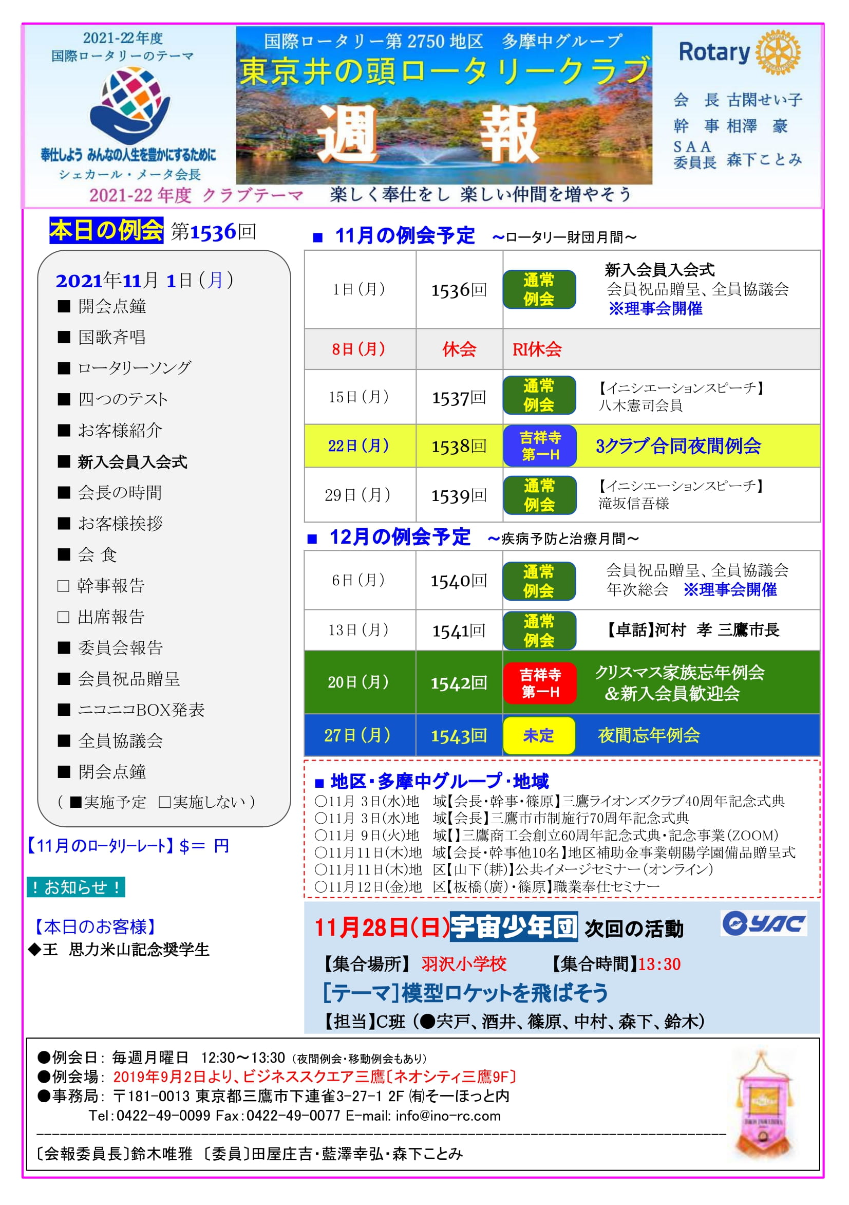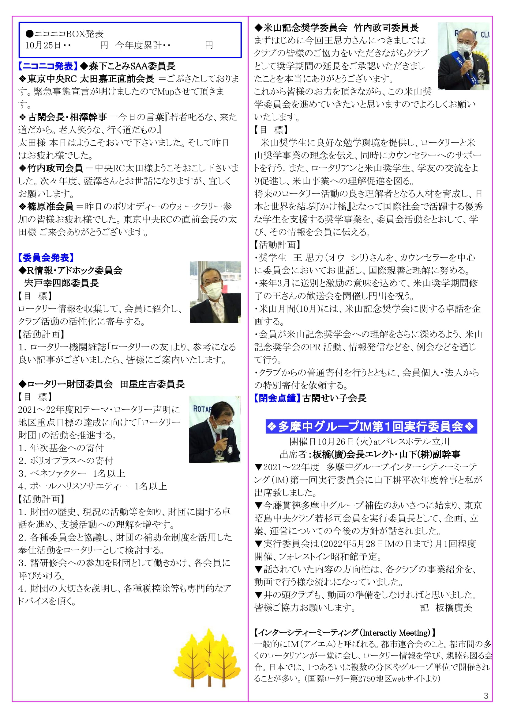 ← 2021年10月25日発行(委員会発表)三鷹市 東京井の頭ロータリークラブ