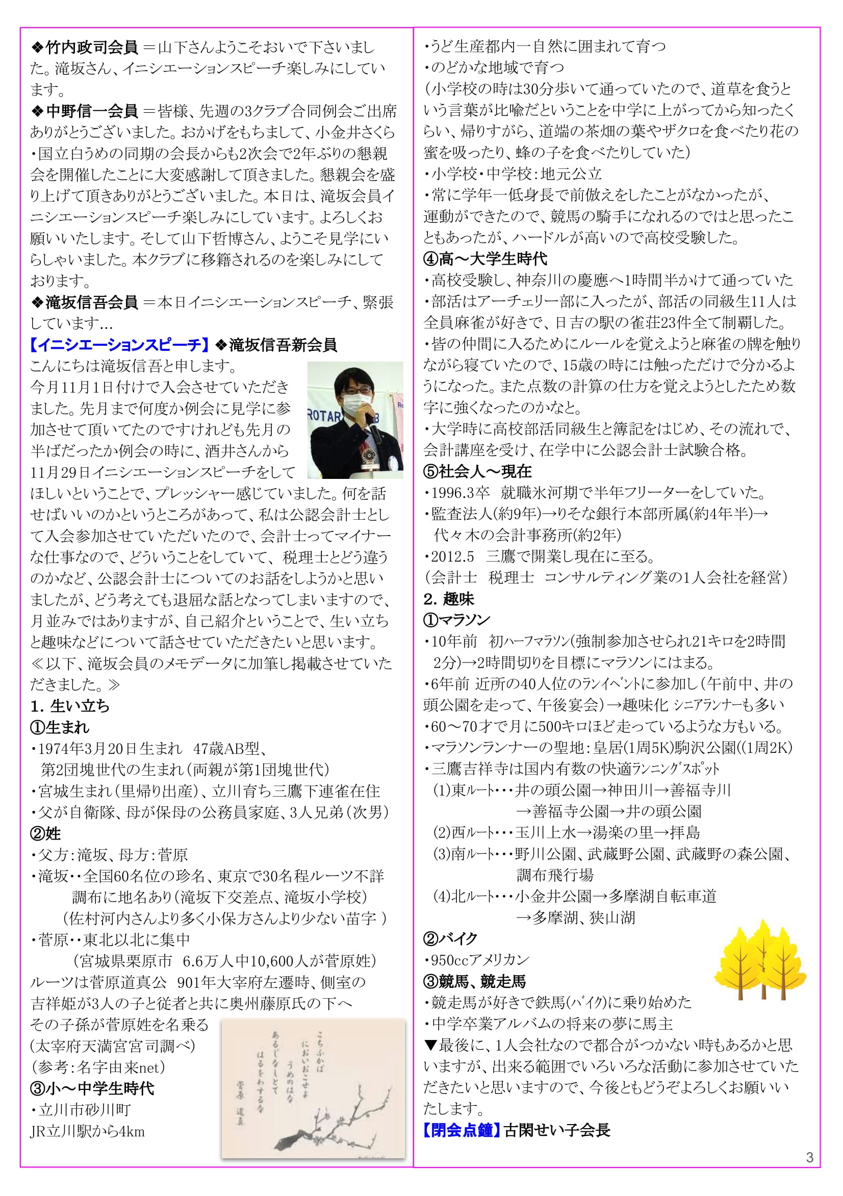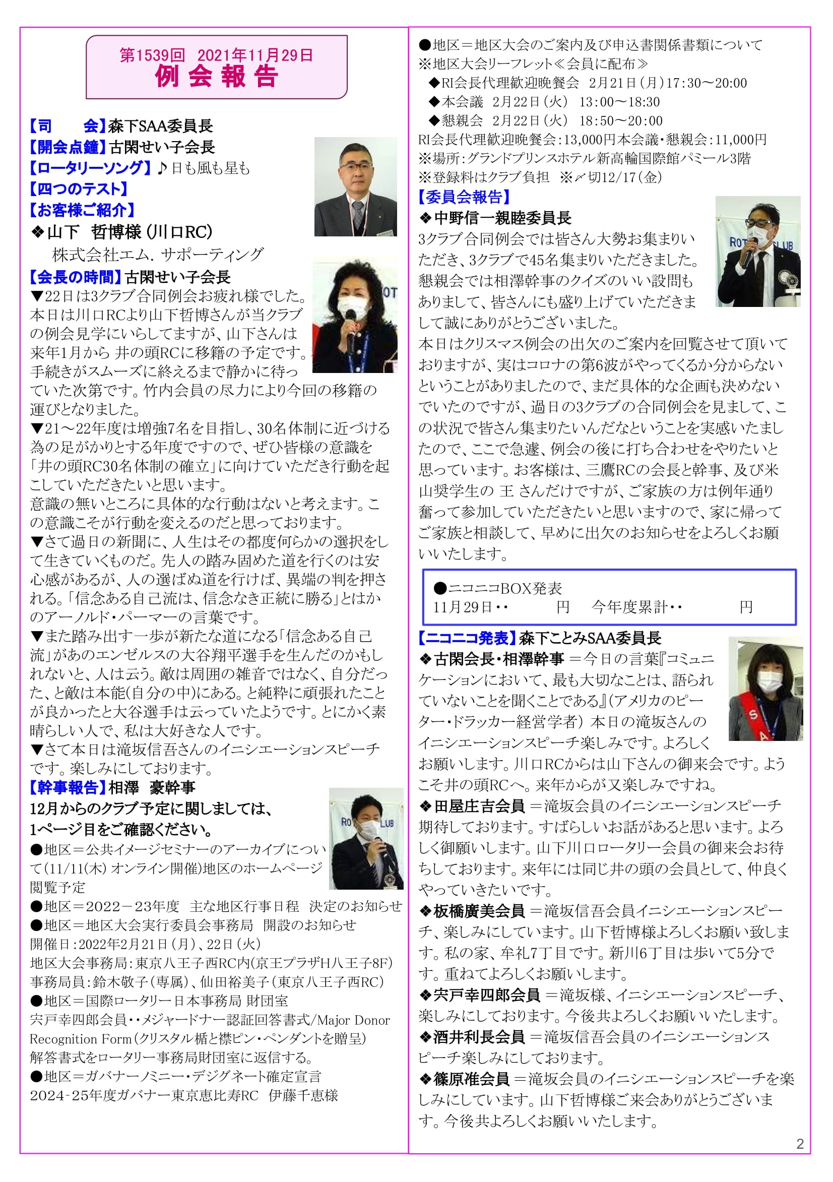 2021年11月29日発行(3クラブ合同例会報告&2021-22年度第7回多摩中グループ協議会&第2回多摩中IM実行委員会)三鷹市 東京井の頭ロータリークラブ