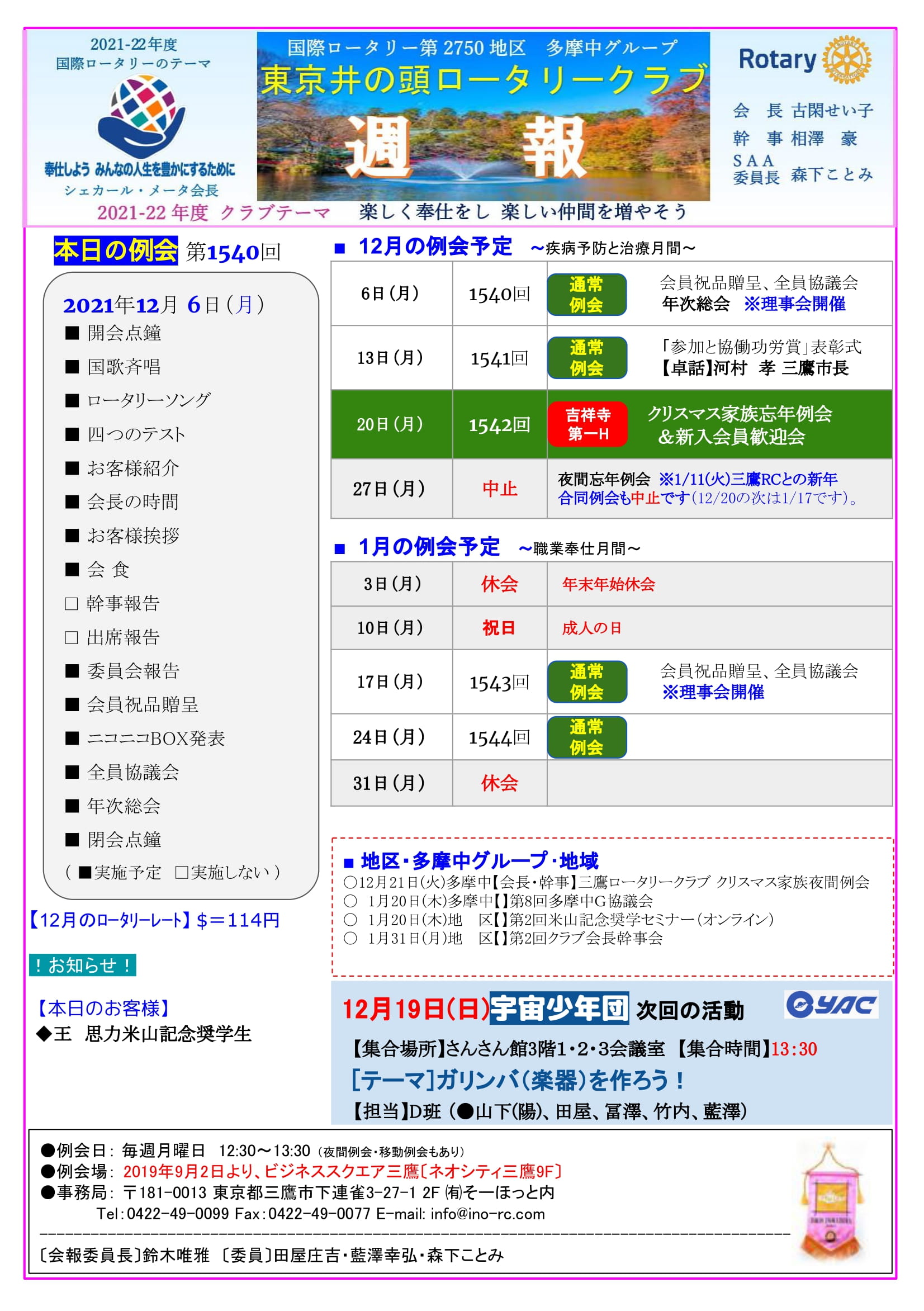 2021年12月13日発行(全員協議会&年次総会)三鷹市 東京井の頭ロータリークラブ