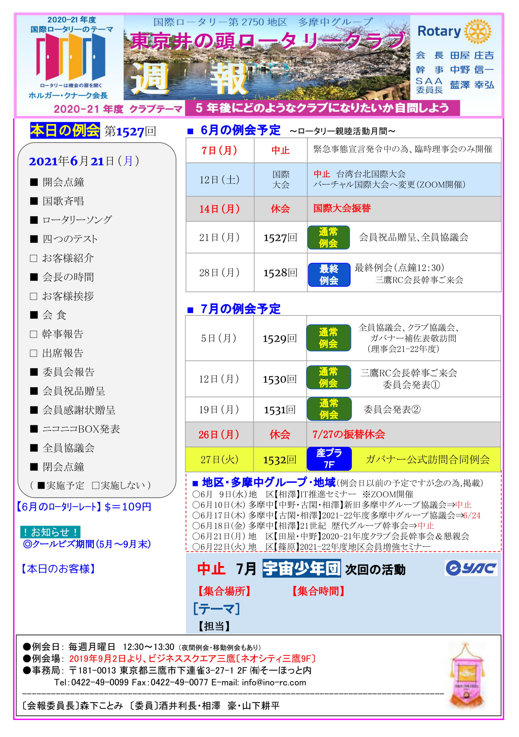 2021年6月28日発行(2020-21年度クラブ会長幹事会&懇親会&年度末訪問に代えてご挨拶&朝陽学園感謝状)三鷹市 東京井の頭ロータリークラブ