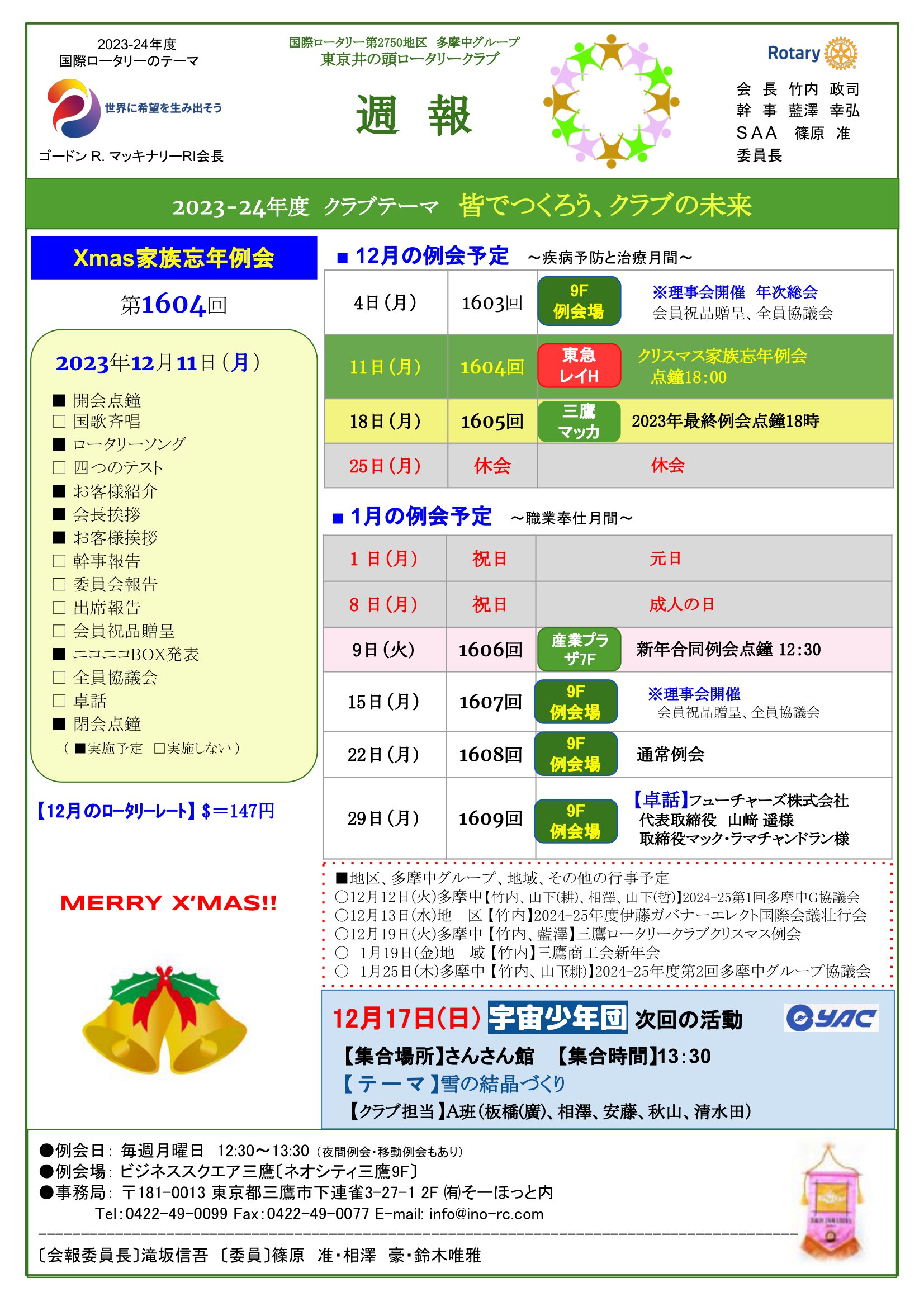 2024年1月9日発行(Xmas家族忘年例会&2024-25年度第1回多摩中グループ協議会&第1605回2023年最終忘年例会&日本宇宙少年団 分団サイエンスキッズみたか(雪の結晶を作ろう)) 東京都三鷹市 東京井の頭ロータリークラブ