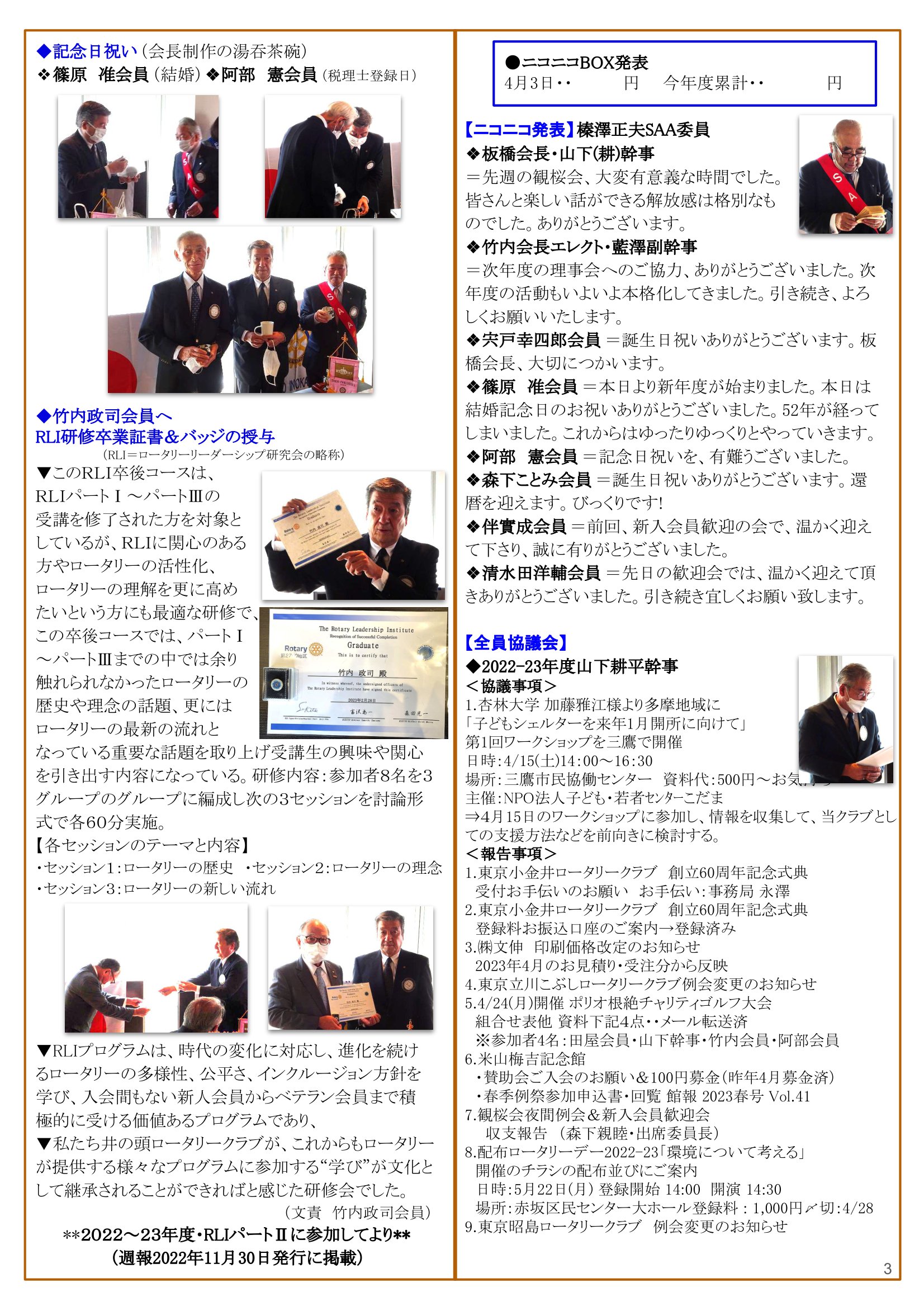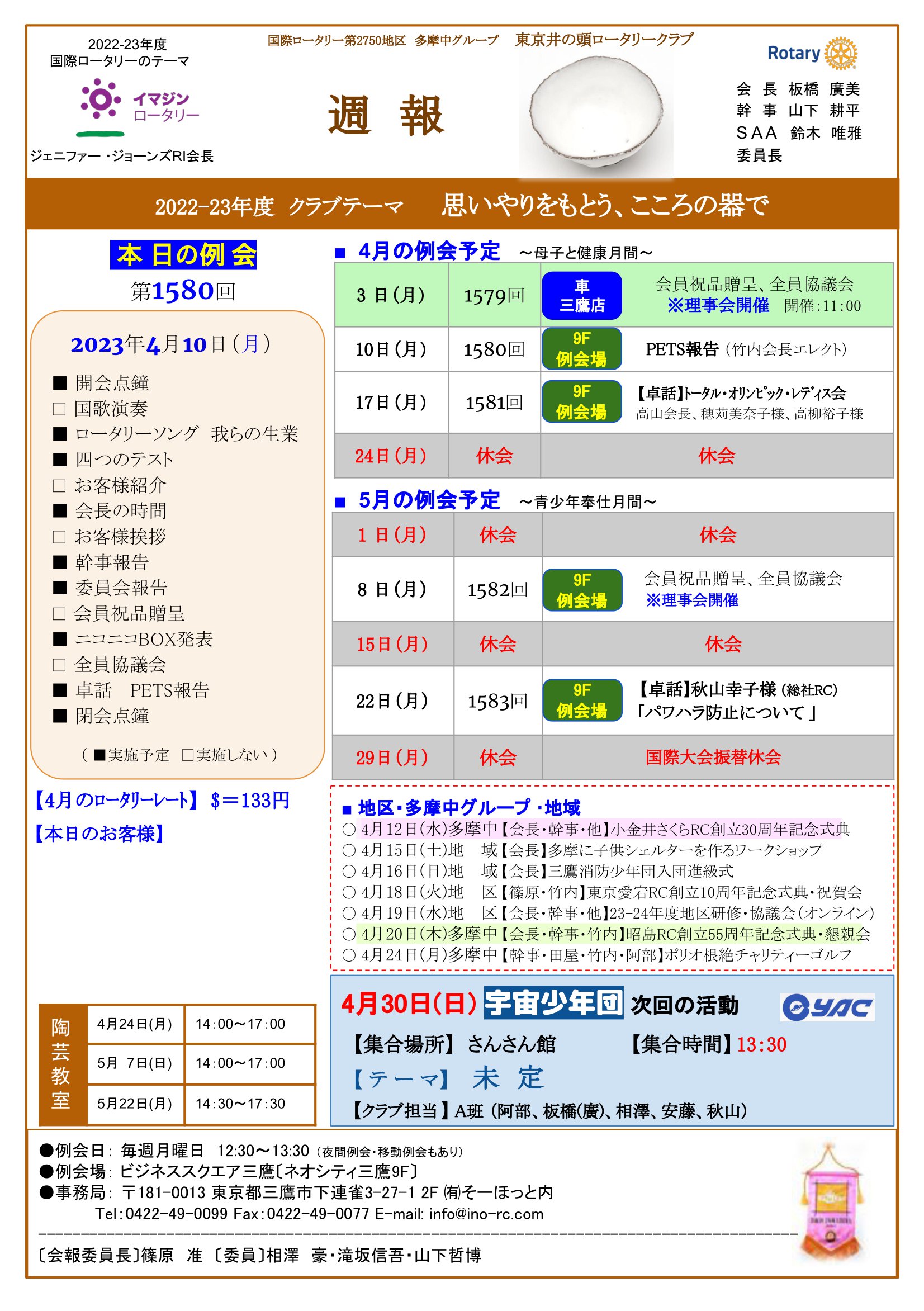 2023年4月17日発行(2023-24年度 PETS報告&完成したお茶碗&小金井さくらRC創立30周年記念式典&伴實成会員の河口湖コテージ&ワイナリー) 東京都三鷹市 東京井の頭ロータリークラブ →