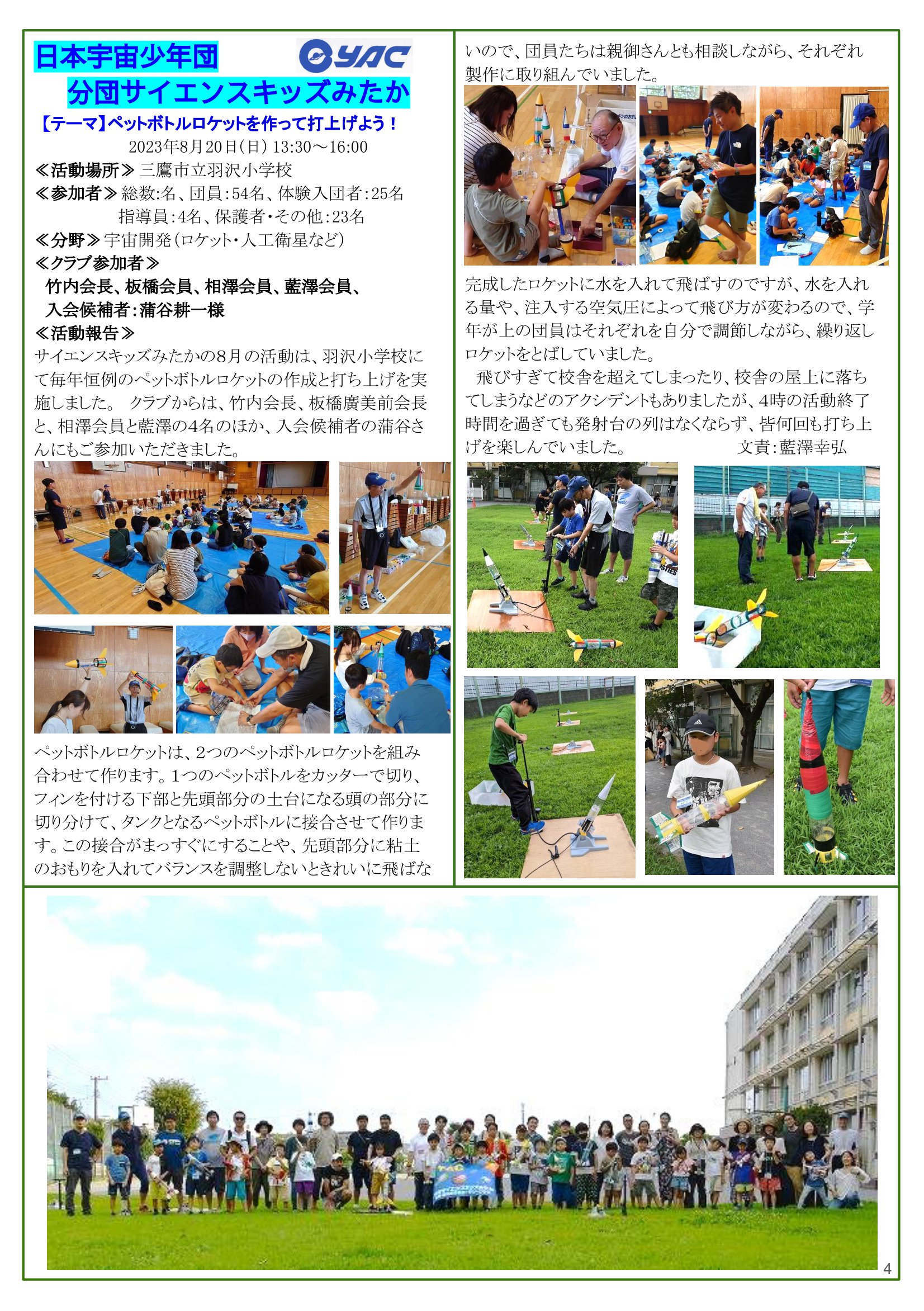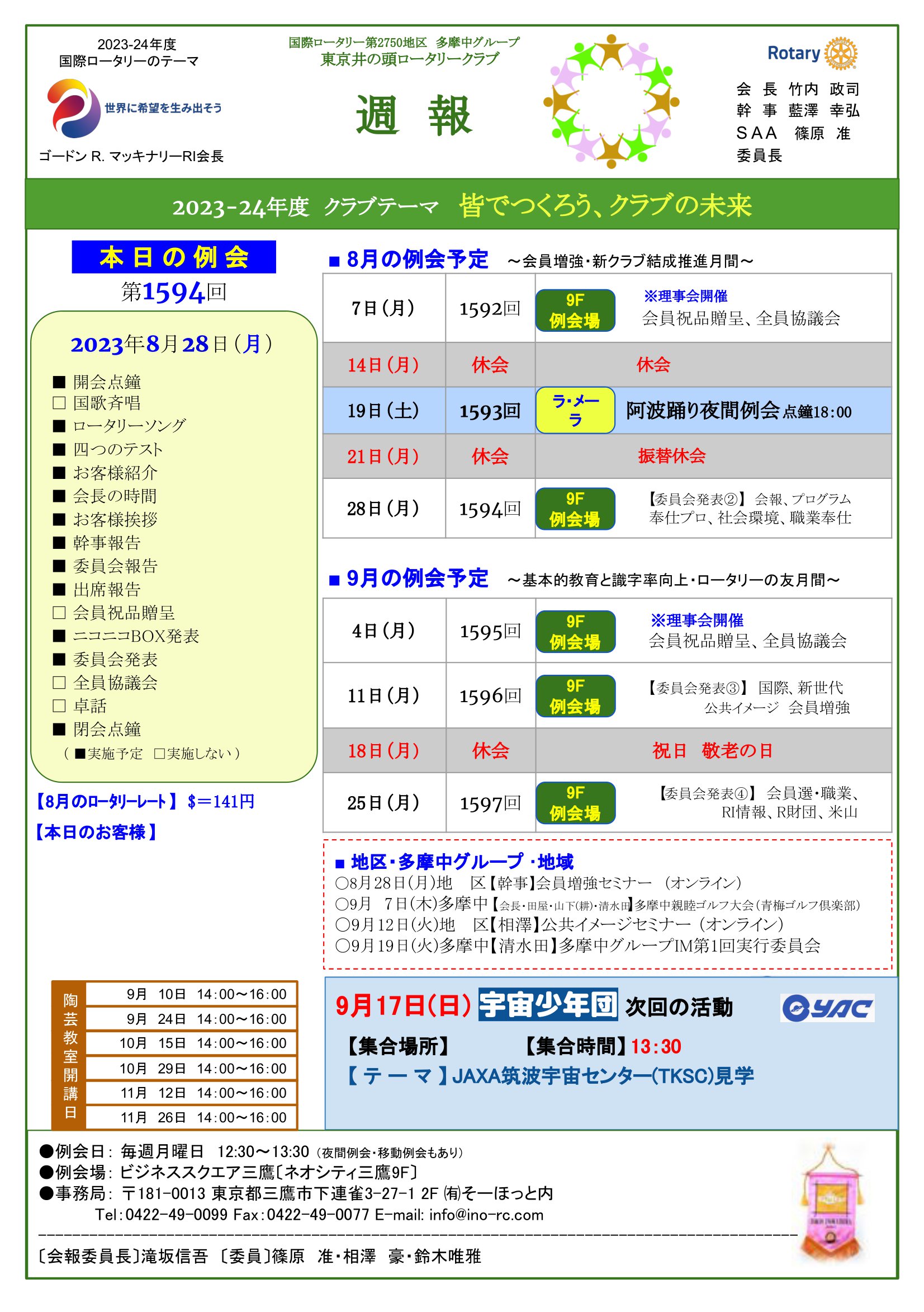 • 2023年8月28日発行(阿波踊り夜間例会報告&日本宇宙少年団 分団サイエンスキッズみたか活動(ペットボトルロケットを作って打上げよう!)) 東京都三鷹市 東京井の頭ロータリークラブ
