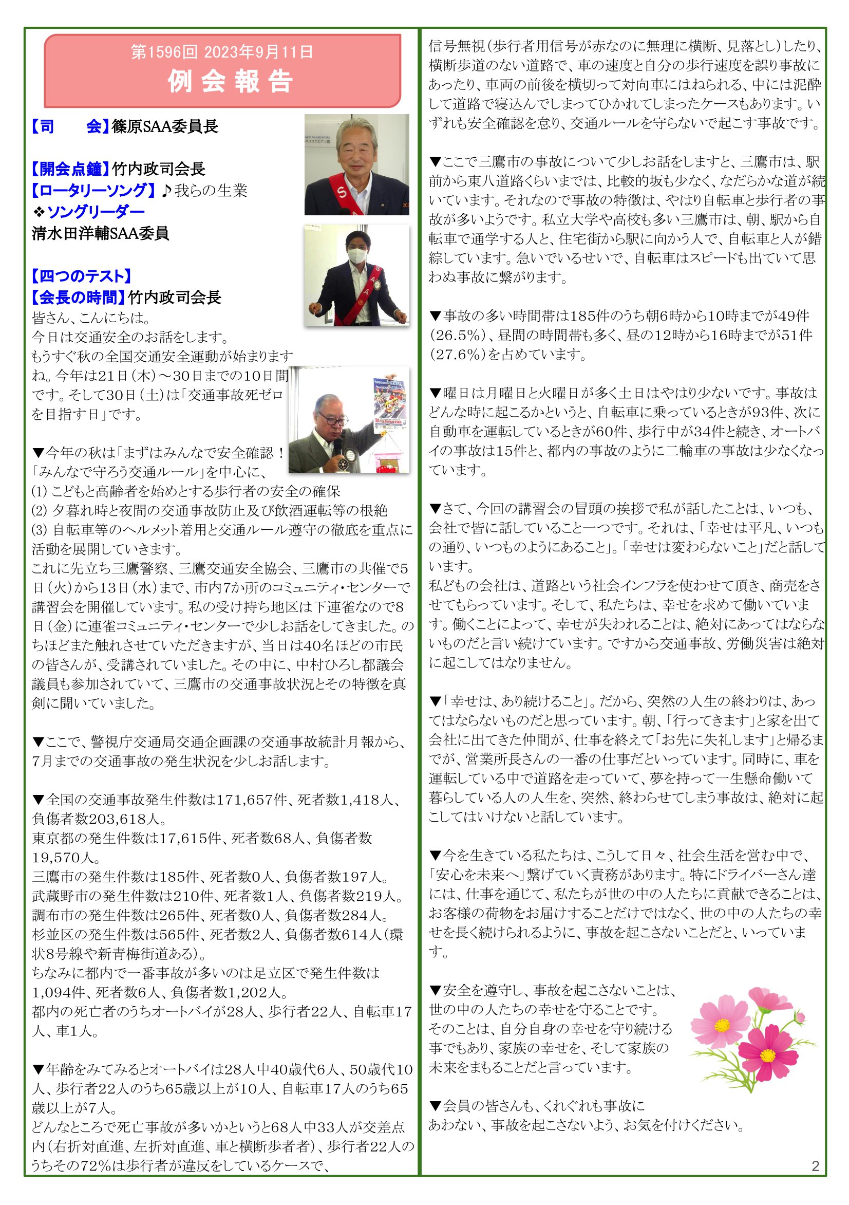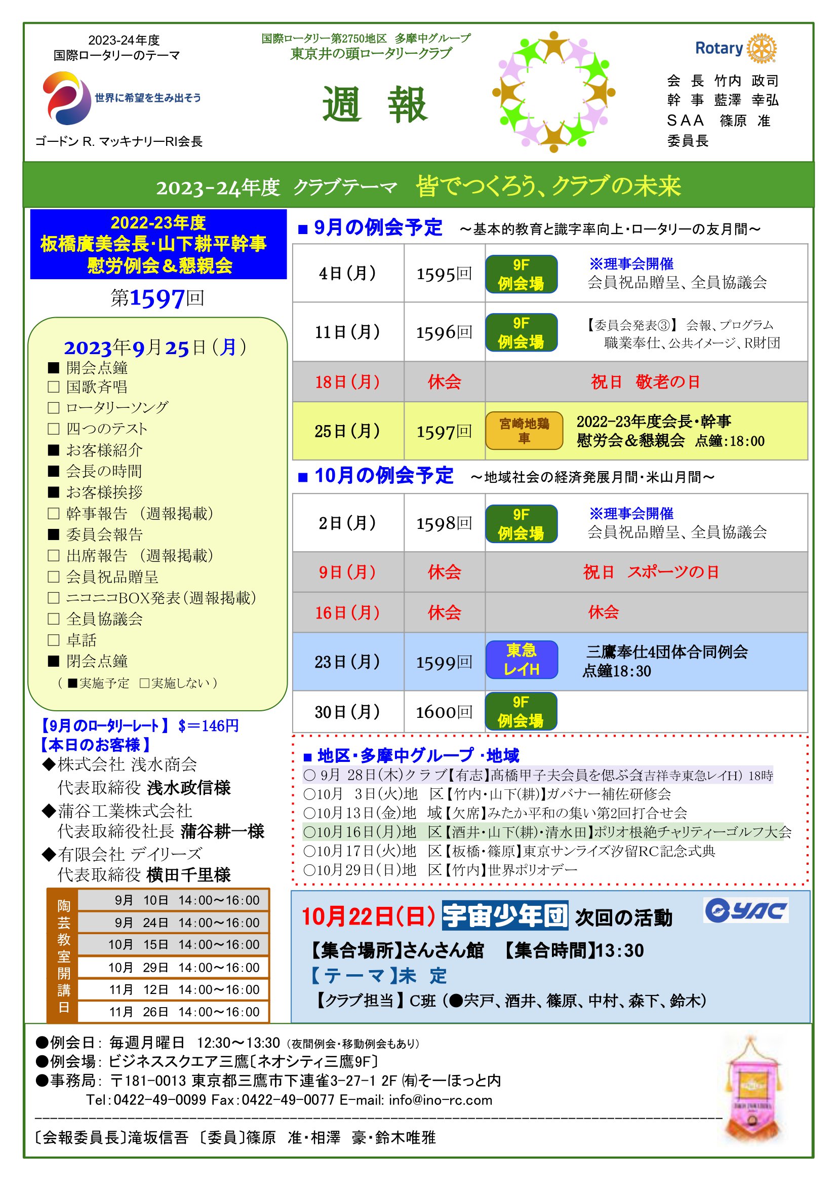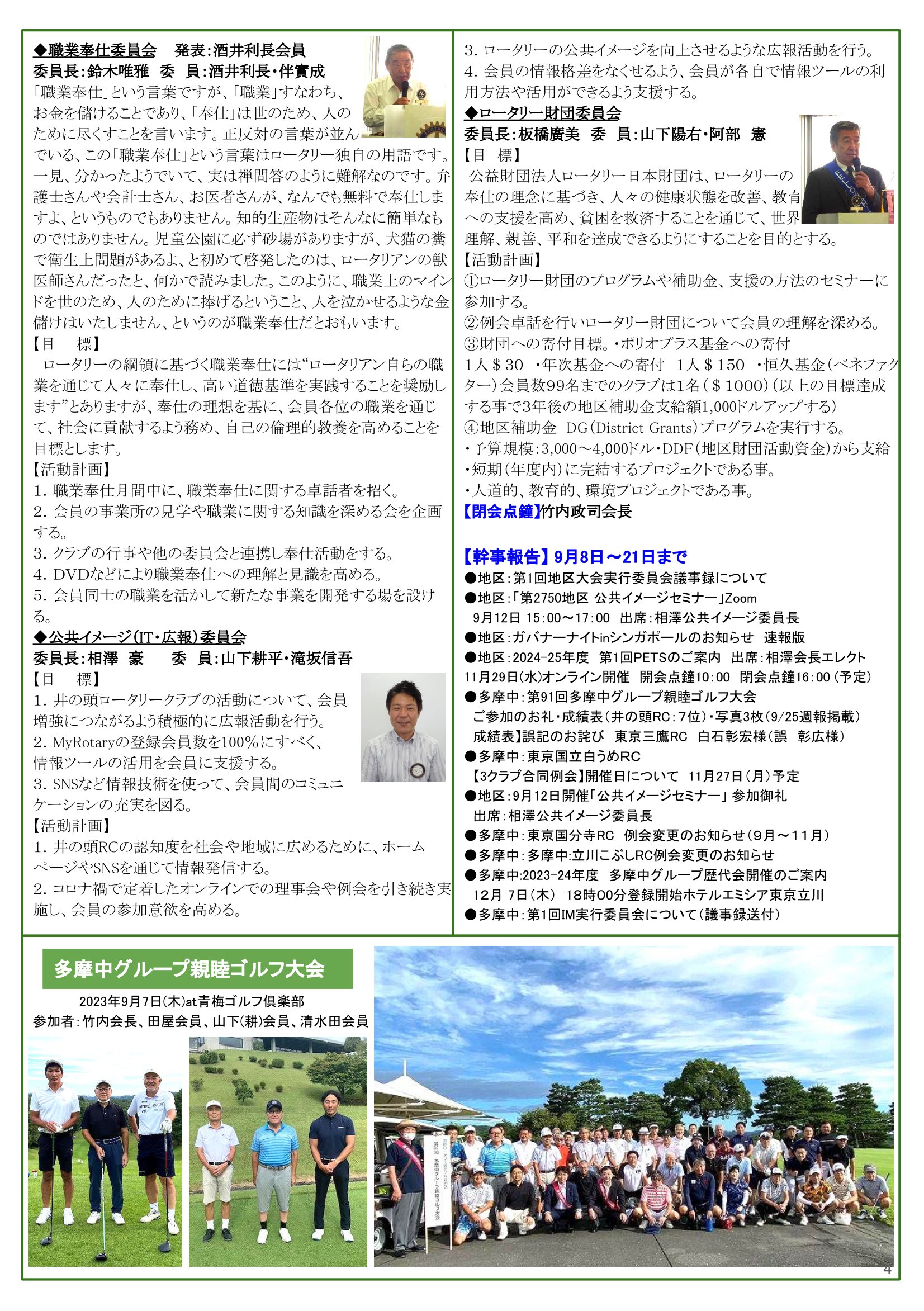 2023年9月25日発行(多摩中グループ親睦ゴルフ大会&日本宇宙少年団 分団サイエンスキッズみたか活動(JAXA筑波宇宙センター(TKSC)見学)) 東京都三鷹市 東京井の頭ロータリークラブ
