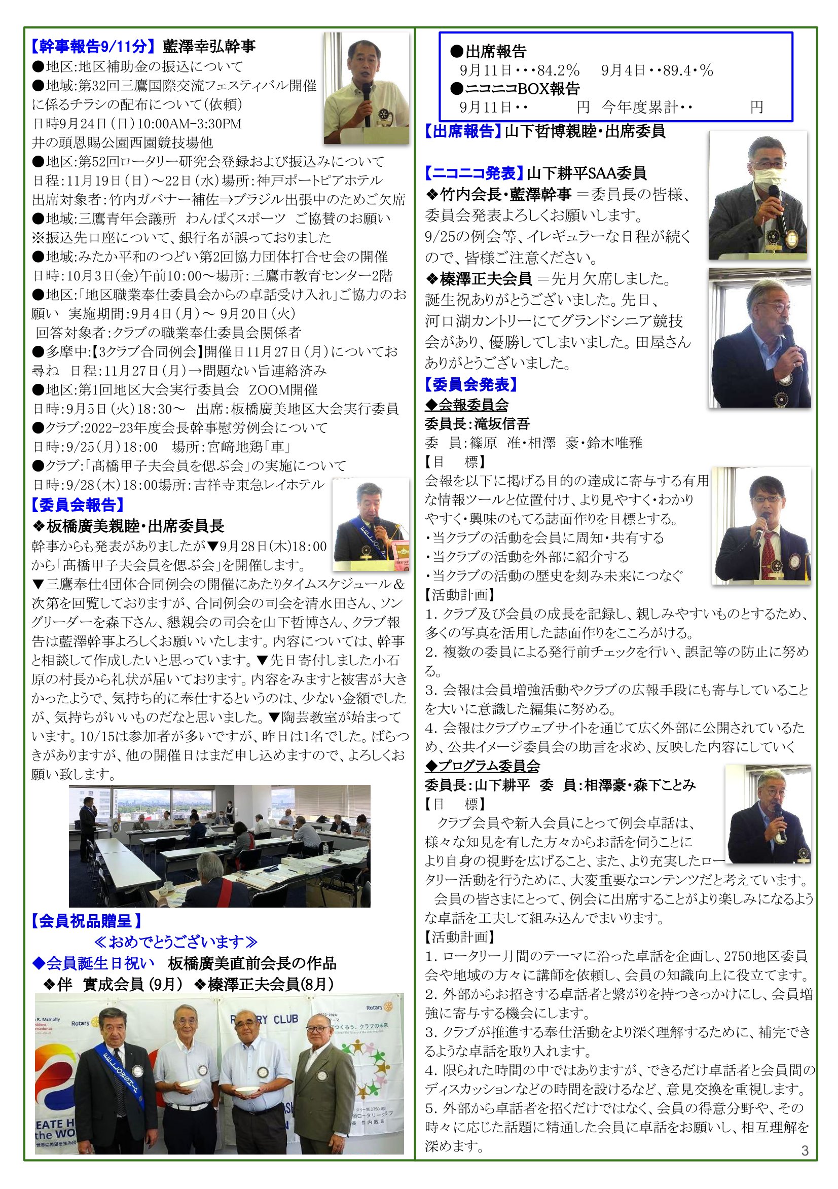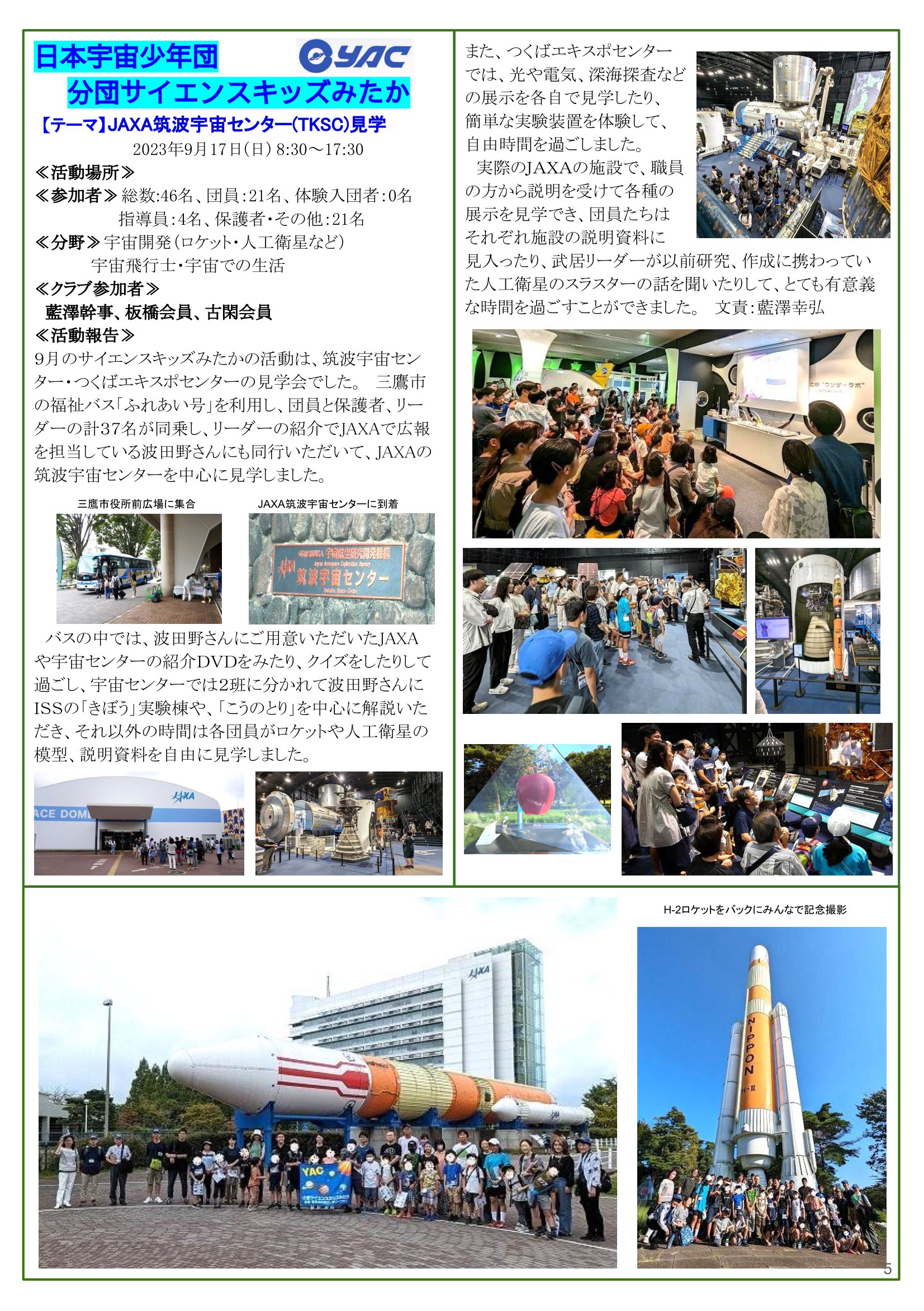 - 2023年9月25日発行(多摩中グループ親睦ゴルフ大会&日本宇宙少年団 分団サイエンスキッズみたか活動(JAXA筑波宇宙センター(TKSC)見学)) 東京都三鷹市 東京井の頭ロータリークラブ