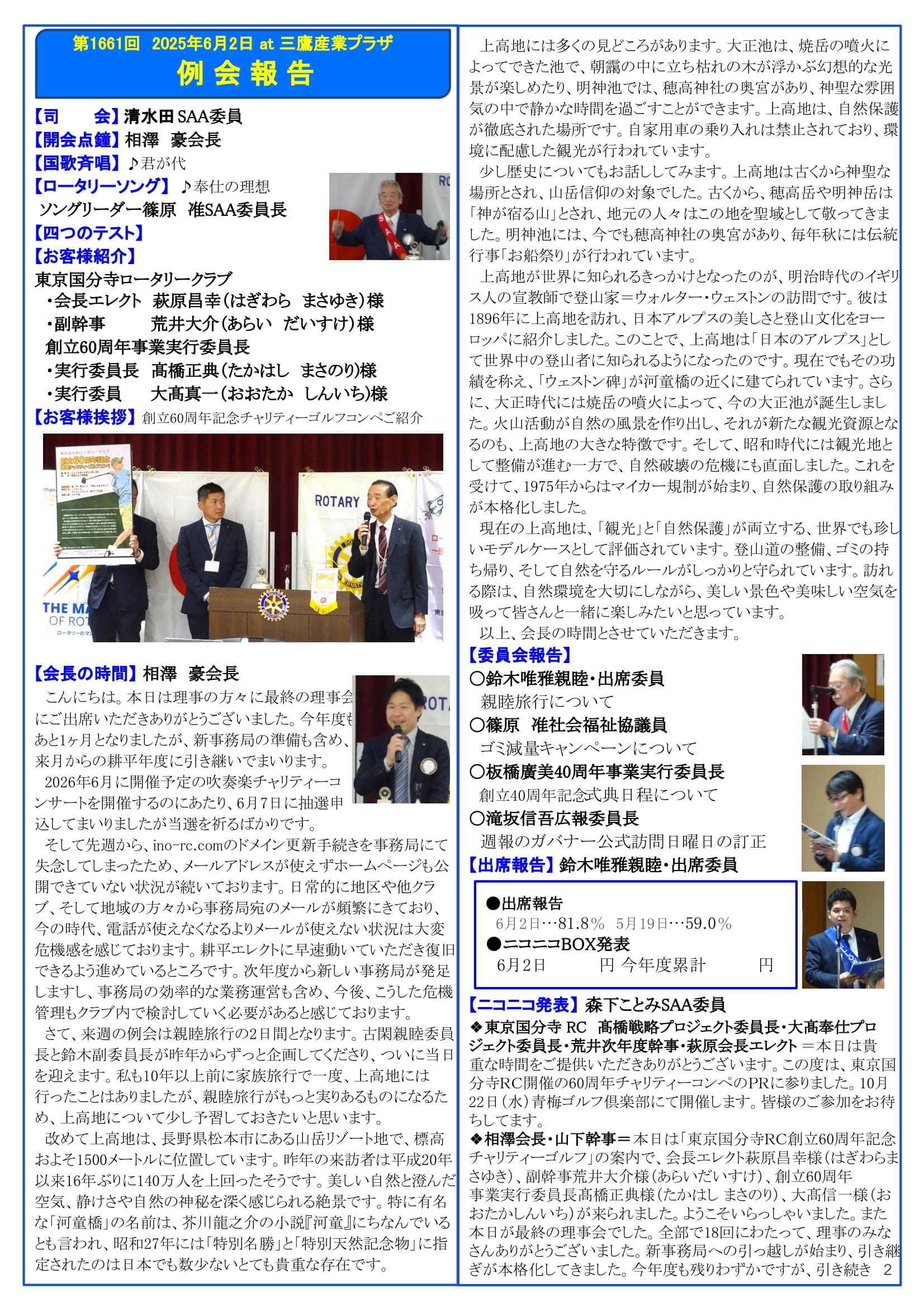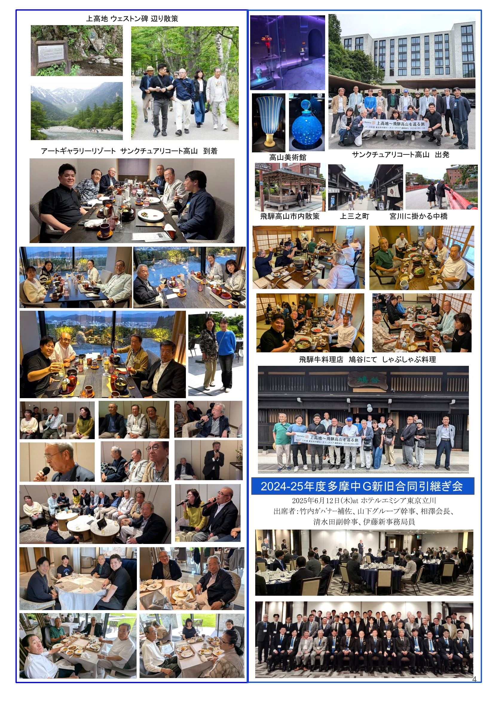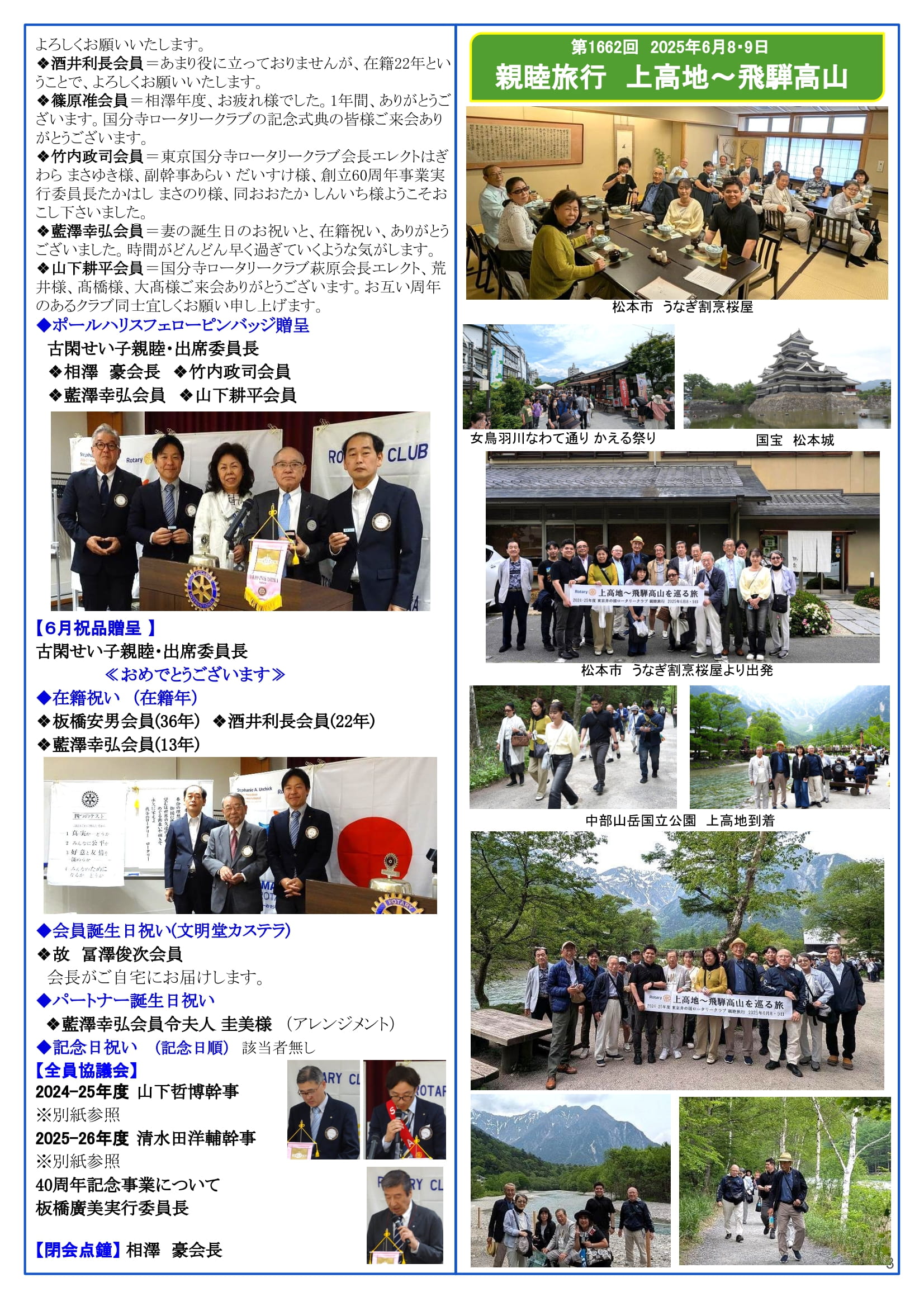 2025年6月23日発行(親睦旅行 上高地~飛騨高山&2024-25年度多摩中G新旧合同引継ぎ会)東京都三鷹市 東京井の頭ロータリークラブ