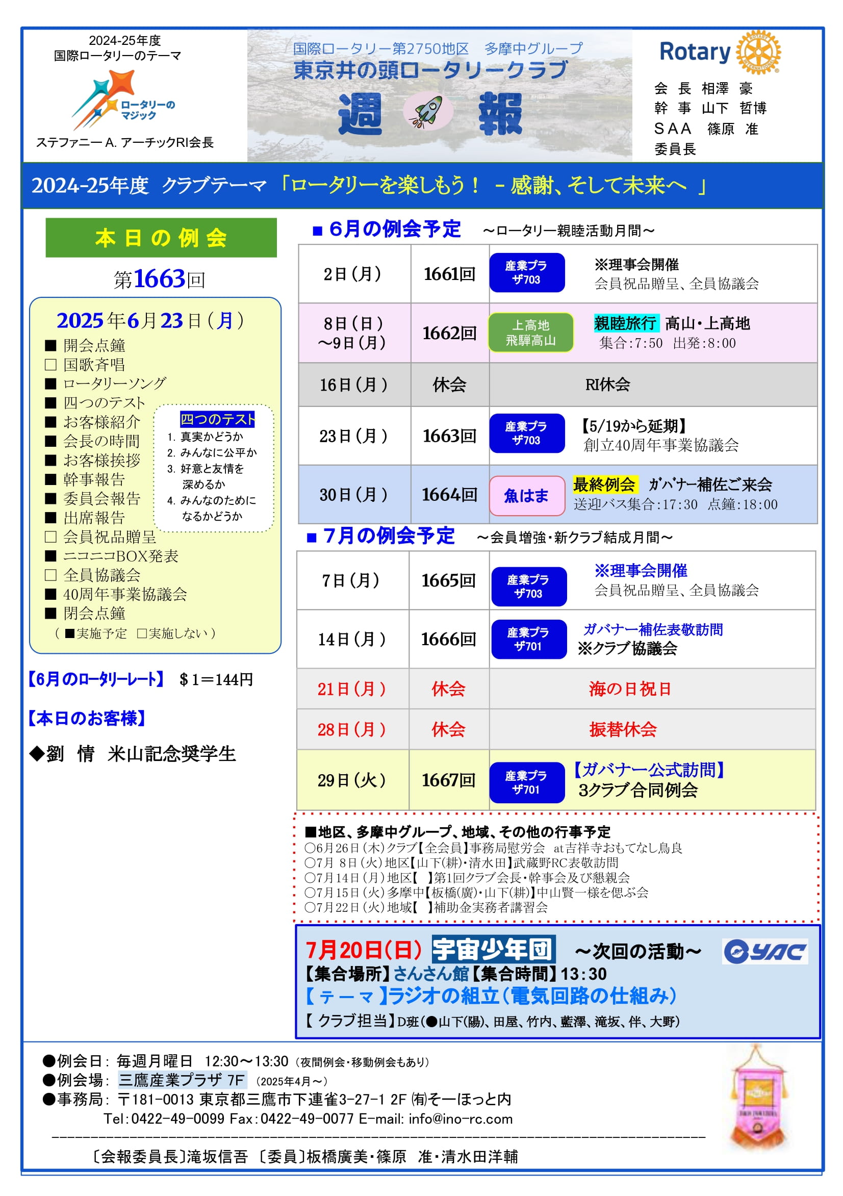 2025年7月7日発行(最終夜間例会報告&日本宇宙少年団 分団サイエンスキッズみたか(お天気教室第6弾、お天気を風で感じよう) )東京都三鷹市 東京井の頭ロータリークラブ