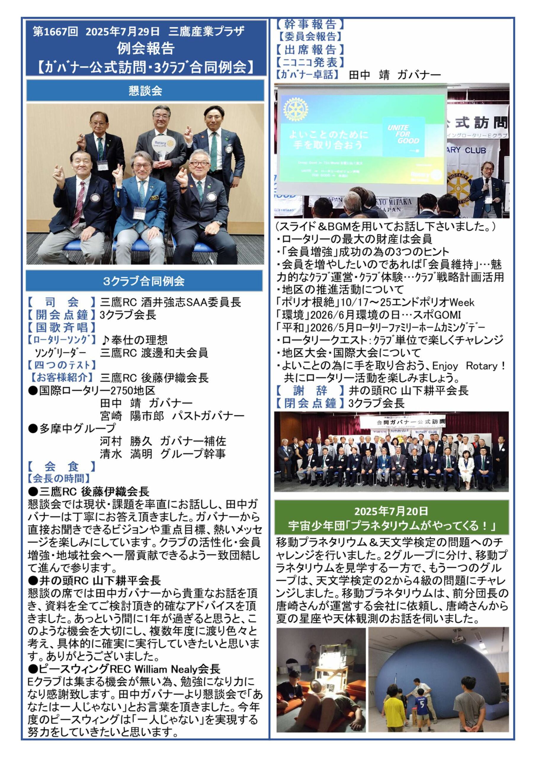 【2025年8月4日発行】2025年7月29日 第1667回例会 ガバナー公式訪問、3クラブ合同例会/宇宙少年団