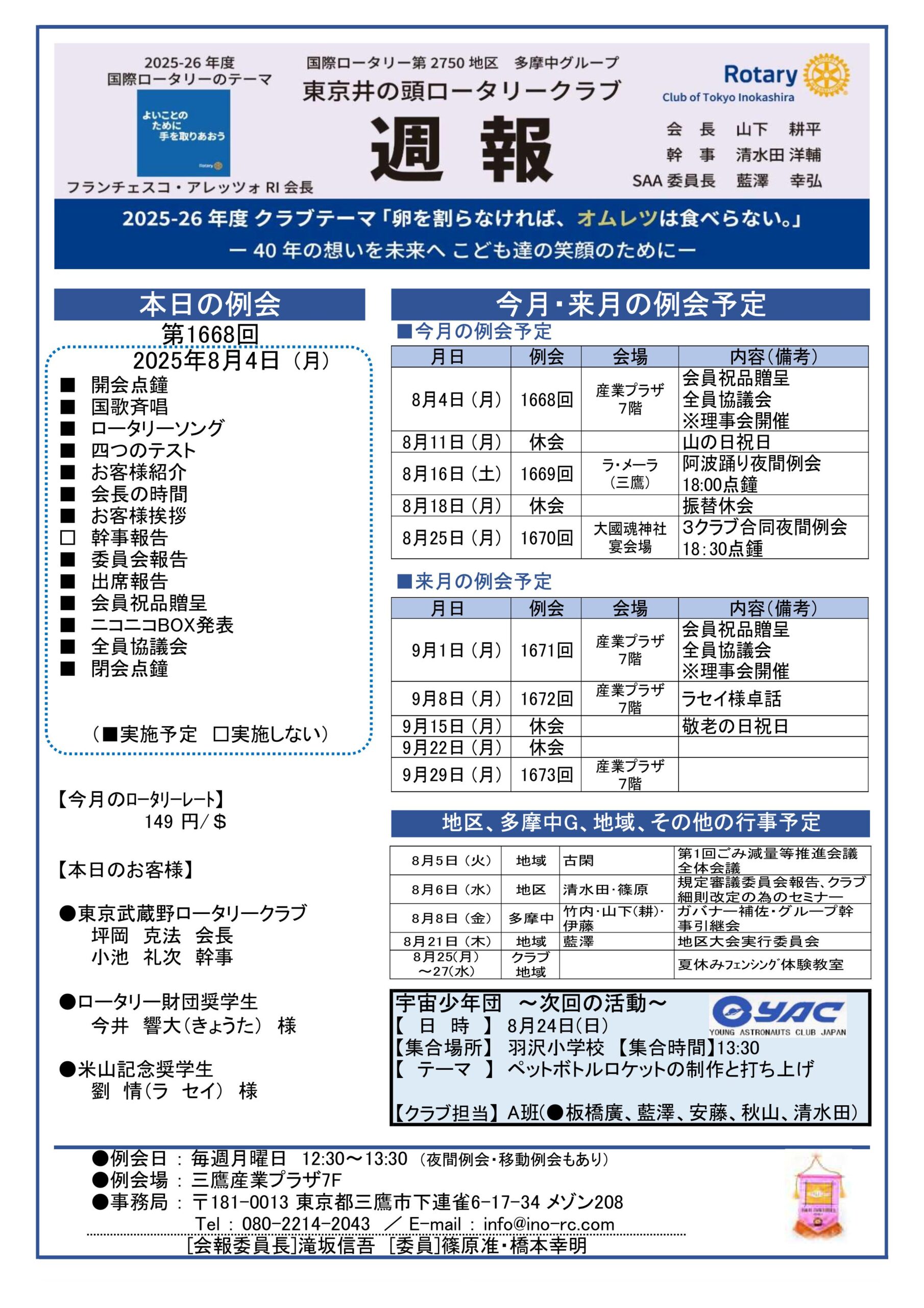 【2025年8月16日発行】2025年8月4日 第1668回例会 卓話:今井響大様