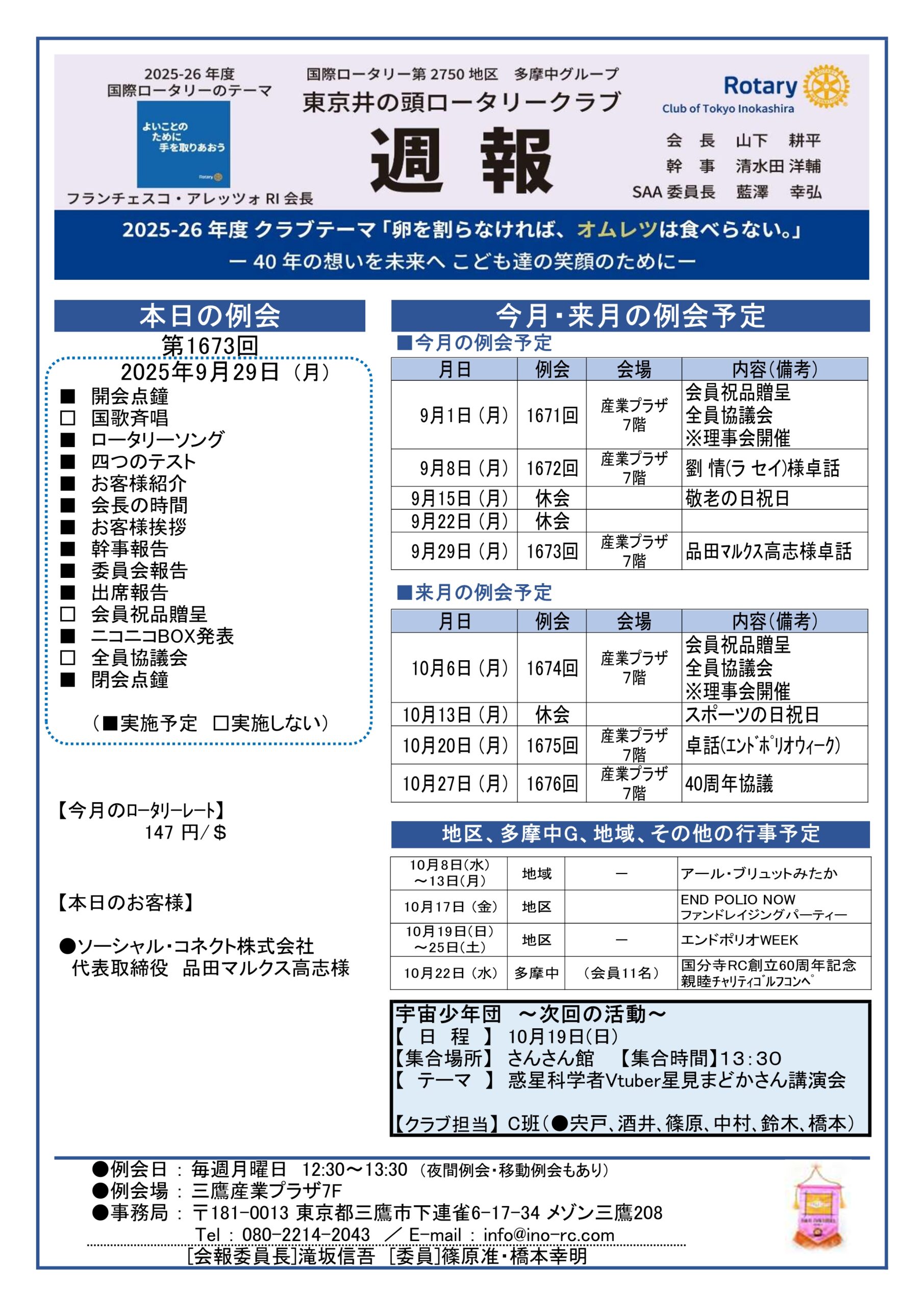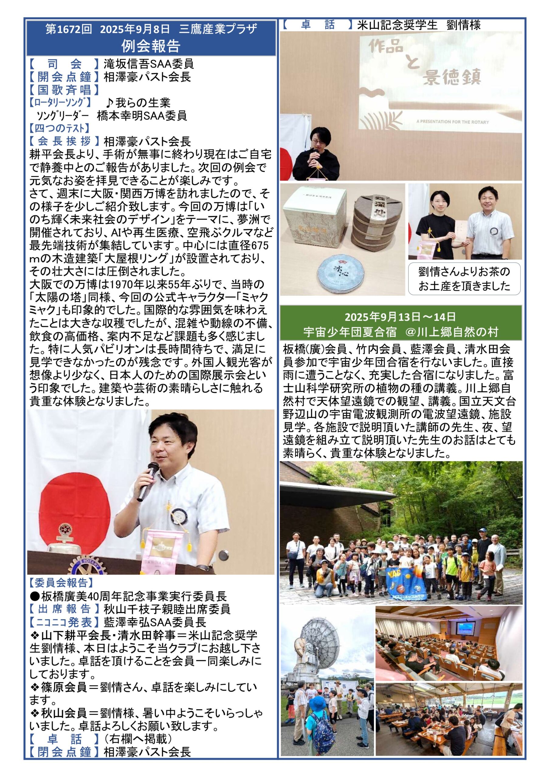 • 【2025年9月29日発行】2025年9月8日 第1672回例会 卓話:劉情様/宇宙少年団夏合宿